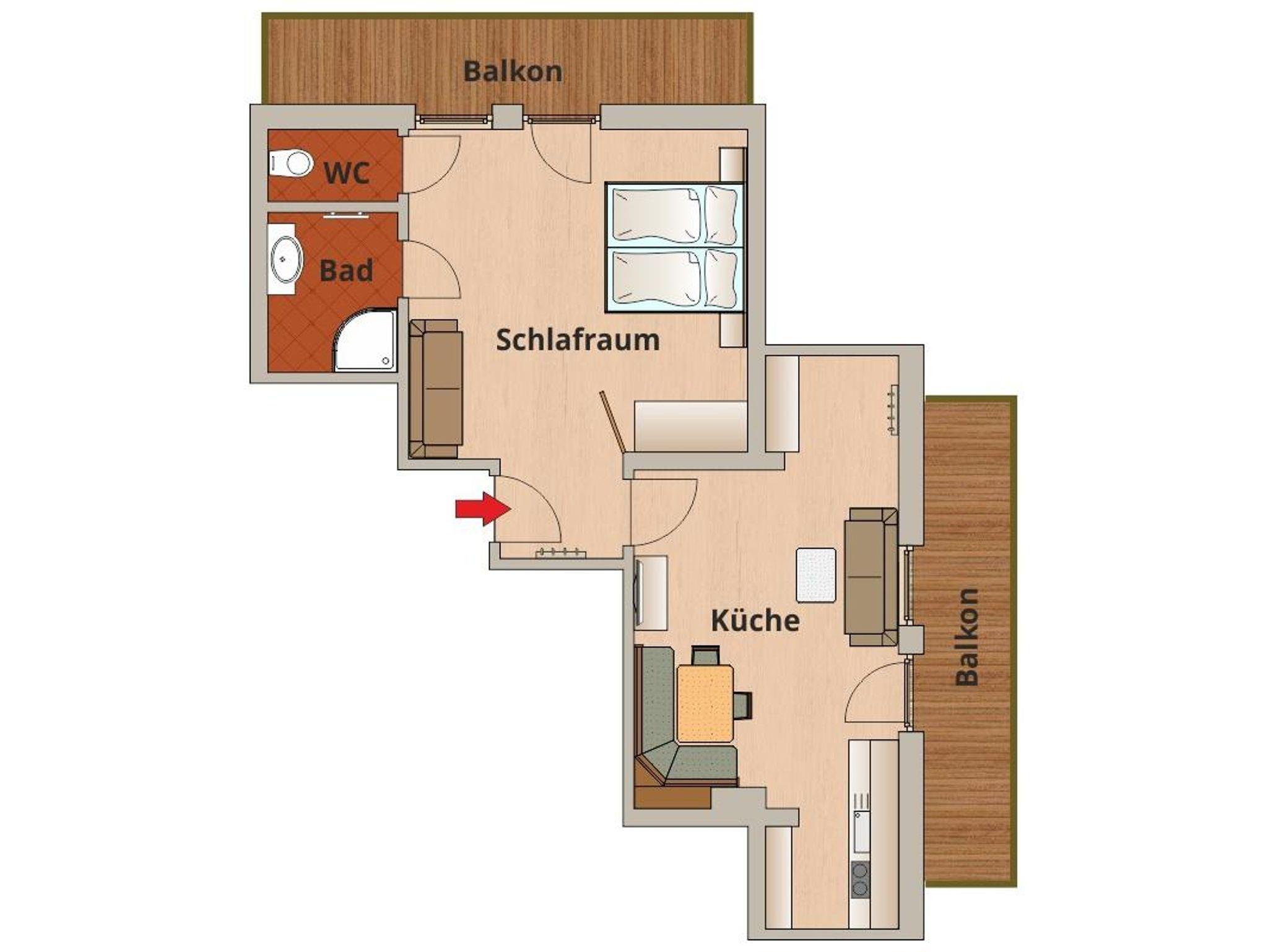Dieses Appartement ist ca. 60 m² groß und für 2 Personen optimal. Es besteht aus einem Vorraum, einer Wohnküche mit Esstisch und einem Schlafzimmer mit Doppelbett.