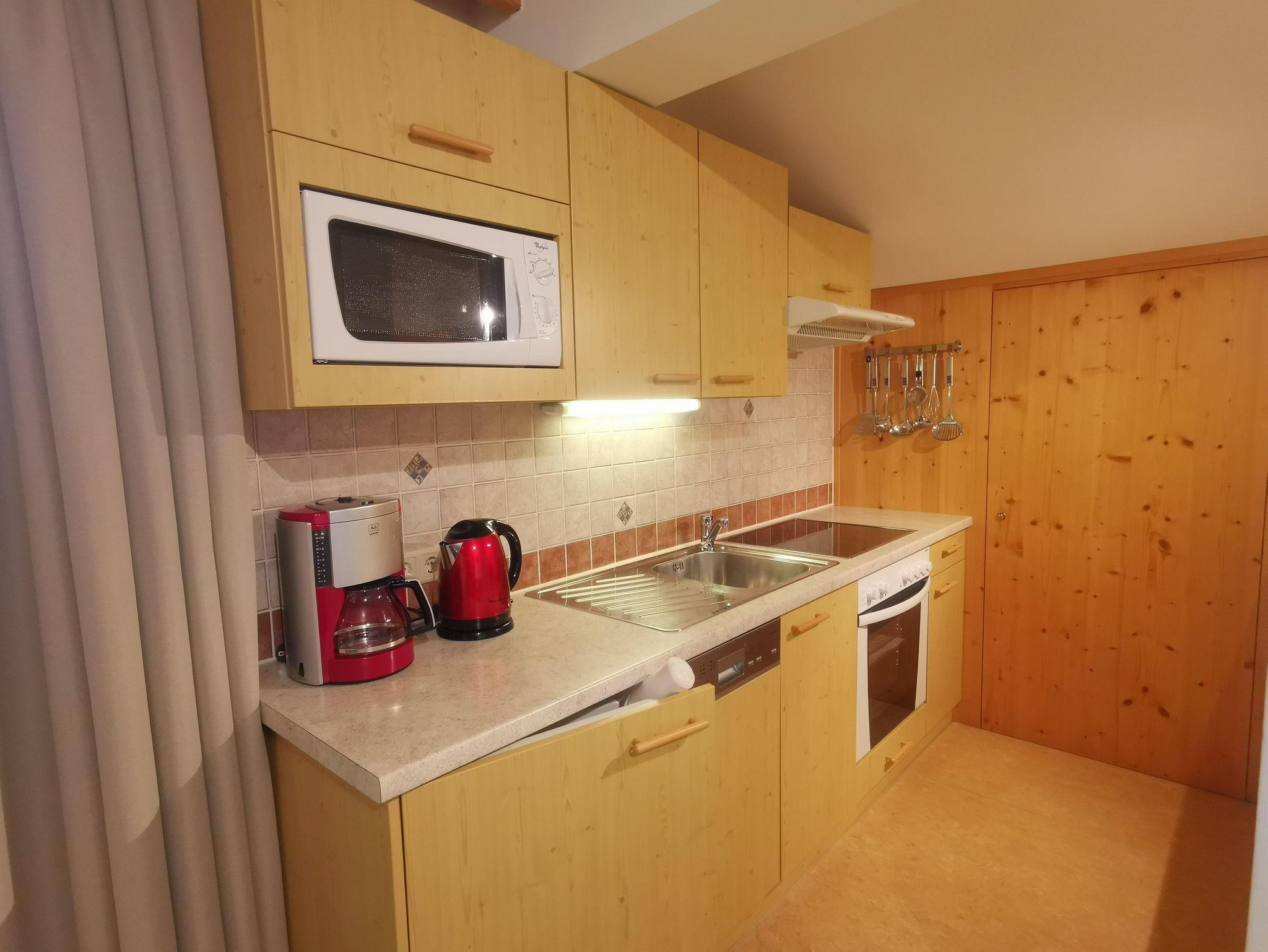 Die Küche ist ausgestattet mit E-Herd, Backrohr, Mikrowelle, Kühlschrank mit Eisfach und Geschirrspüler.