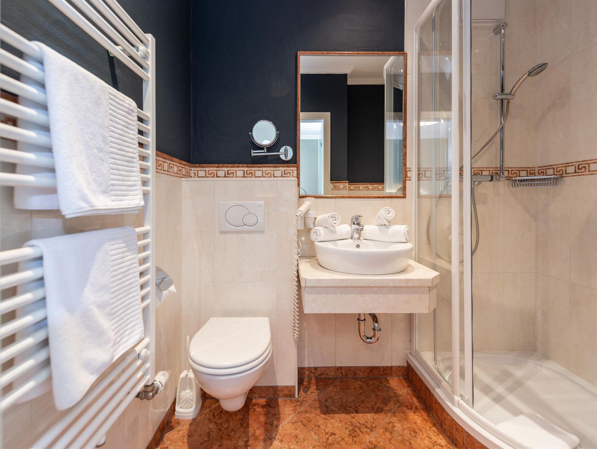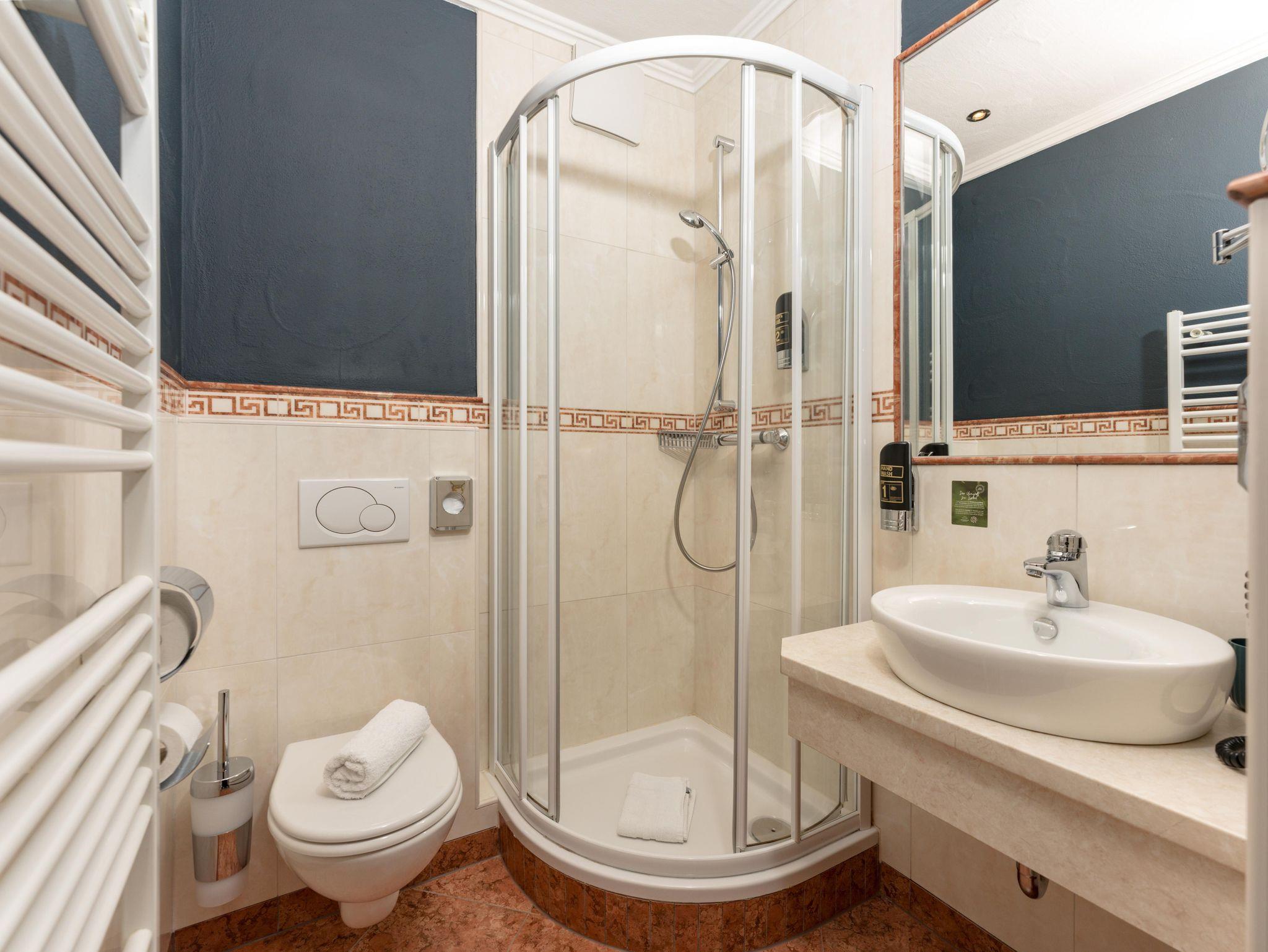 Badezimmer mit Dusche/WC, Haarföhn, Schminkspiegel & Handtuchtrockner