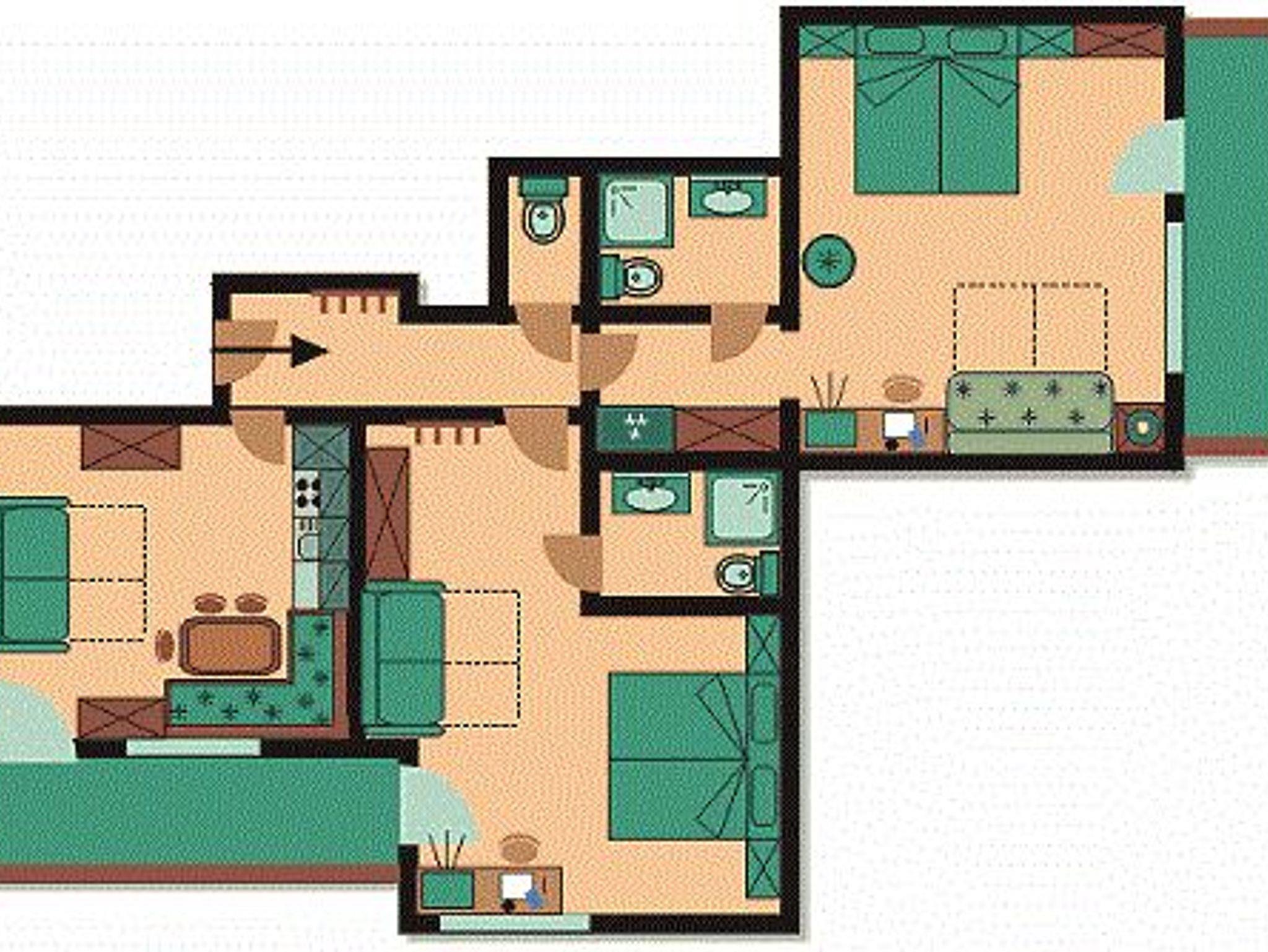 Appartement Bergkönig! Sehr geräumiges und gut ausgestattetes Appartement mit Vorraum, Küche, zwei Schlafräumen (jeweils mit Dusche/WC) und Balkon.