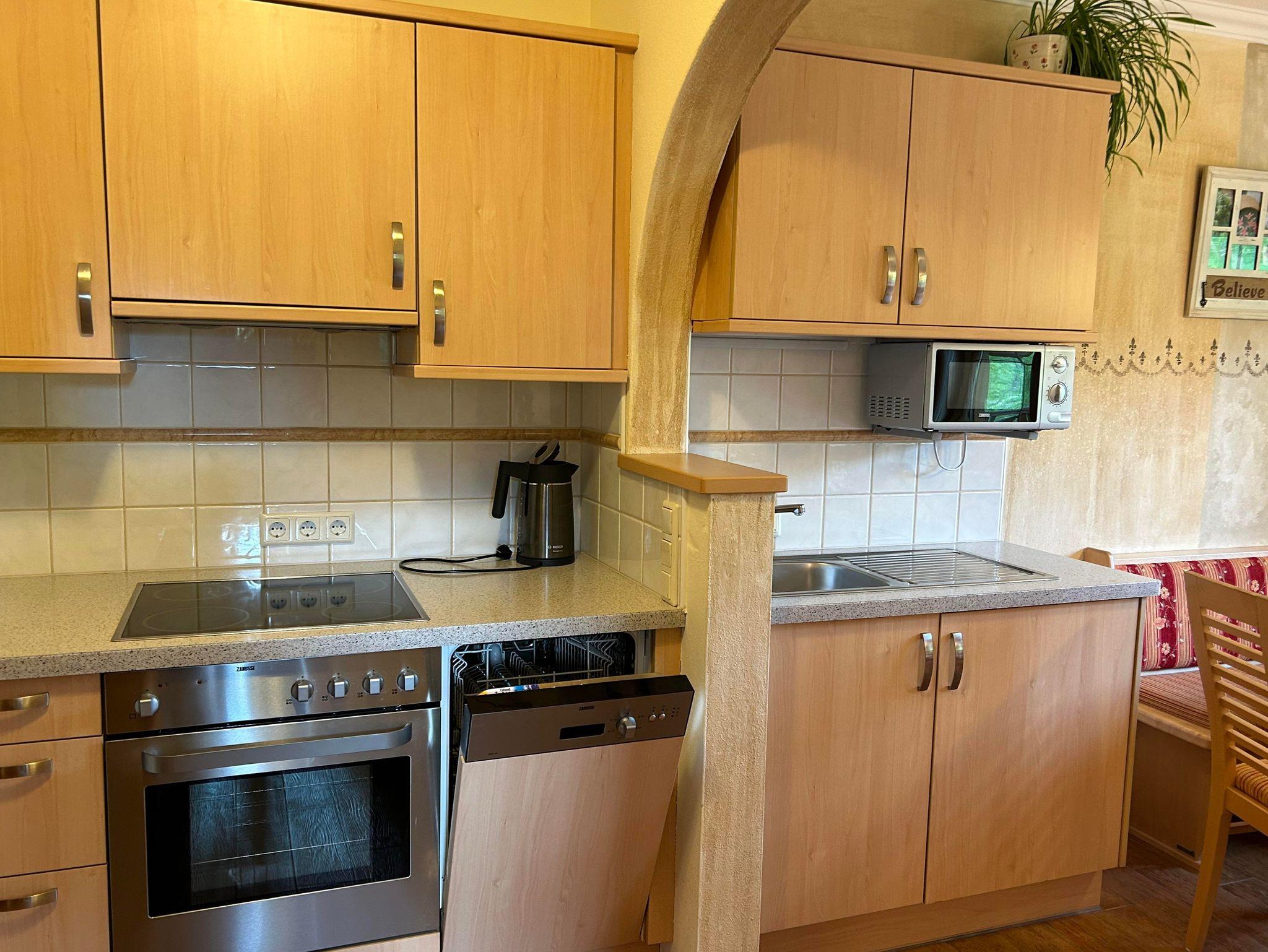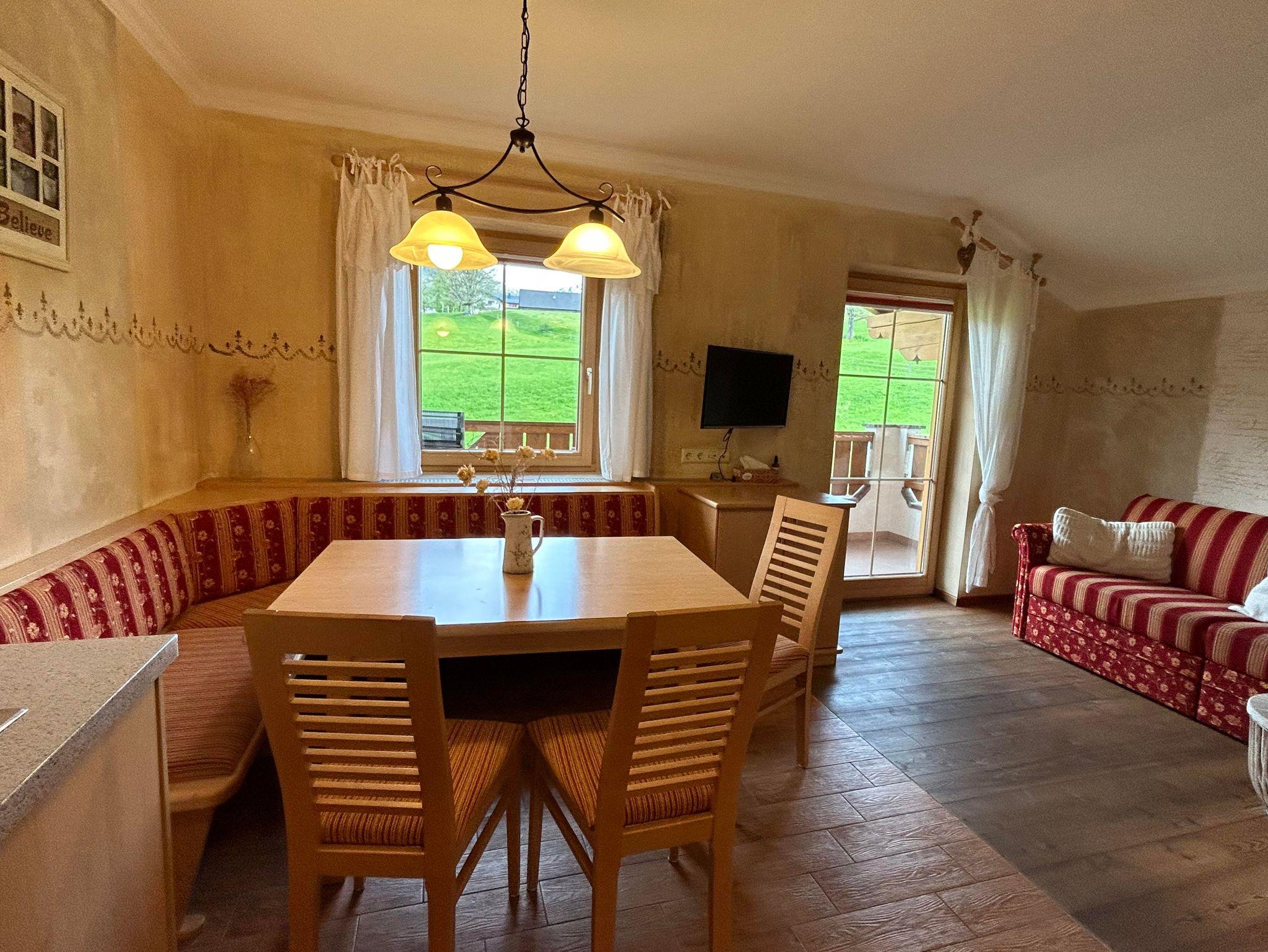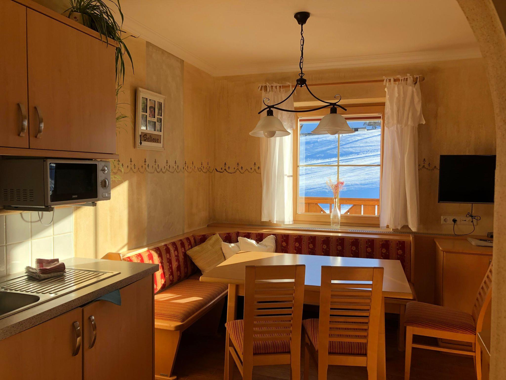 Gemütliches Appartement mit 2 Schlafräumen , voll eingerichtete Wohnküche mit Sonnenterasse , 2 Badezimmer und separate Toilette. Die voll ausgestattet Küche verfügt über Backofen, Mikrowelle, Geschirrspüler, Kühlschrank mit Eisfach, Espressomaschine, Wasserkocher und ausreichend Geschirr und Besteck. Für Bettwäsche, Handtücher ,Geschirrtücher sowie Saunatücher ist natürlich gesorgt. Diese Wohnung verfügt über Balkon und Terrasse mit Blick auf unserer wunderschöne Bergwelt. Das Appartement befindet sich auf der 1. Etage. Unser Haus befindet sich direkt an der Skipiste in sonniger ruhiger und doch zentraler Lage!