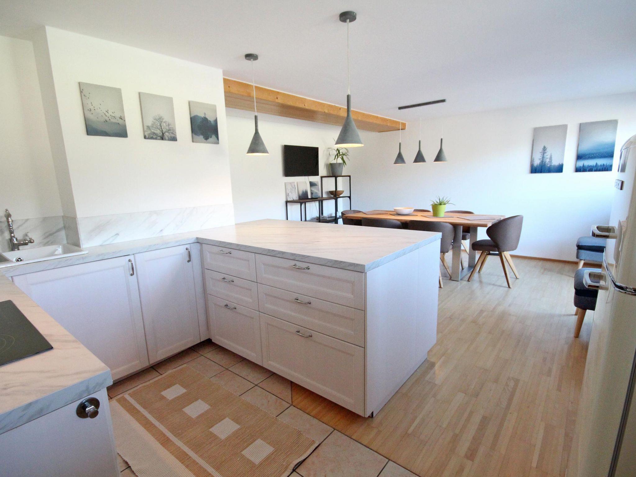 -Großzügige und voll ausgestattete Wohnküche mit 4-Plattenherd, Kaffeemaschine, Wasserkocher, Toaster, Geschirrspüler, Dunstabzug, Kühlschrank mit Gefrierfach, Esstisch für 8 Personen, 2 Lounge Stühle und TV. Von der Wohnküche hat man ebenso Zugang ins Freie.