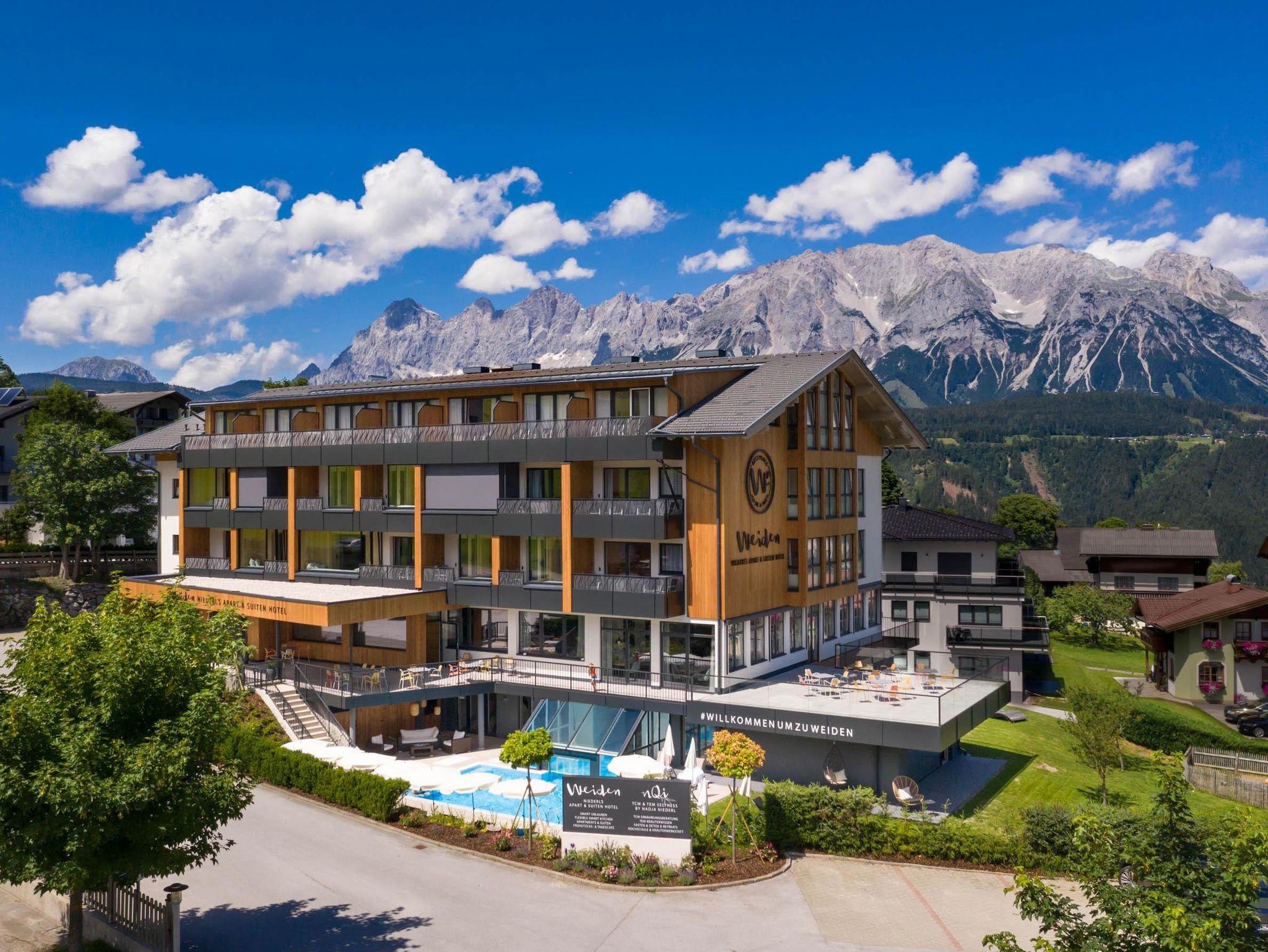 Das Hotel WEIDEN mit Wohnzimmerfeeling und innovativem Konzept hat erstklassige Lage am Hochplateau Rohrmoos oberhalb von Schladming. Im Skiurlaub direkt neben der Skipiste, im Sommerurlaub mitten in der Wanderregion Schladming Dachstein.