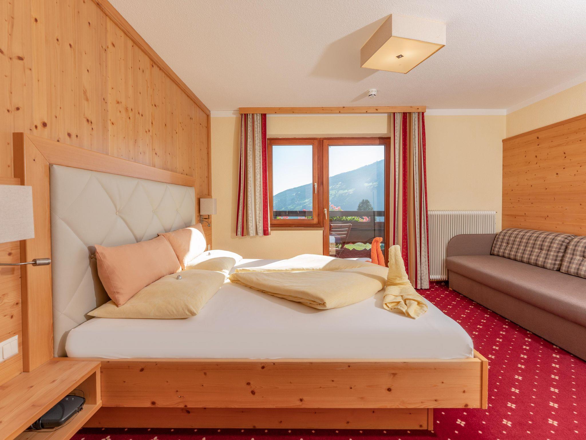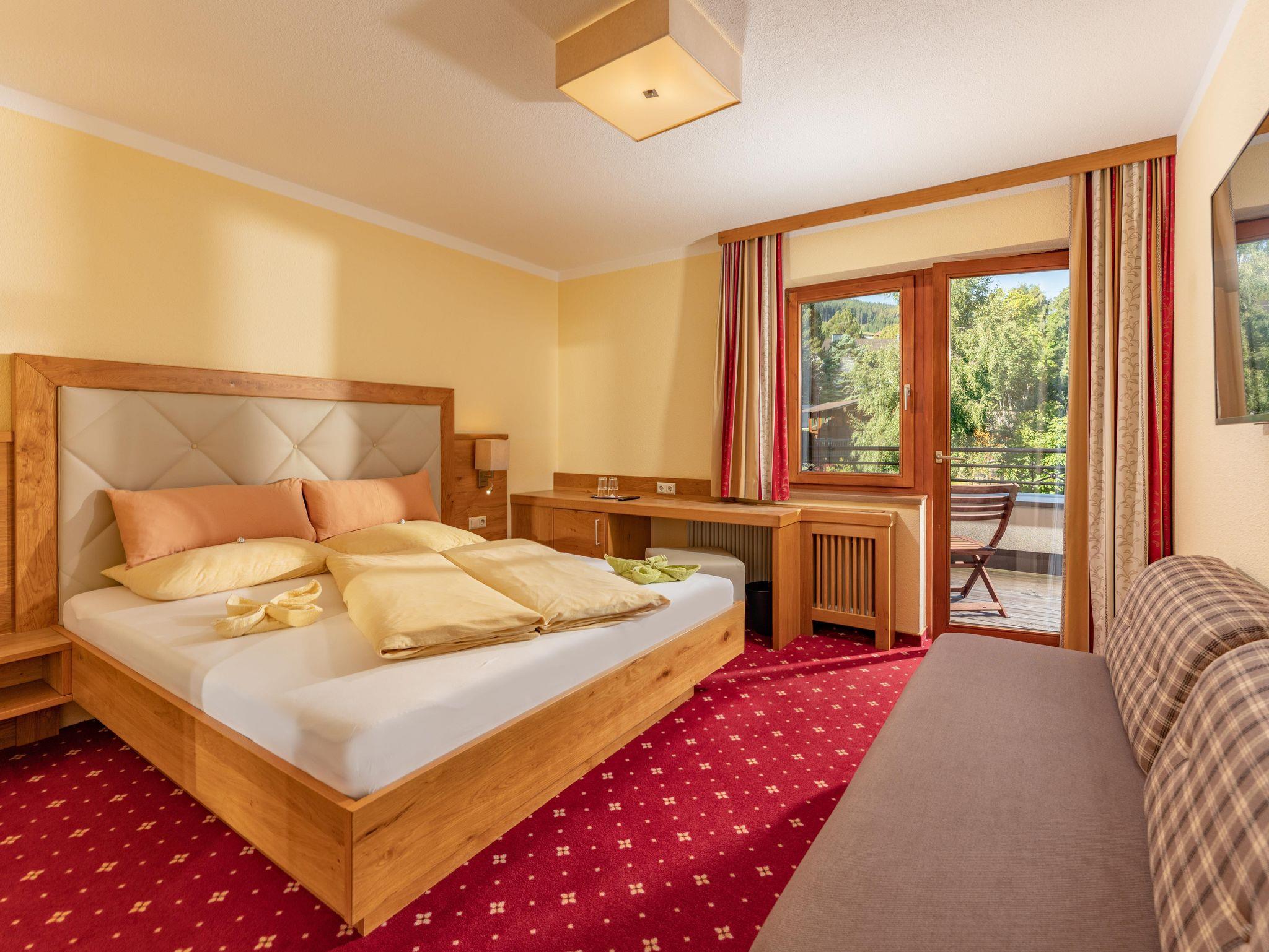 Ländlich eingerichtete Doppelzimmer mit Dusche/WC, Balkon, Kühlschrank, Zimmersafe, Kabel-TV, Fön und Radio.