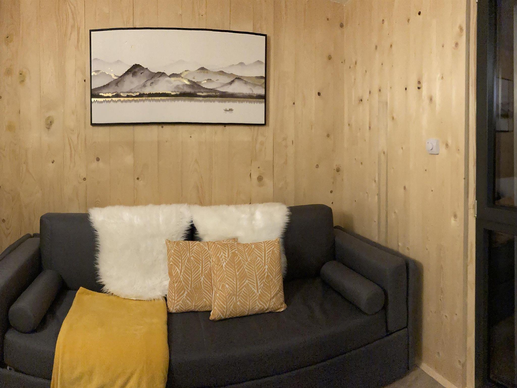 • Wohnzimmer mit stylischem Designersofa aus Italien - aus diesem Sofa lässt sich mit 2 Handgriffen ein Stockbett zaubern; das Wohnzimmer kann mit einer Schiebewand von der Wohnküche getrennt werden (2. Schlafzimmer)