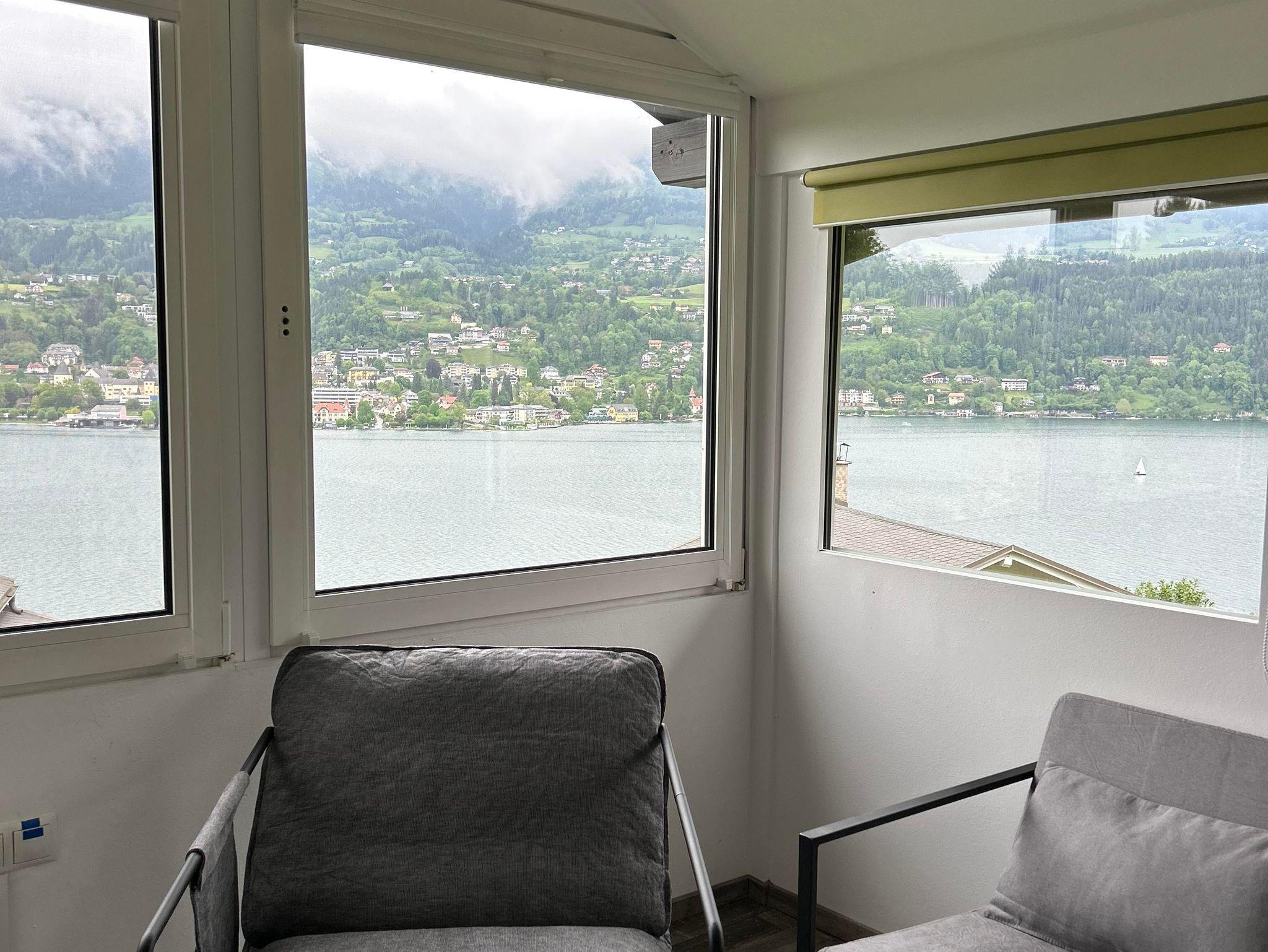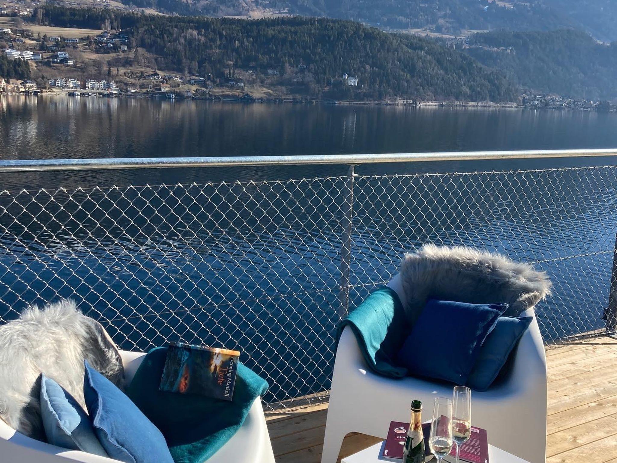 • Riesige Fensterfront mit direktem Blick auf den See und Millstatt mit Esstisch und gemütlichen Sesseln
