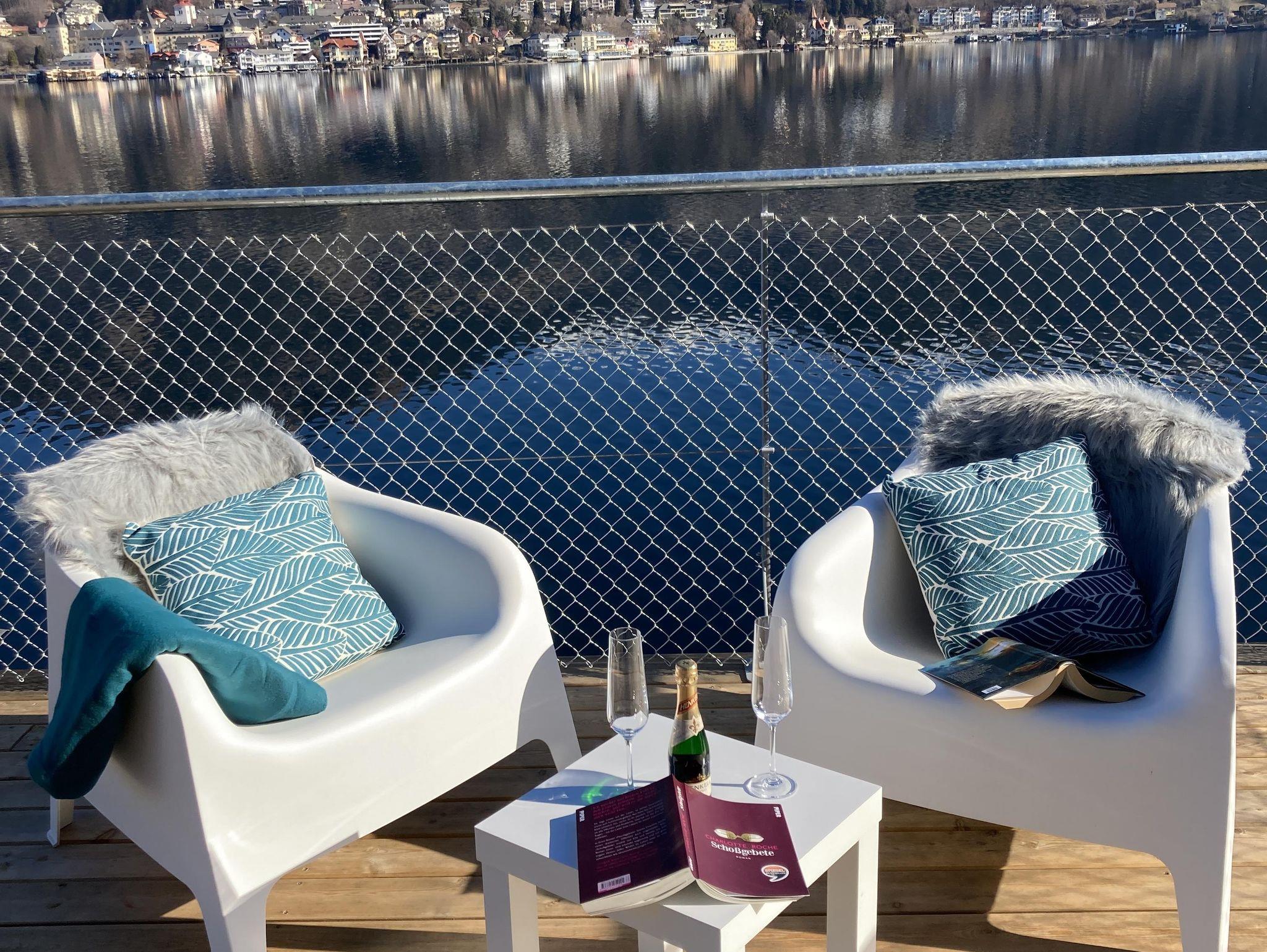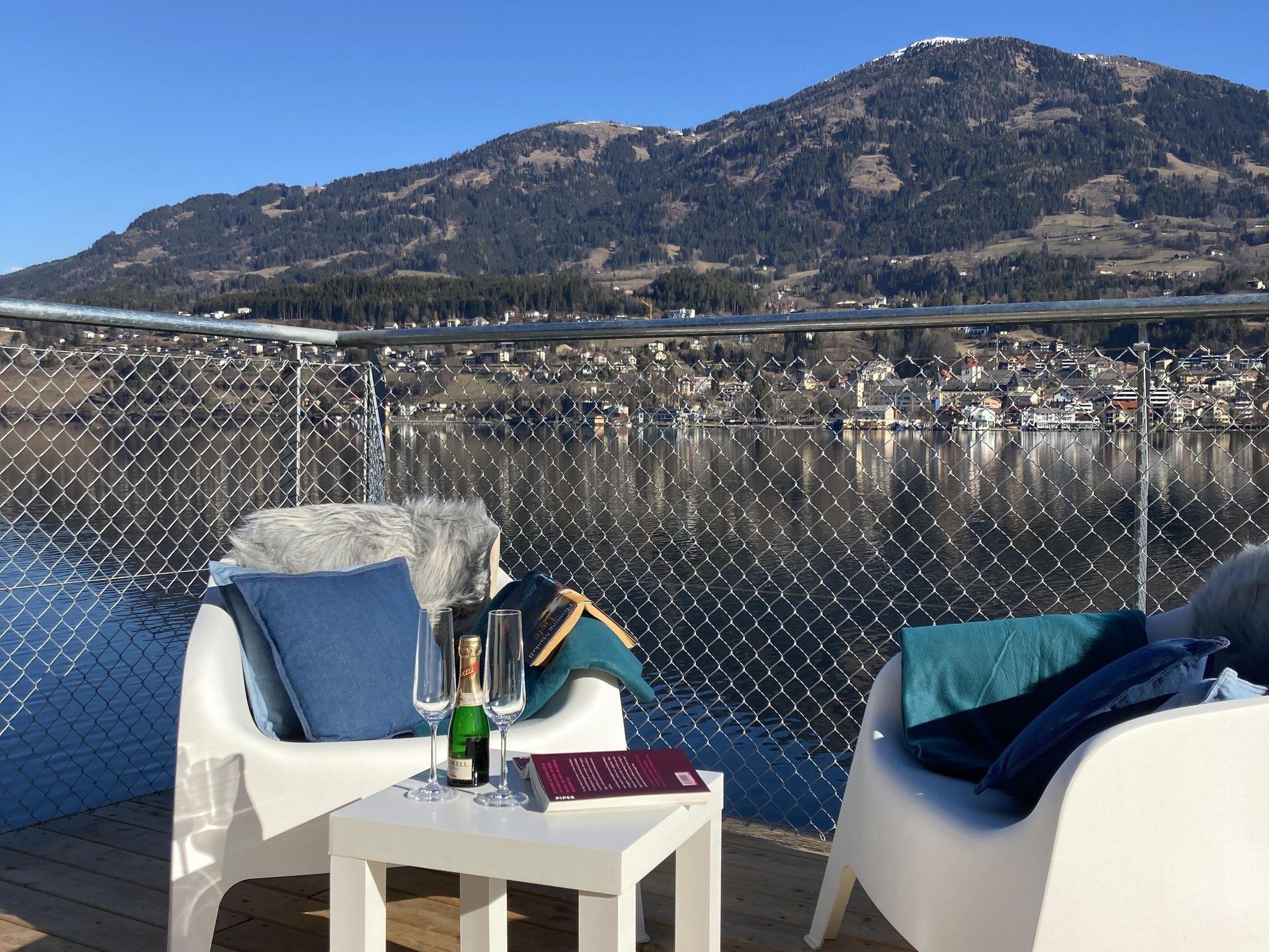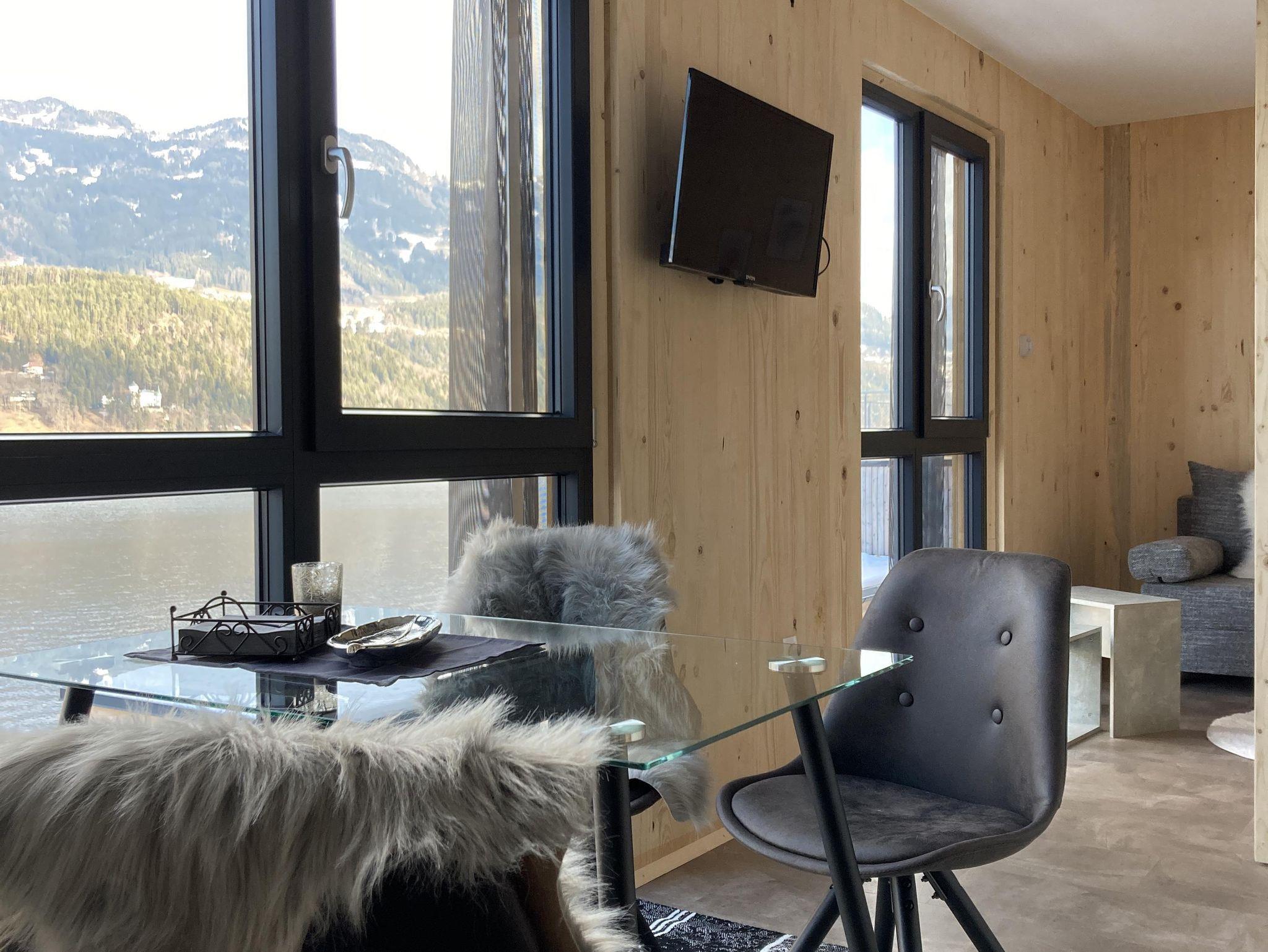 • Riesige Fensterfront mit direktem Blick auf den See und Millstatt - Esstisch mit gemütlichen Sesseln