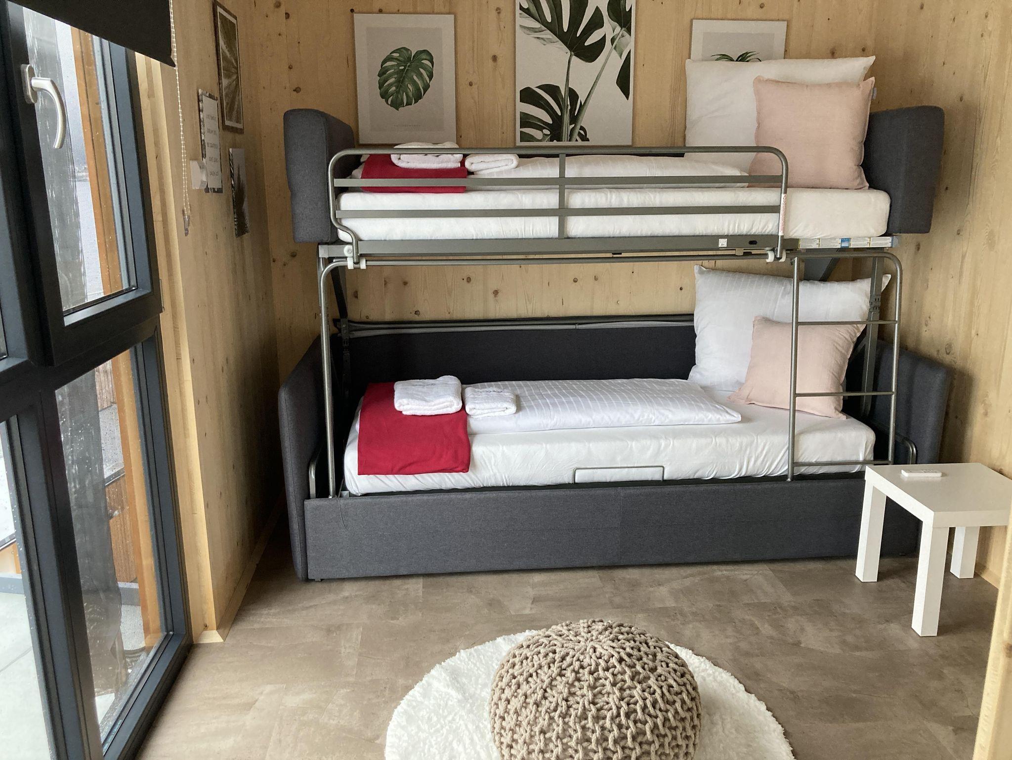 • Wohnzimmer mit stylischem Designersofa aus Italien - aus diesem Sofa lässt sich mit 2 Handgriffen ein Stockbett zaubern; das Wohnzimmer kann mit einer Schiebewand von der Wohnküche getrennt werden (2. Schlafzimmer)