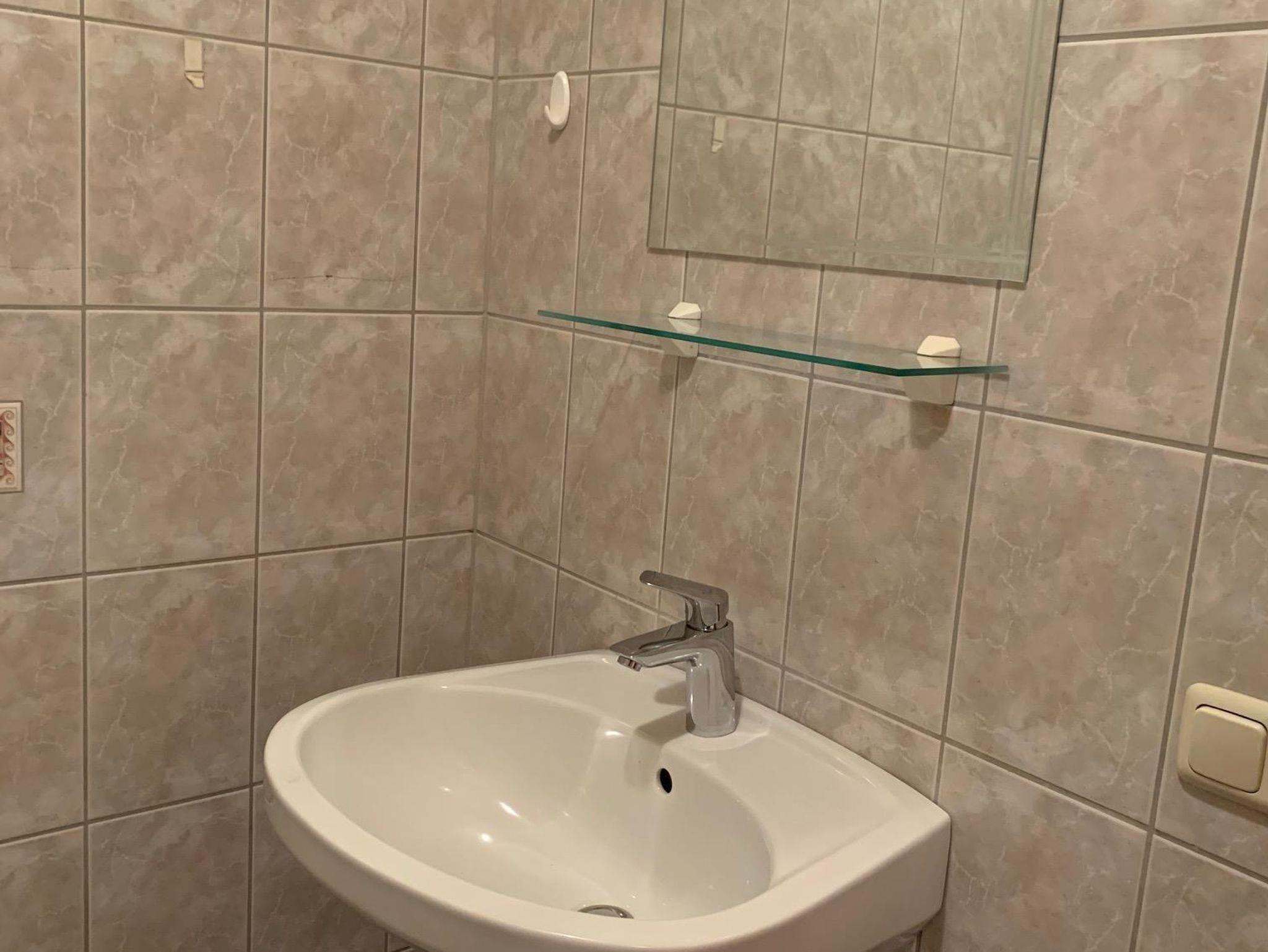 Die Garconniere hat einen Vorraum inkl. kleiner Küche, Badezimmer und einen Schlafzimmer mit einer Couch inkl TV und einem Balkon.