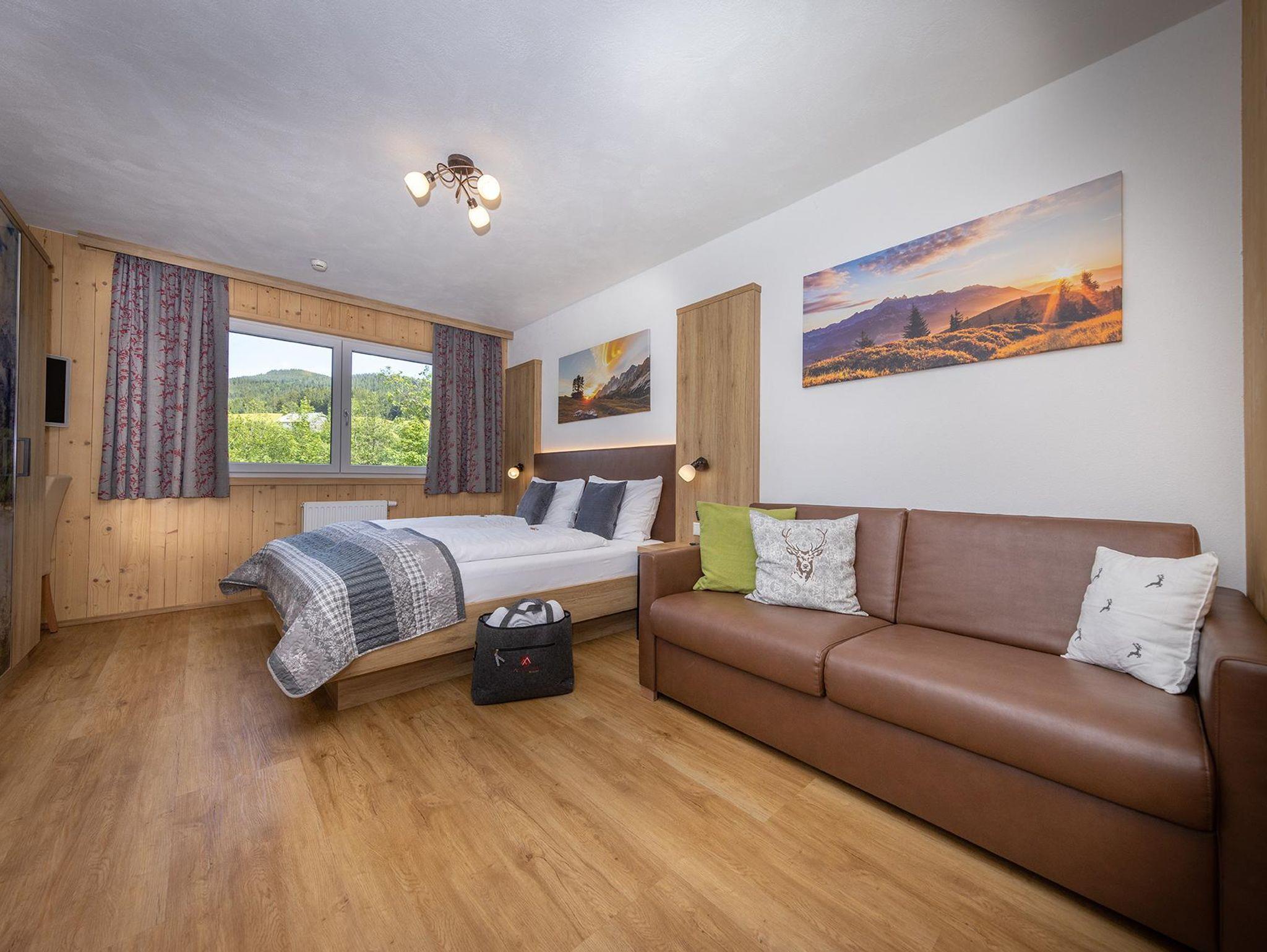 - einen gemütlichen Wohnbereich mit Couch oder Schlafsofa, TV