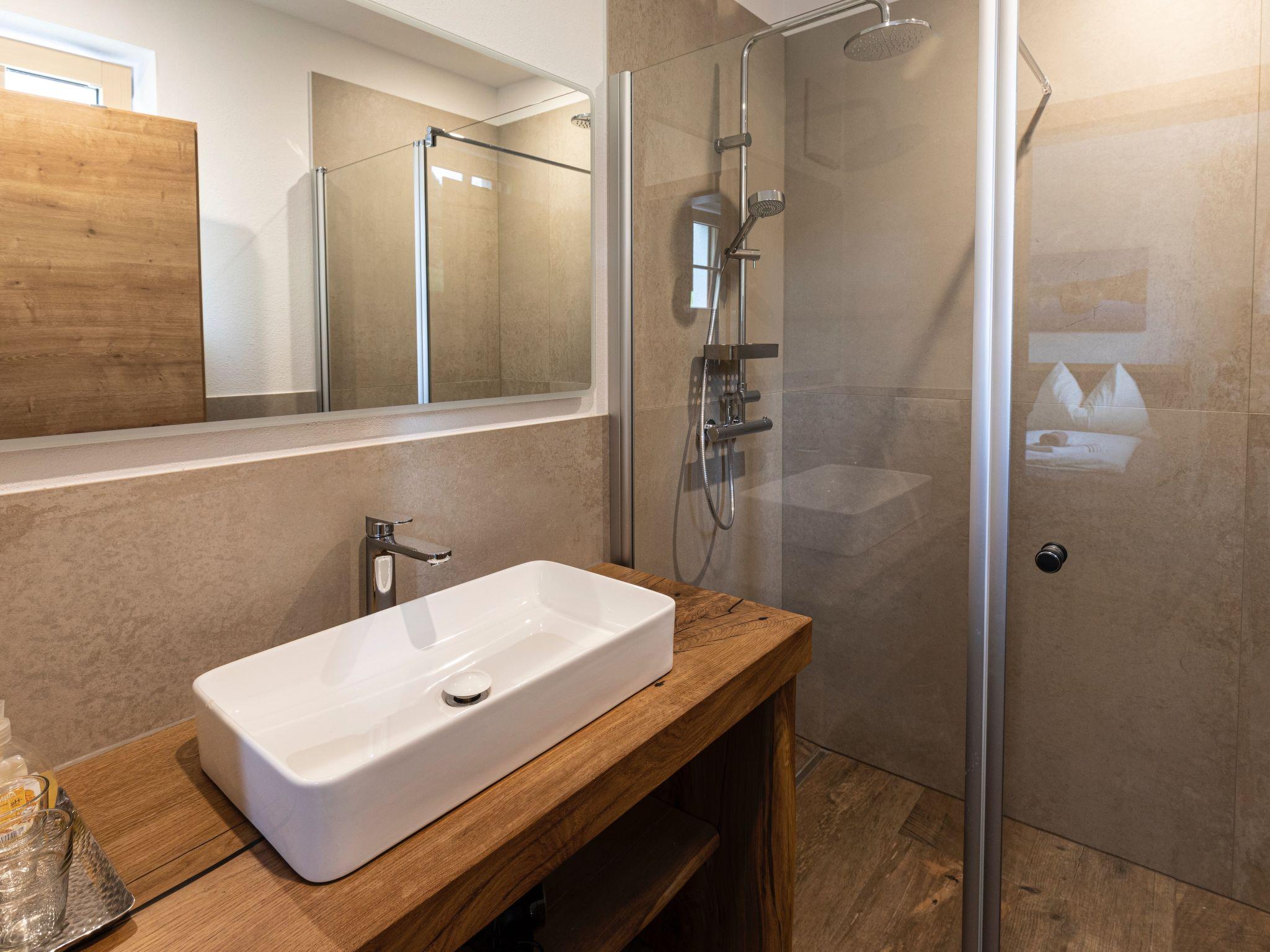 House A comprises around 170 m2 of living space and is made up of two flats. In total, there are two living areas, each with a generously equipped kitchen and dining area, four bedrooms en suite, four bathrooms with shower, four terraces with dining table, chairs and loungers, two carports and two outdoor parking spaces as well as two lockable storage rooms for bicycles and/or skis.