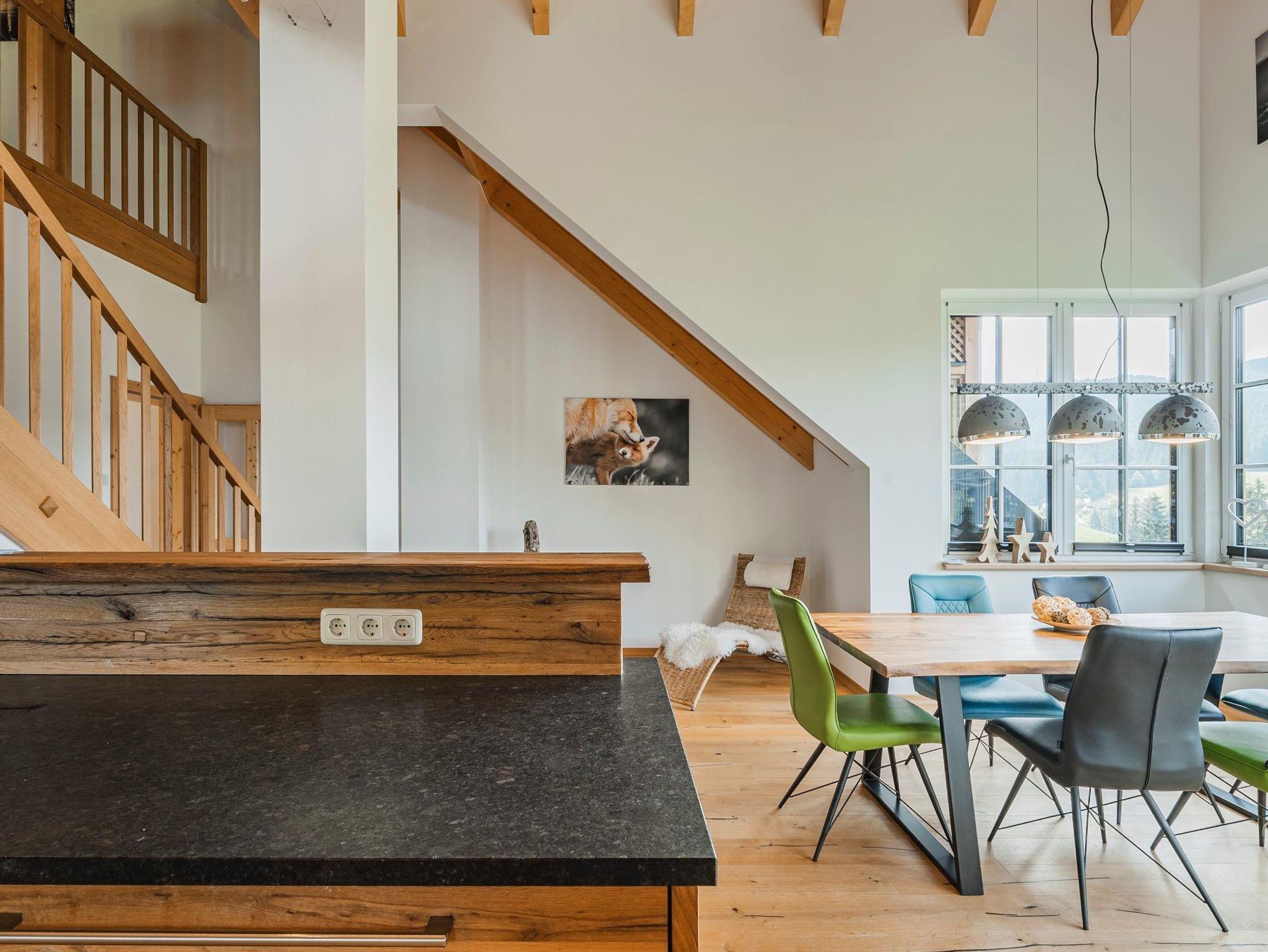 Die Wohnung selbst besticht nicht nur durch die herrliche Aussicht, sondern auch durch die einzigartige innenarchitektonische Gestaltung. Wir bieten Ihnen einen großen und offen gestalteten Wohnbereich bestehend aus Wohnküche welche mittels Treppe mit der Galerie offen verbunden ist. Auch die verglaste Veranda ist Teil der Wohnküche. Darin befindet sich der Essbereich.