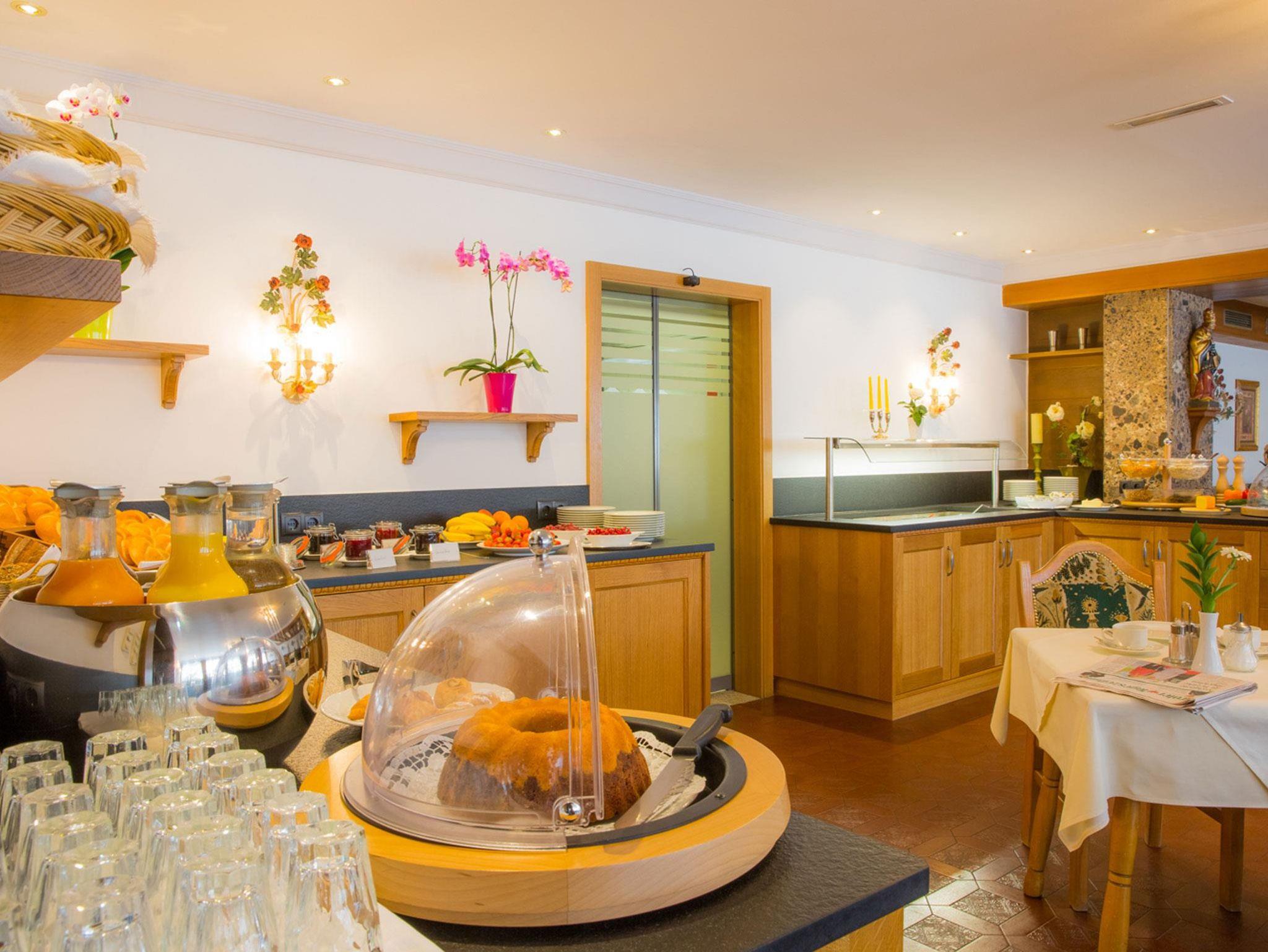 Das Frühstücksbuffet bietet regionale Spezialitäten vom Bauern nebenan, sowie ofenfrisches Gebäck vom Bäcker aus dem Ort, heimische Wurst- und Käsespezialitäten und wird im Sommer auf der Terrasse serviert.