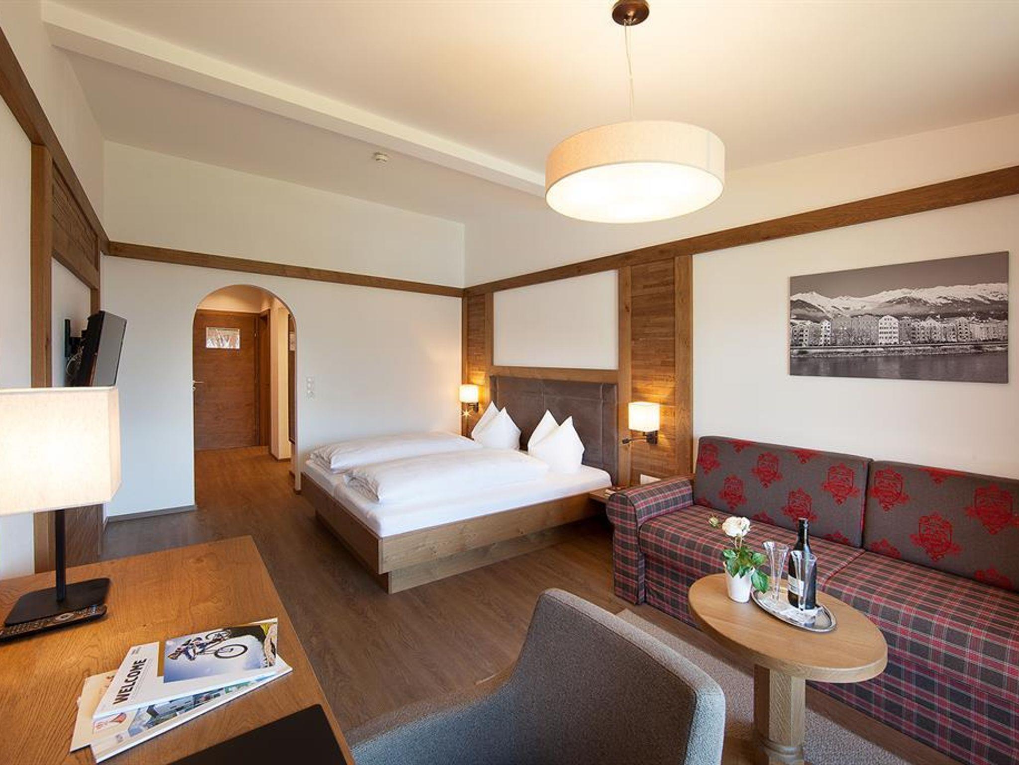 Tradition trifft auf Moderne - Sie können sich auf 30 m² wohlfühlen und Innsbruck und die Bergwelt bewundern. Ausgestattet mit einem Arbeitstisch, Telefon, SAT-TV, Klimaanlage und Safe sowie einer Couch. Badezimmer mit Dusche, Föhn und getrenntem WC.
