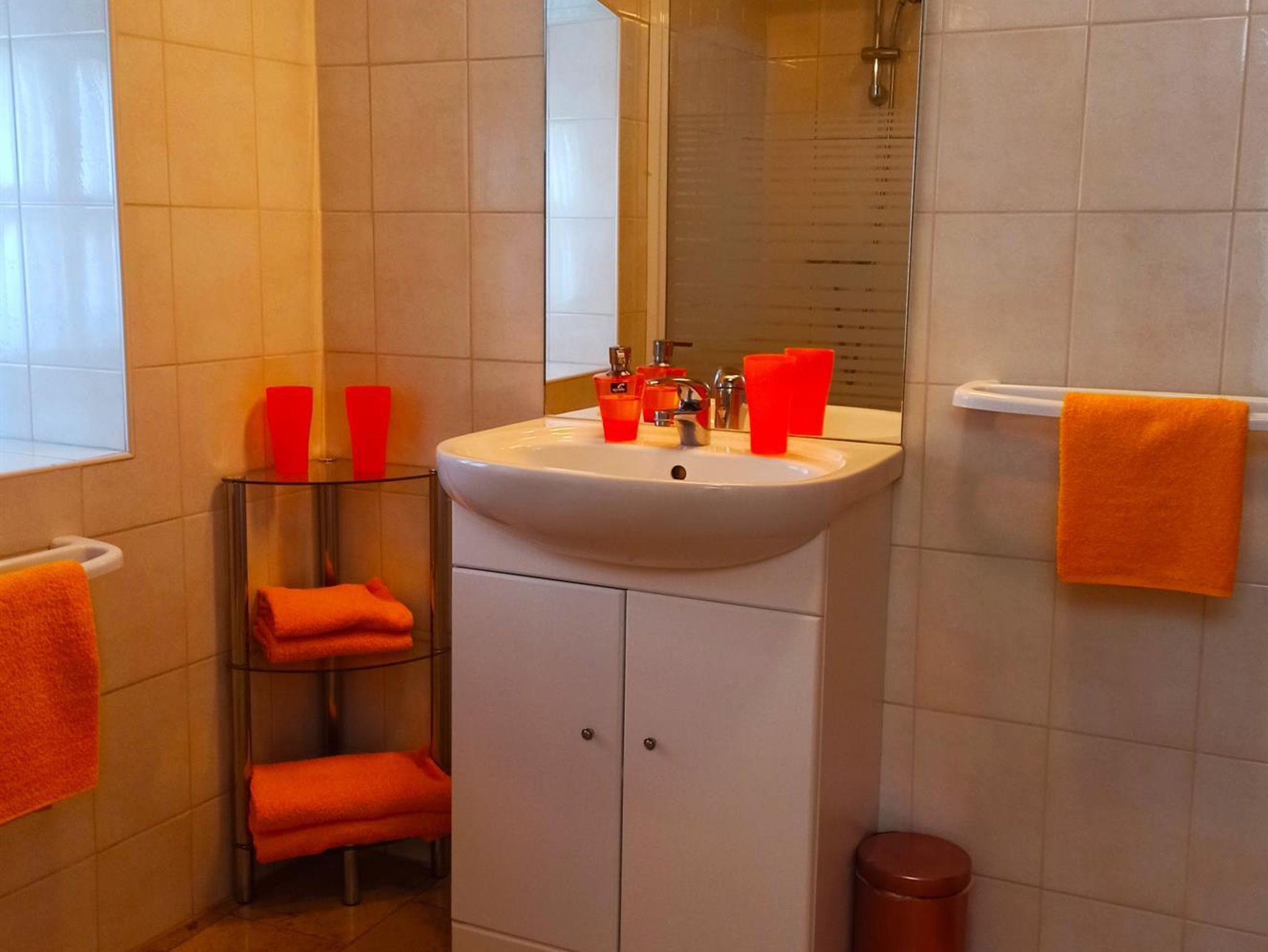 33m², Couch und Fernseher, Kleiderschrank, Küche mit Einbauherd, Mikrowelle, Kaffeemaschine, Wasserkocher, Toaster, Kühlschrank mit Gefrierfach und Spüle sowie sämtiches Geschirr - Sitzgelegenheit für 4 Personen - Bad mit Dusche und Badewanne, Waschbecken und WC