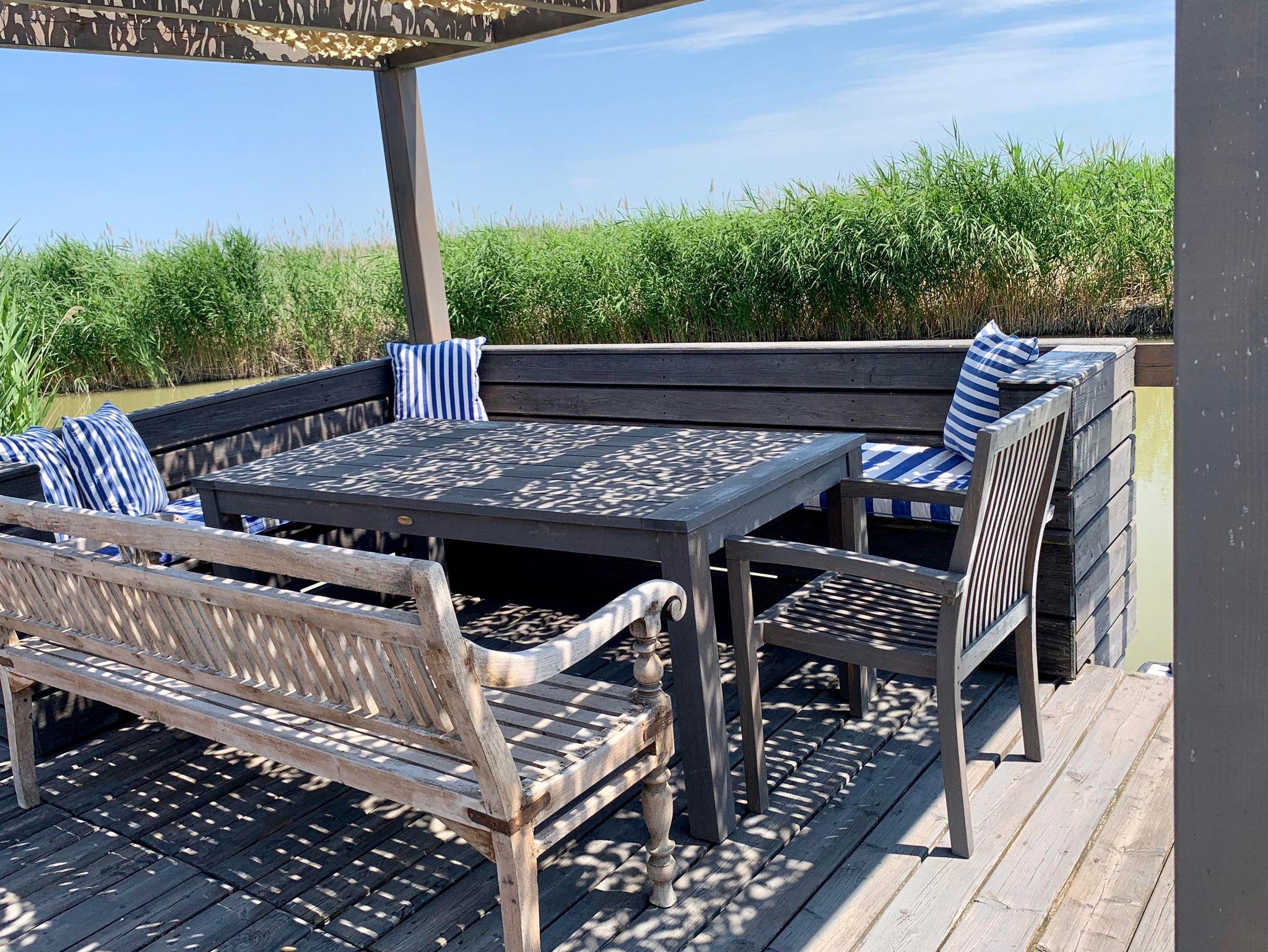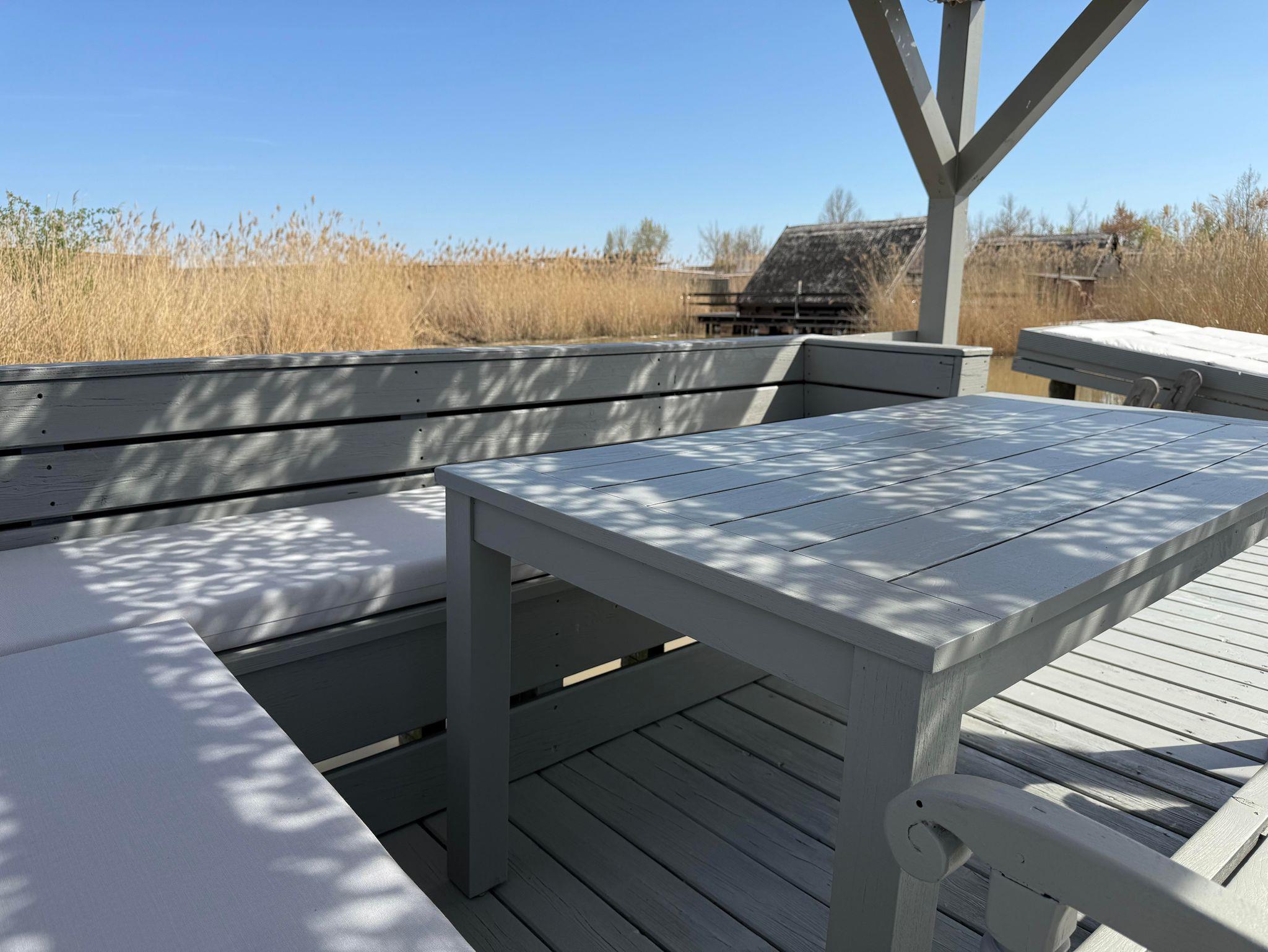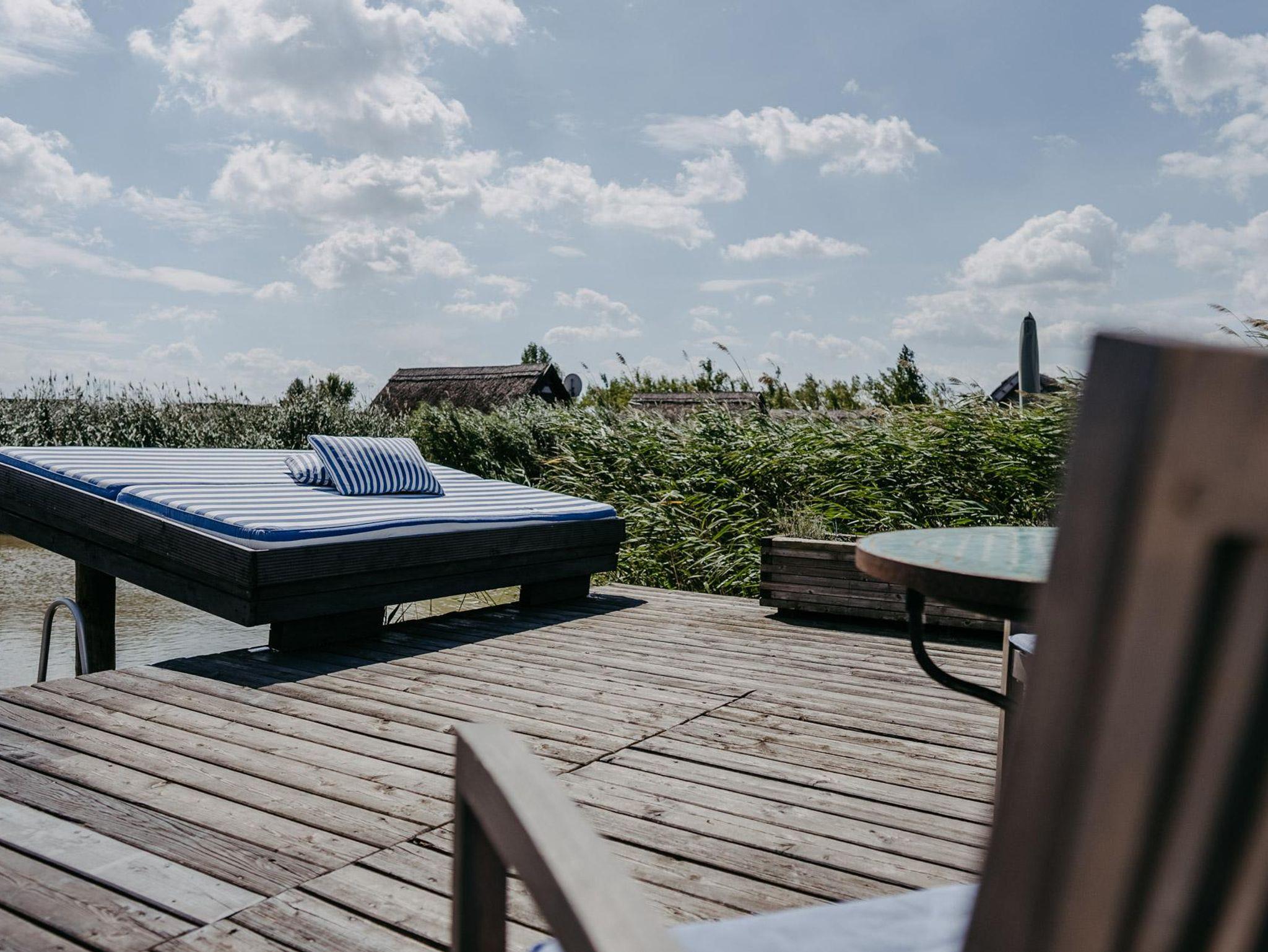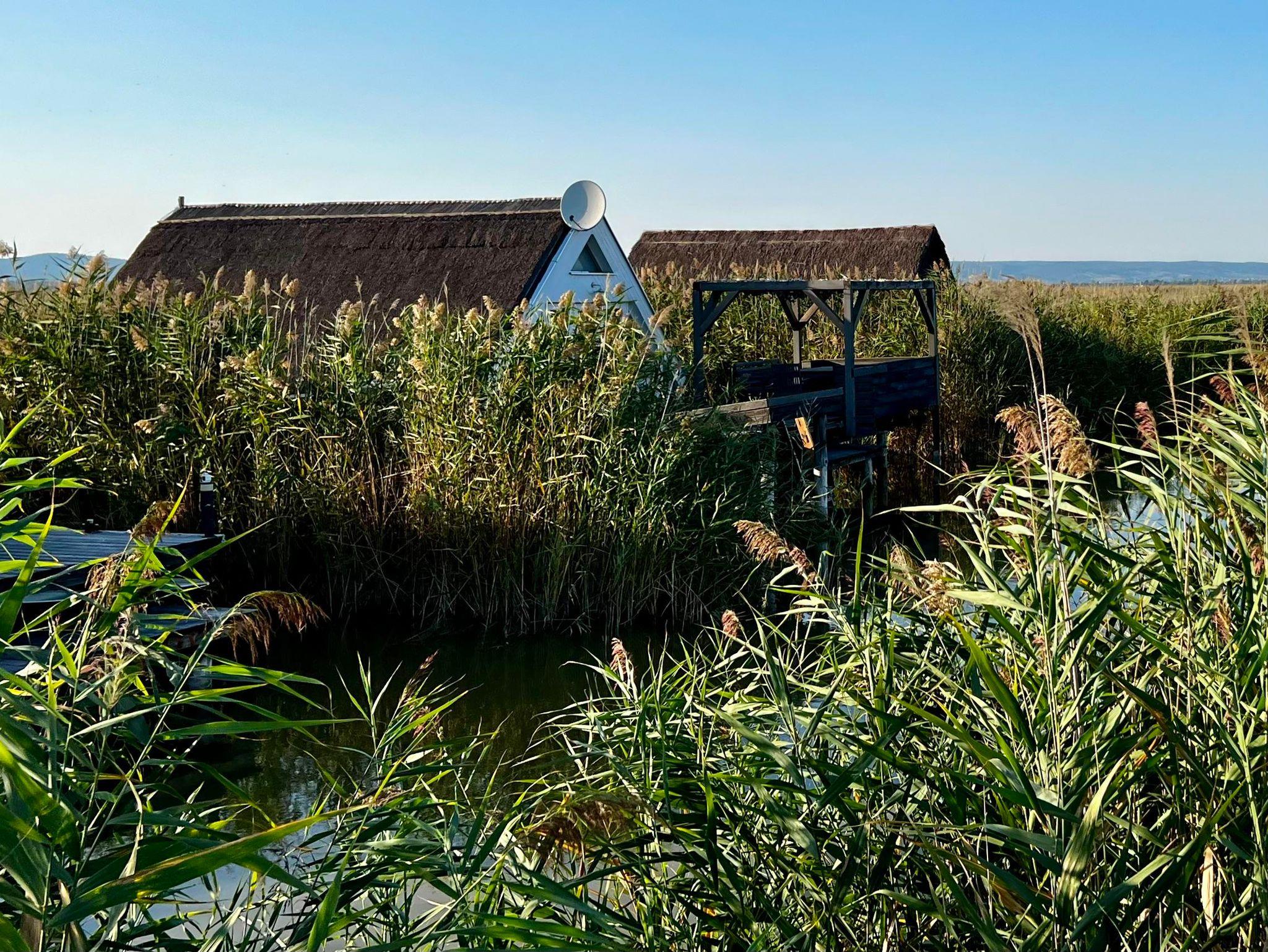 Vor der Hütte gibt es einen großzügigen Schwimmbereich, wobei der gesamte See nicht sehr tief ist. Ein großes Sonnendeck mit gepolsterten Auflagen lädt zum Sonnenbaden und Entspannen ein. Neben dem großen Esstisch in der Hütte haben Sie auch Draußen auf der Terrasse, unter einem schattigen Segel, eine Eckbank mit Esstisch direkt über dem Wasser. Die Hütte liegt mitten im Naturschutzgebiet und ist von Wasser und Schilf umgeben. Der Neusiedler See und die Ruster Altstadt gehören zum UNESCO Weltkulturerbe. Damit misst die UNESCO der Kulturlandschaft Neusiedler See einen außergewöhnlichen Wert für die gesamte Menschheit bei.