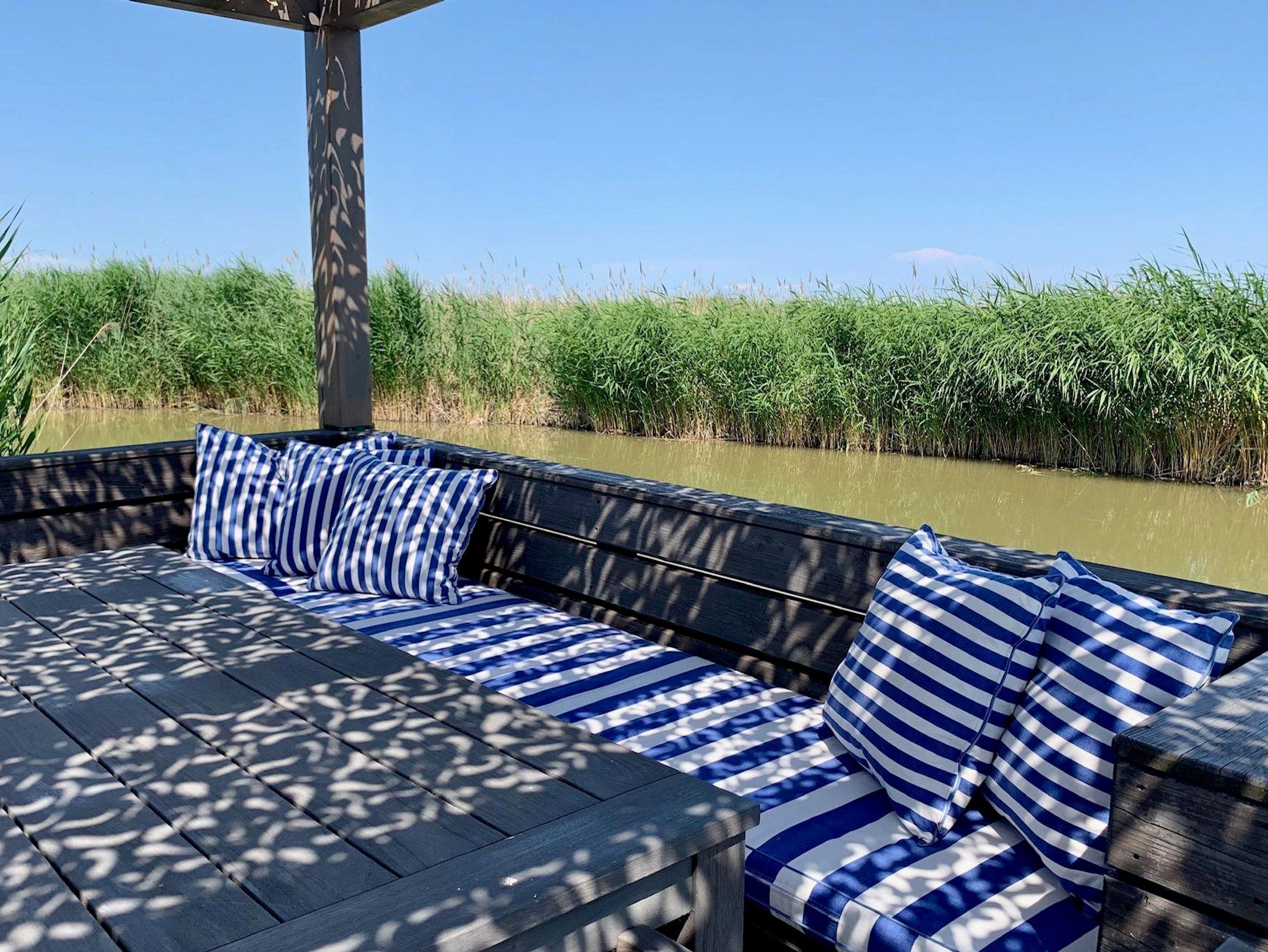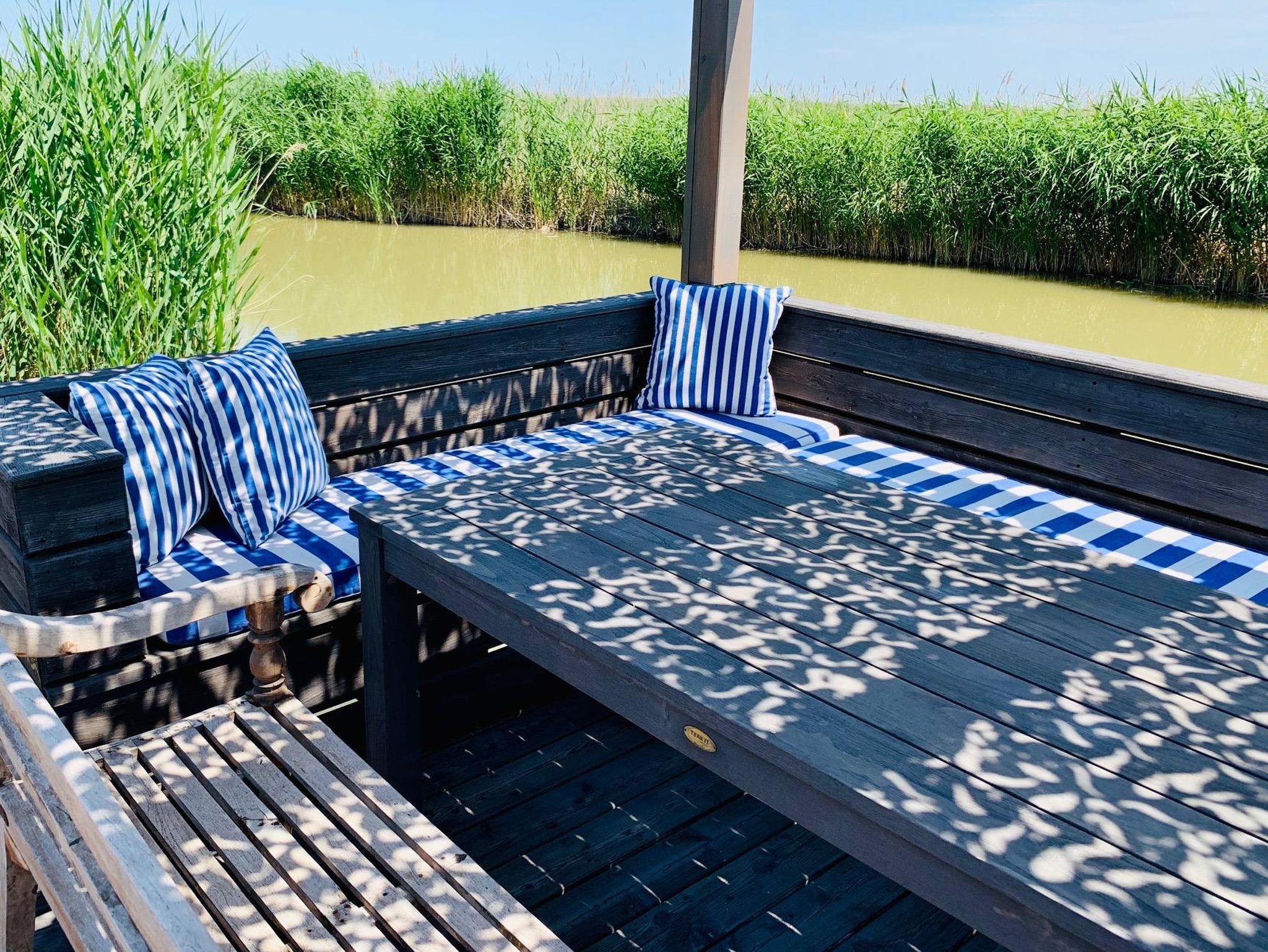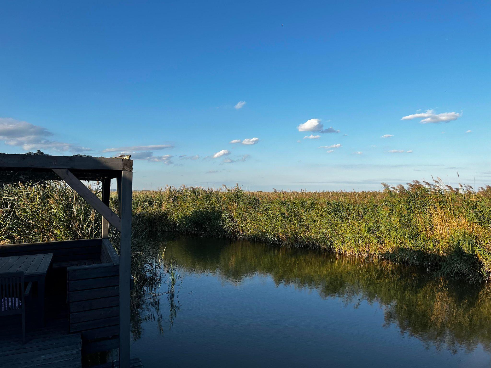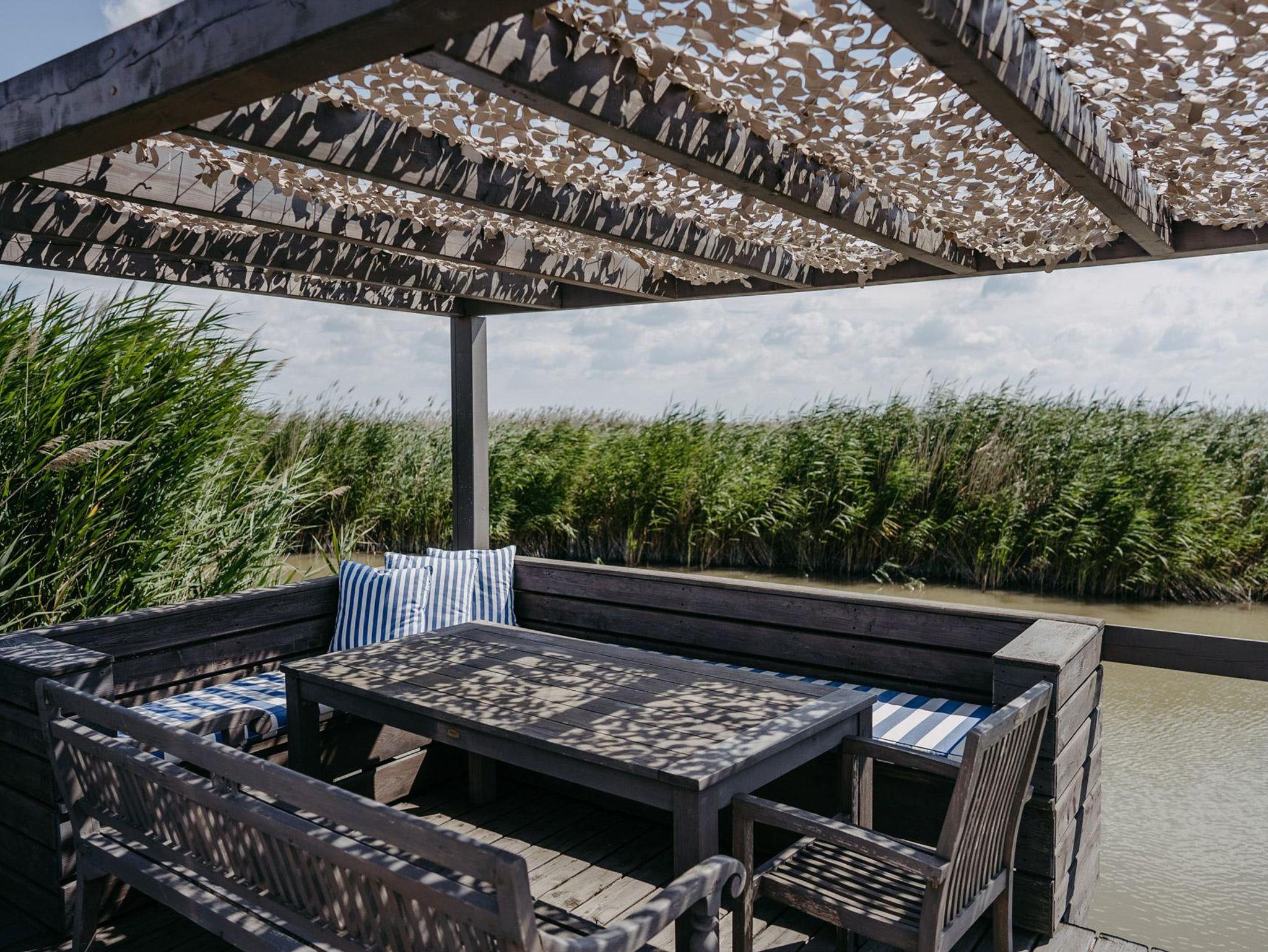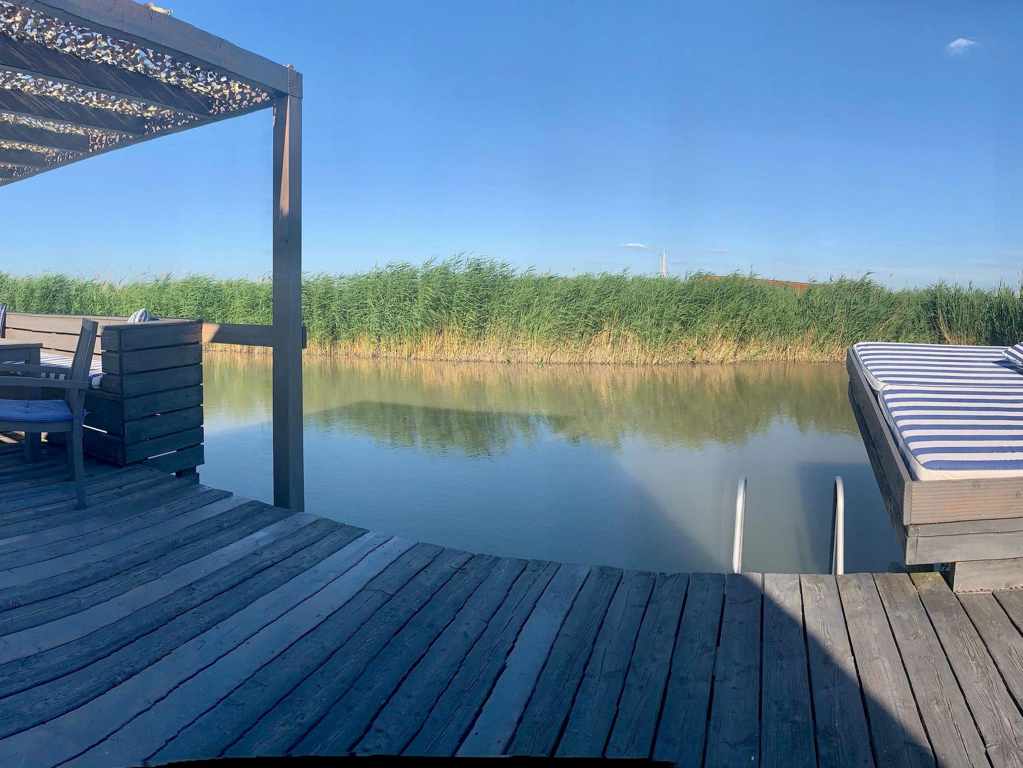 Vor der Hütte gibt es einen großzügigen Schwimmbereich, wobei der gesamte See nicht sehr tief ist. Ein großes Sonnendeck mit gepolsterten Auflagen lädt zum Sonnenbaden und Entspannen ein. Neben dem großen Esstisch in der Hütte haben Sie auch Draußen auf der Terrasse, unter einem schattigen Segel, eine Eckbank mit Esstisch direkt über dem Wasser. Die Hütte liegt mitten im Naturschutzgebiet und ist von Wasser und Schilf umgeben. Der Neusiedler See und die Ruster Altstadt gehören zum UNESCO Weltkulturerbe. Damit misst die UNESCO der Kulturlandschaft Neusiedler See einen außergewöhnlichen Wert für die gesamte Menschheit bei.