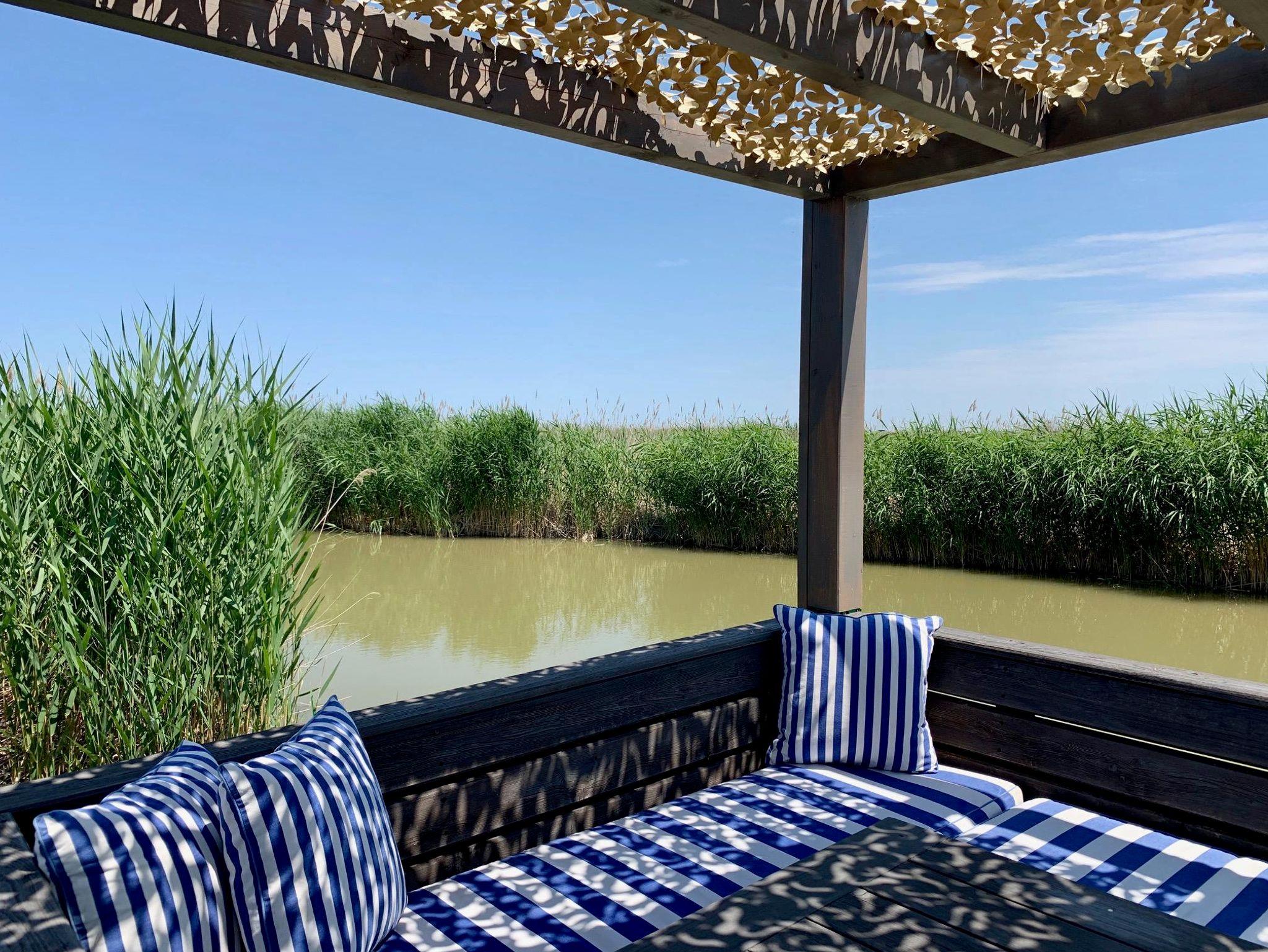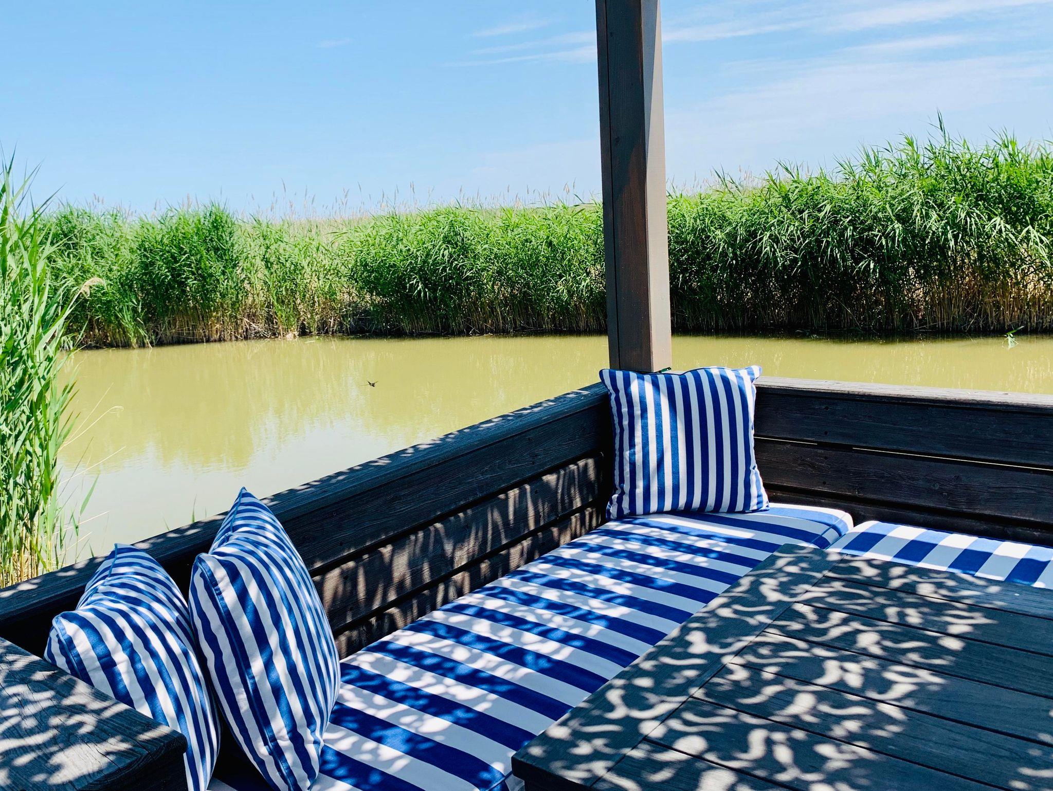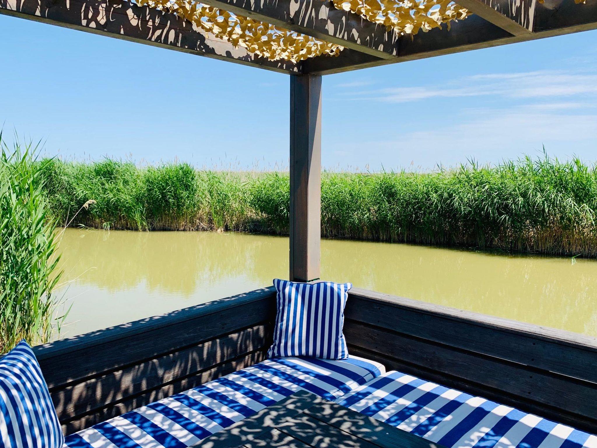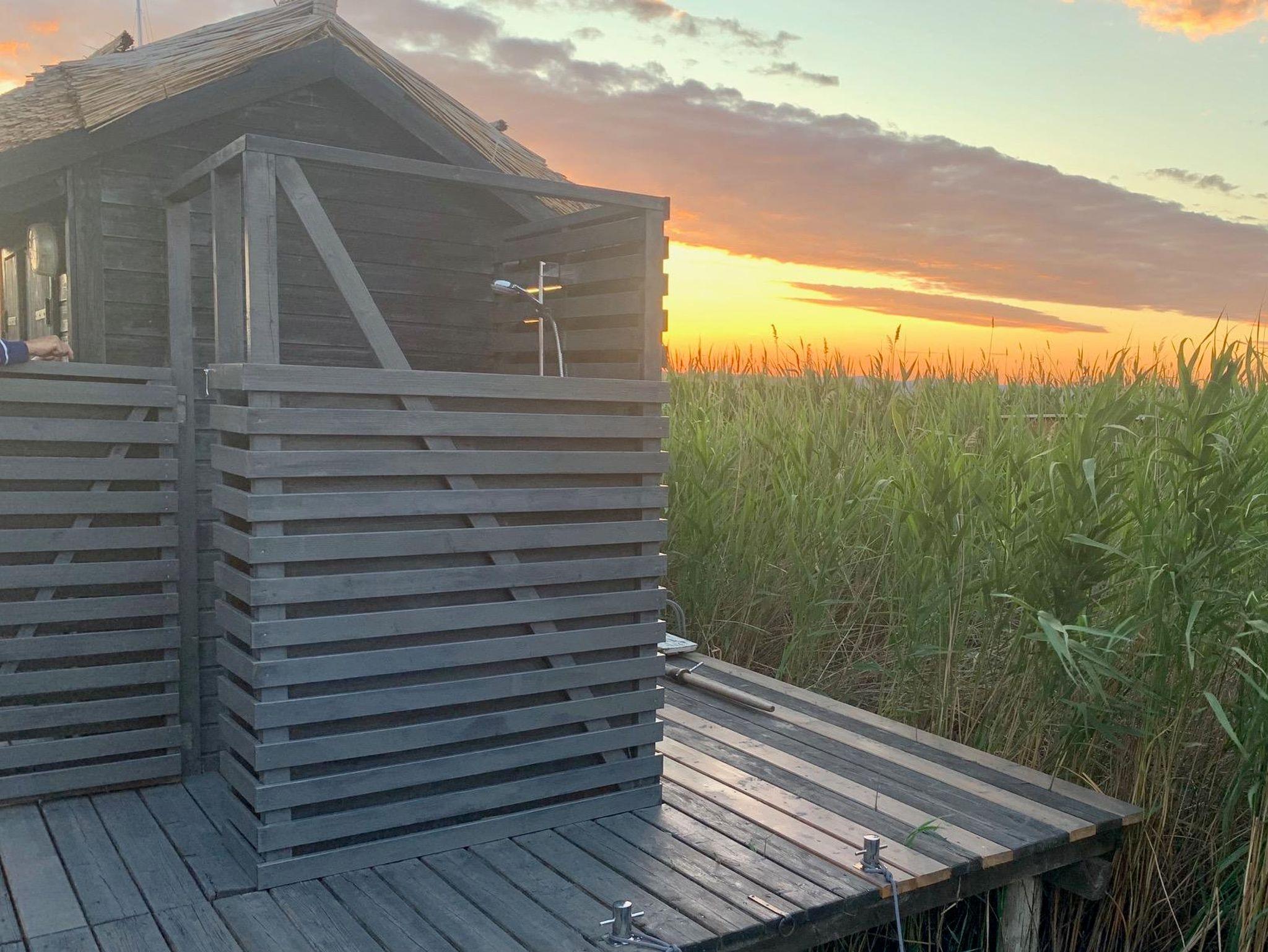 Vor der Hütte gibt es einen großzügigen Schwimmbereich, wobei der gesamte See nicht sehr tief ist. Ein großes Sonnendeck mit gepolsterten Auflagen lädt zum Sonnenbaden und Entspannen ein. Neben dem großen Esstisch in der Hütte haben Sie auch Draußen auf der Terrasse, unter einem schattigen Segel, eine Eckbank mit Esstisch direkt über dem Wasser. Die Hütte liegt mitten im Naturschutzgebiet und ist von Wasser und Schilf umgeben. Der Neusiedler See und die Ruster Altstadt gehören zum UNESCO Weltkulturerbe. Damit misst die UNESCO der Kulturlandschaft Neusiedler See einen außergewöhnlichen Wert für die gesamte Menschheit bei.