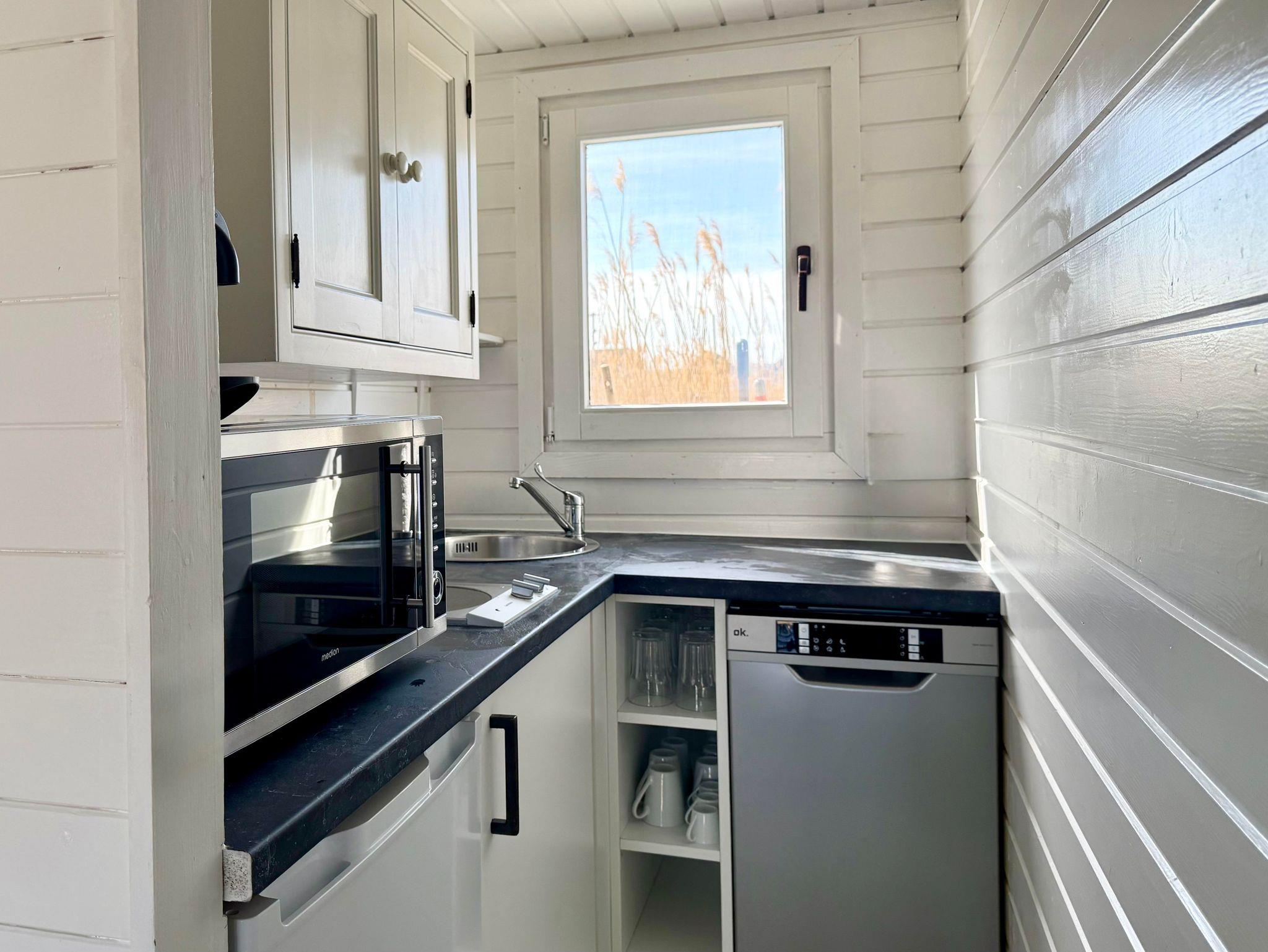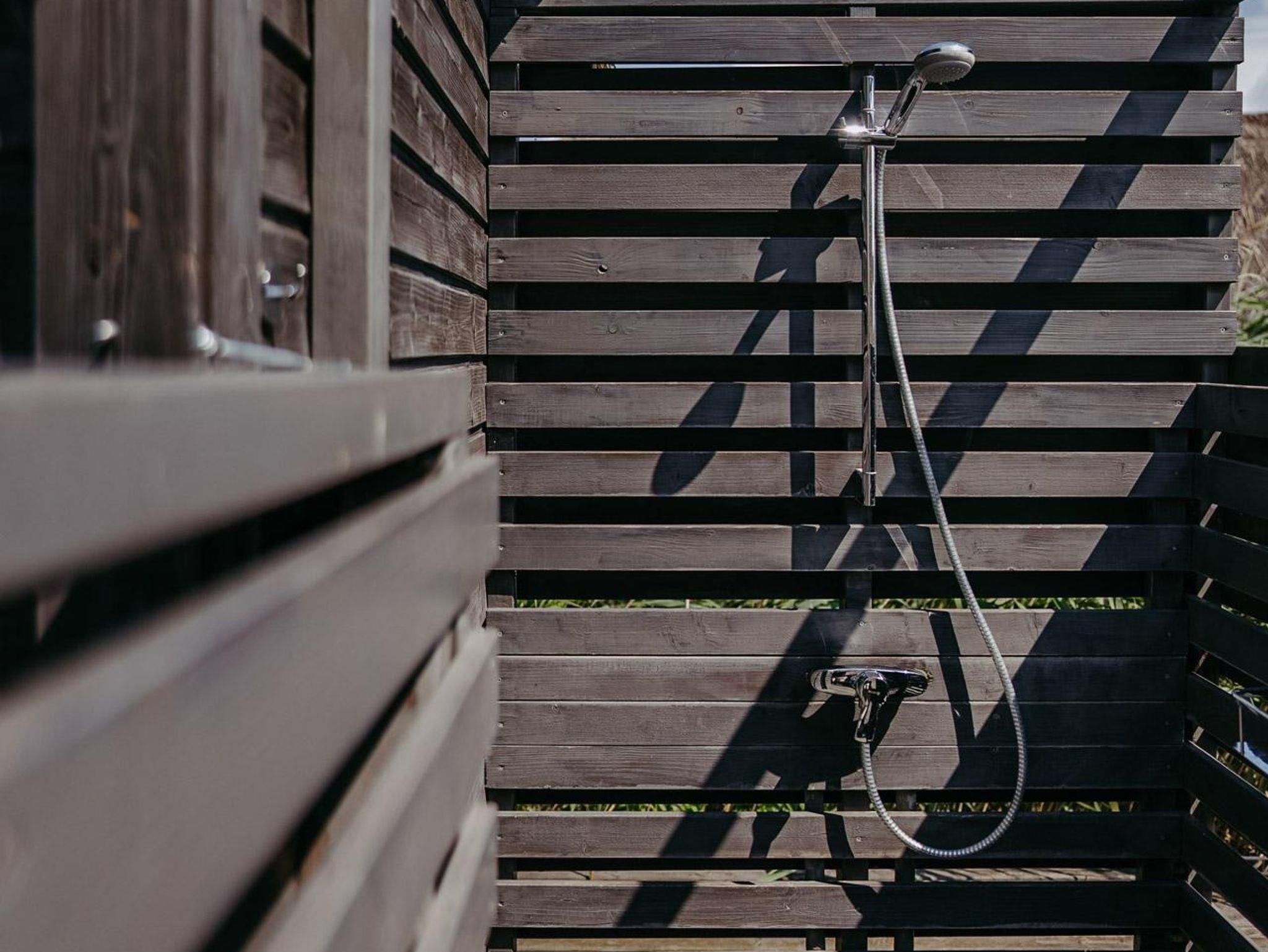 Eine kleine Küche mit Herd, Geschirrspülmaschine, Kühlschrank, Tiefkühlschrank und eine Nespresso Maschine sind vorhanden. WC und Bad mit Waschbecken befinden sich in der Hütte. Zum Duschen haben wir - ganz im Glamping Stil - eine Outdoor Dusche mit Warmwasser, wo Sie im Freien duschen können. Bitte beachten Sie, dass die Dusche und Größe der Hütte trotz allem, eher an einen Segel oder Camping Urlaub erinnern und das Platzangebot in der Hütte recht beschränkt ist.