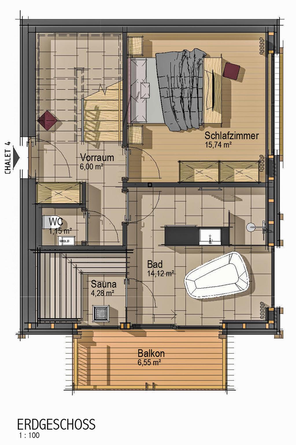 "Chalet White Diamond", 2-room maisonette 88 m2. Luxurious and tasteful furnishings: entrance hall. 1 double bedroom with satellite TV (flat screen). Bath/shower, sep. WC, Sauna. Heating. Upper floor: living/sleeping room with 1 double sofabed and satellite TV (flat screen). Kitchen (oven, dishwasher, 4 ceramic glass hob hotplates, toaster, kettle, microwave, freezer, electric coffee machine) with dining table. Exit to the balcony. 2 small balconies 6 m2. Balcony furniture. Marvellous distant view of the mountains. Facilities: sauna, safe, hair dryer. Internet (WiFi, free). Please note: non-smokers only. Maximum 1 pet/ dog allowed. Smoke alarm.
