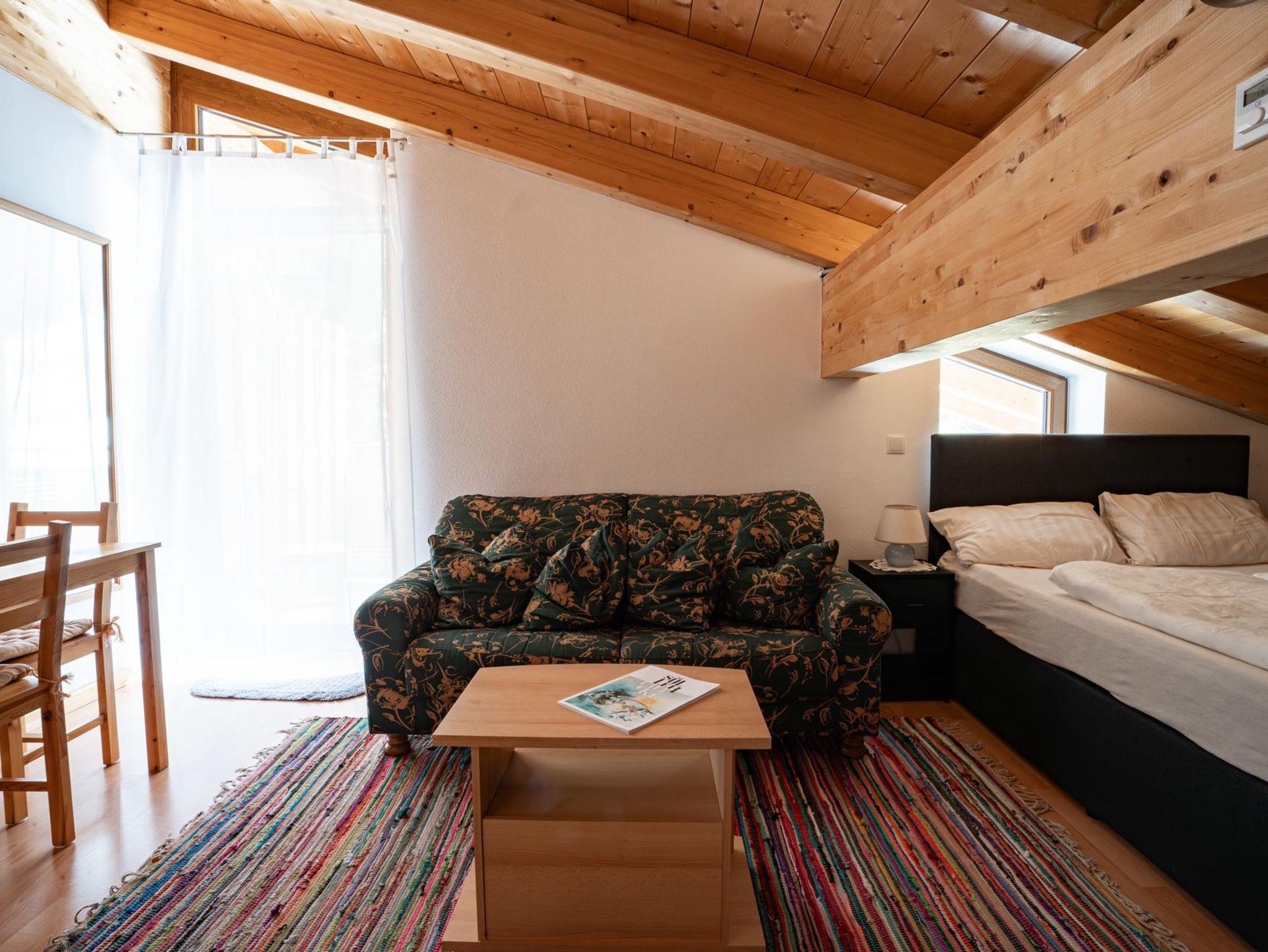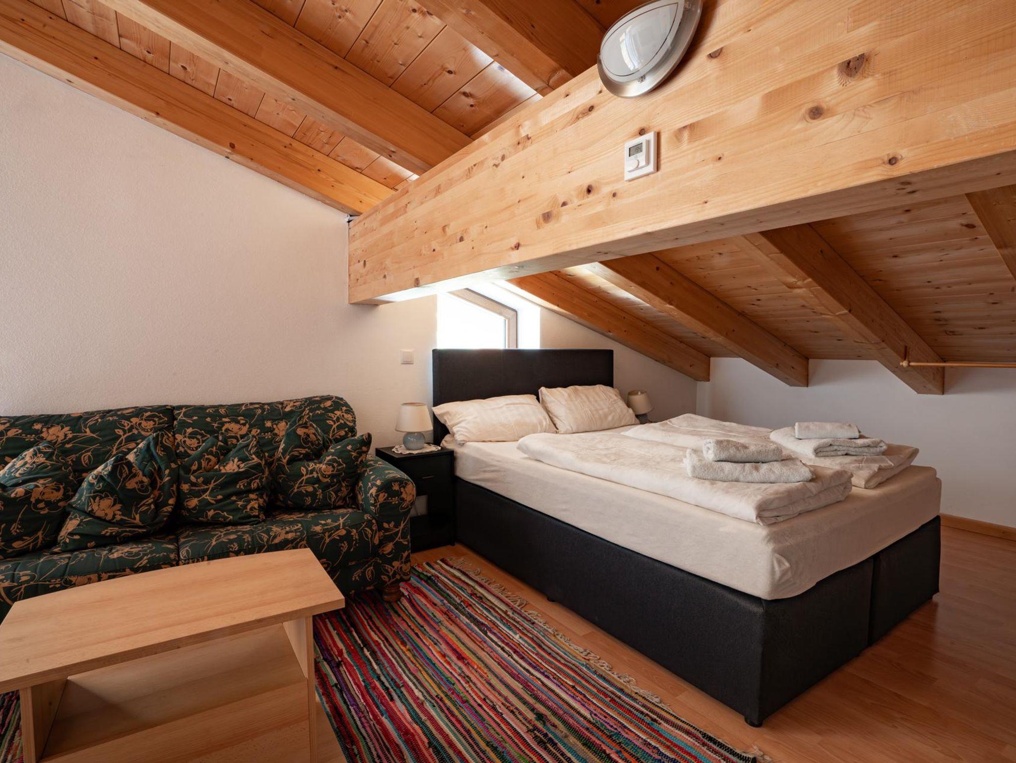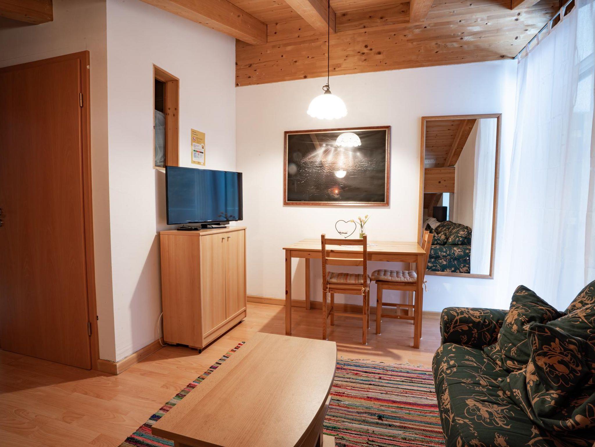 Mit einer Fläche von 24 m² bietet diese Wohnung einen Schlaf- und Wohnraum mit einem Doppelbett sowie eine separate Küche. Die Einrichtung folgt dem rustikalen Stil des Hauses und sorgt für eine warme und einladende Atmosphäre. Obwohl kleiner, ist diese Wohnung perfekt für Paare oder Einzelreisende, die eine komfortable und praktische Unterkunft in der Nähe der Natur suchen.