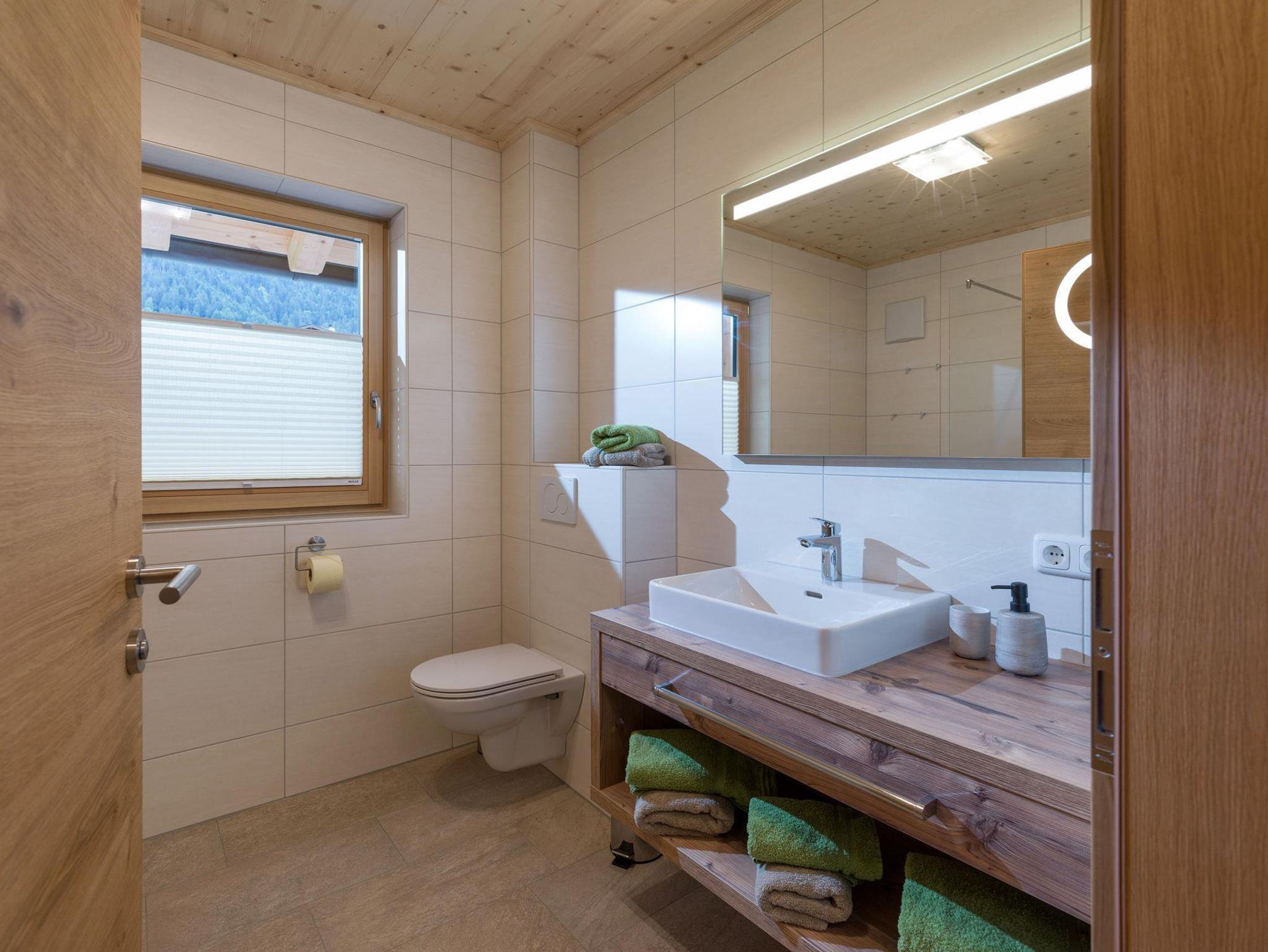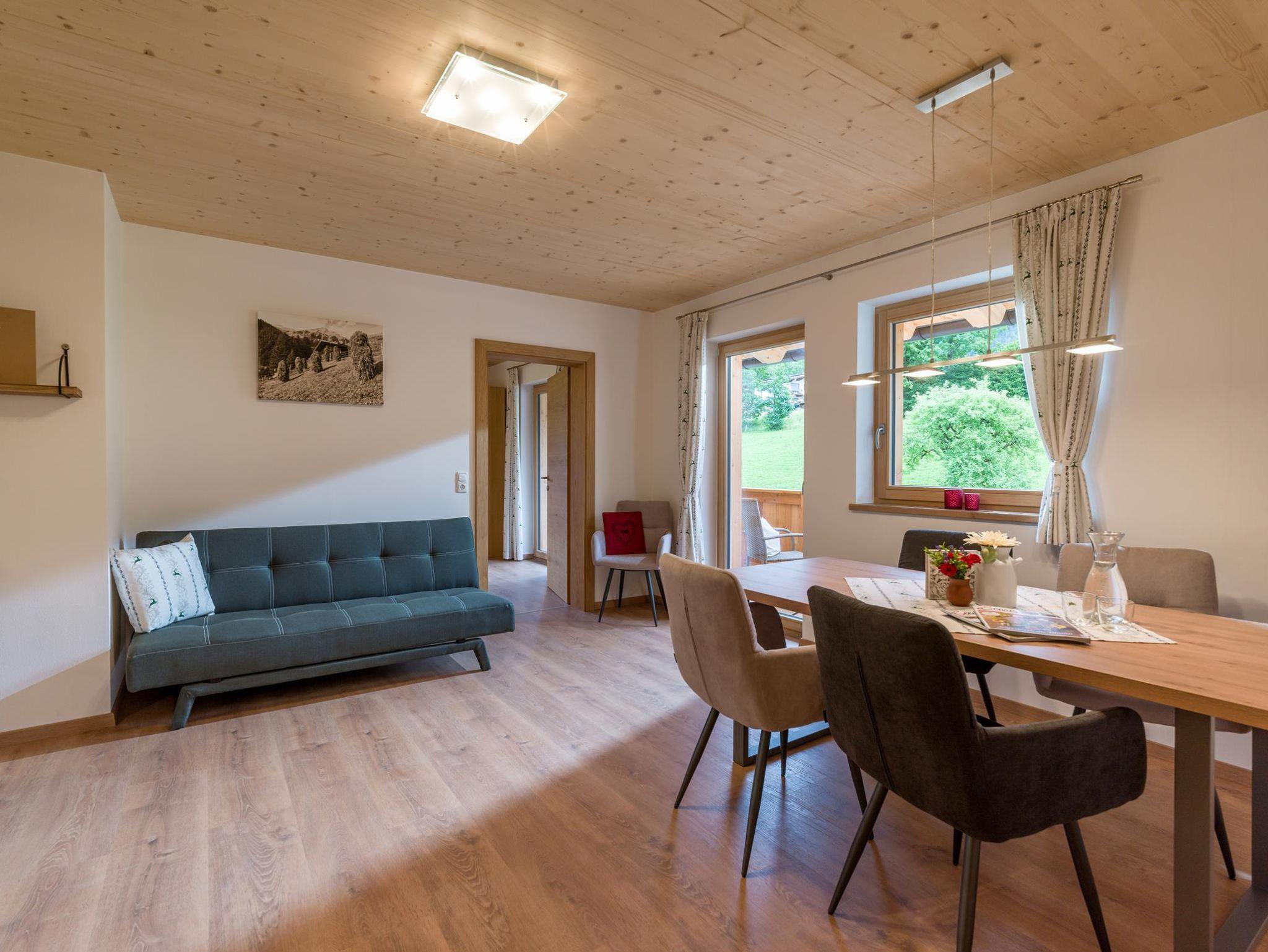 Vom großen Balkon genießt man den Ausblick auf den Wilden Kaiser, während die Kinder auf dem Spielplatz spielen oder gemeinsam mit den Gastgebern einen Blick in den Stall zu Kühen, Ziegen und Hühnern werfen können.