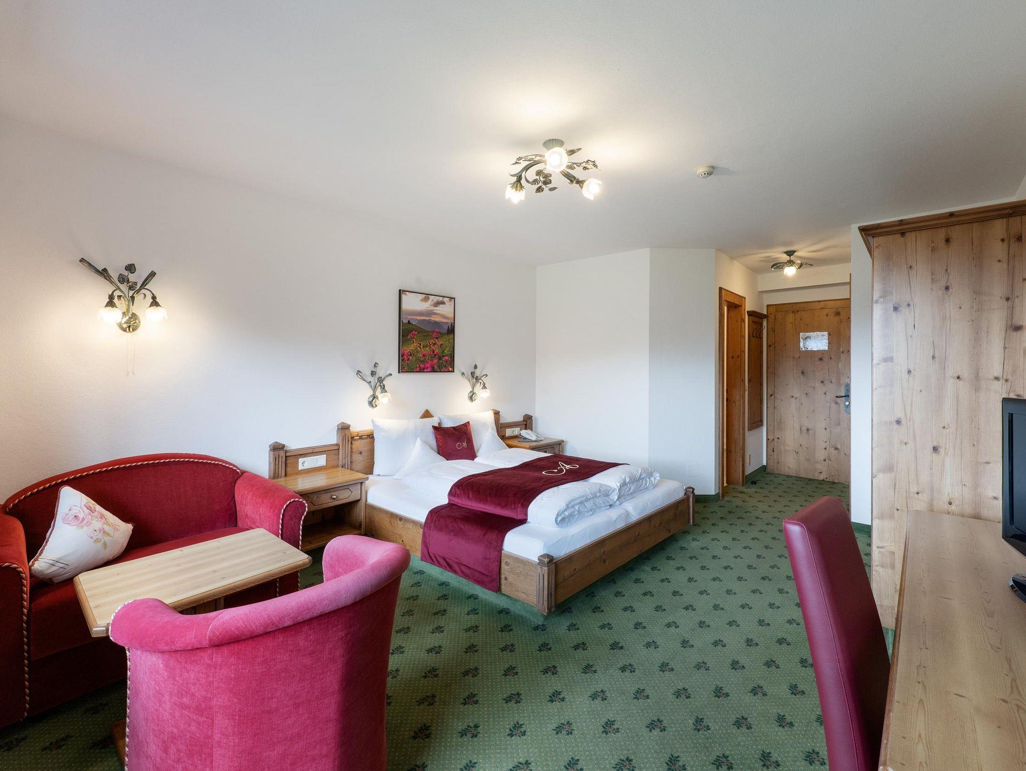 Genießen Sie Ihren Aufenthalt im sonnigen Komfortdoppelzimmer mit ausziehbarer Couch, für 2 Erwachsene und 2 Kinder geeignet. Bad mit Badewanne und Dusche, WC separat, Kosmetikspiegel, Haartrockner, Telefon, SAT-TV mit Fernsehprogramm, Radio, Safe, Minibar, Balkon mit Tal- und Bergblick, kostenloser Parkplatz (im Freien), WLAN!
