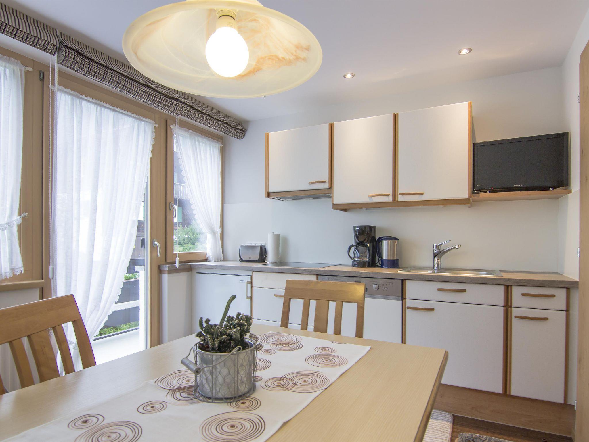 Wohnung 1 mit 45m² für 3-4 Personen verfügt über zwei getrennte Doppelzimmer, Badezimmer mit Dusche und separatem WC, einer Küche mit Esstisch und einem Nord u. Ostbalkon. Die Küche ist komplett ausgestattet mit 4 Platten E-Herd, kleiner Grill u. Backautomat, Geschirrspüler, Soda Stream, Filter,- und Nespressokaffeemaschine, Wasserkocher und Toaster.