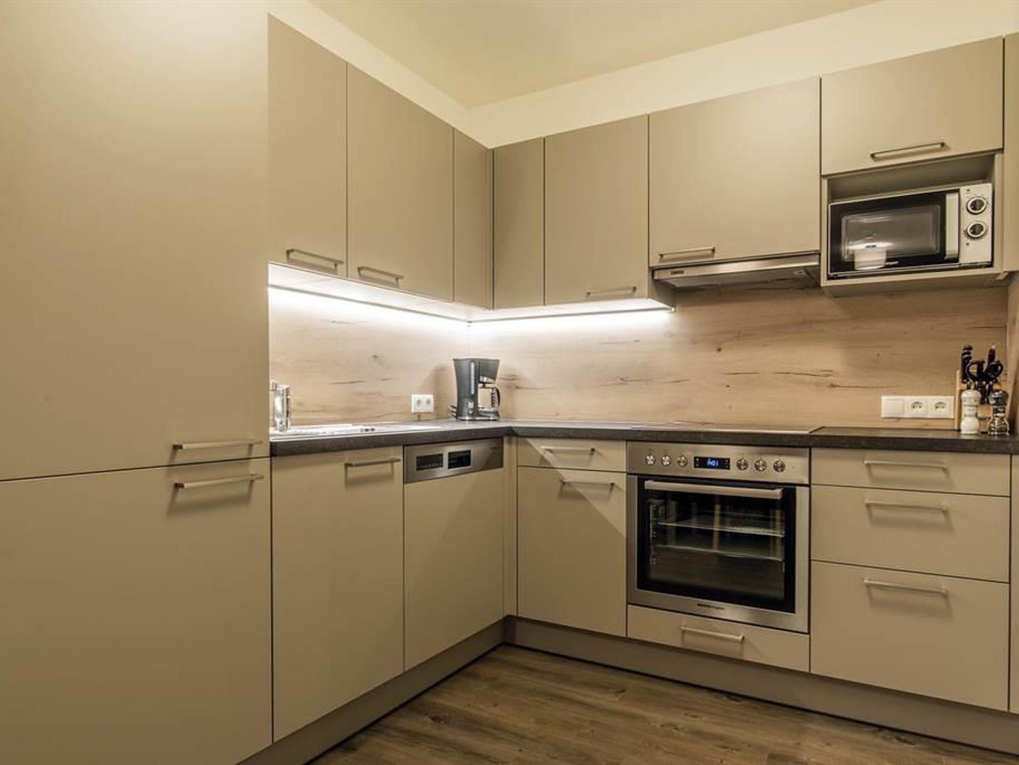 1 geräumige Wohnküche mit hochwertigen Geräten, inkl. Küchenausstattung, großzügiger Essplatz, mit ausziehbarer Komfortcouch für 2 weitere Schlafmöglichkeiten, TV, Musikanlage