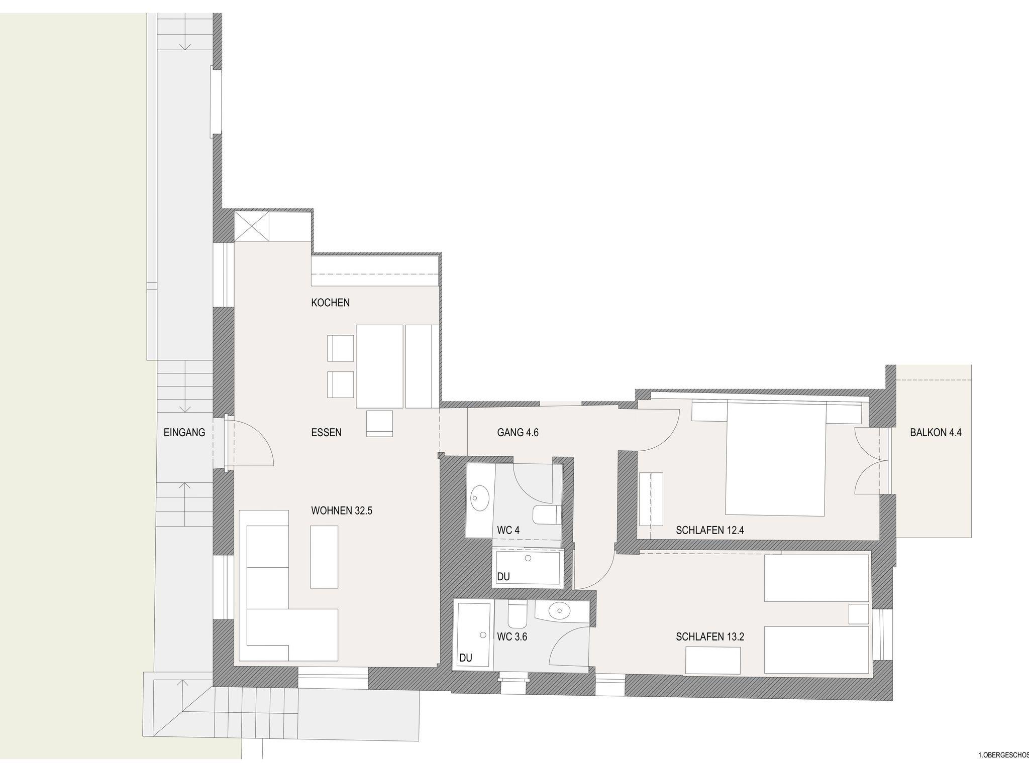 Wichtige Info bei 2 Personenbelegung; hier wird ein Schlafzimmer mit Bad/WC abgeschlossen, Wohn-Küche ist offen.