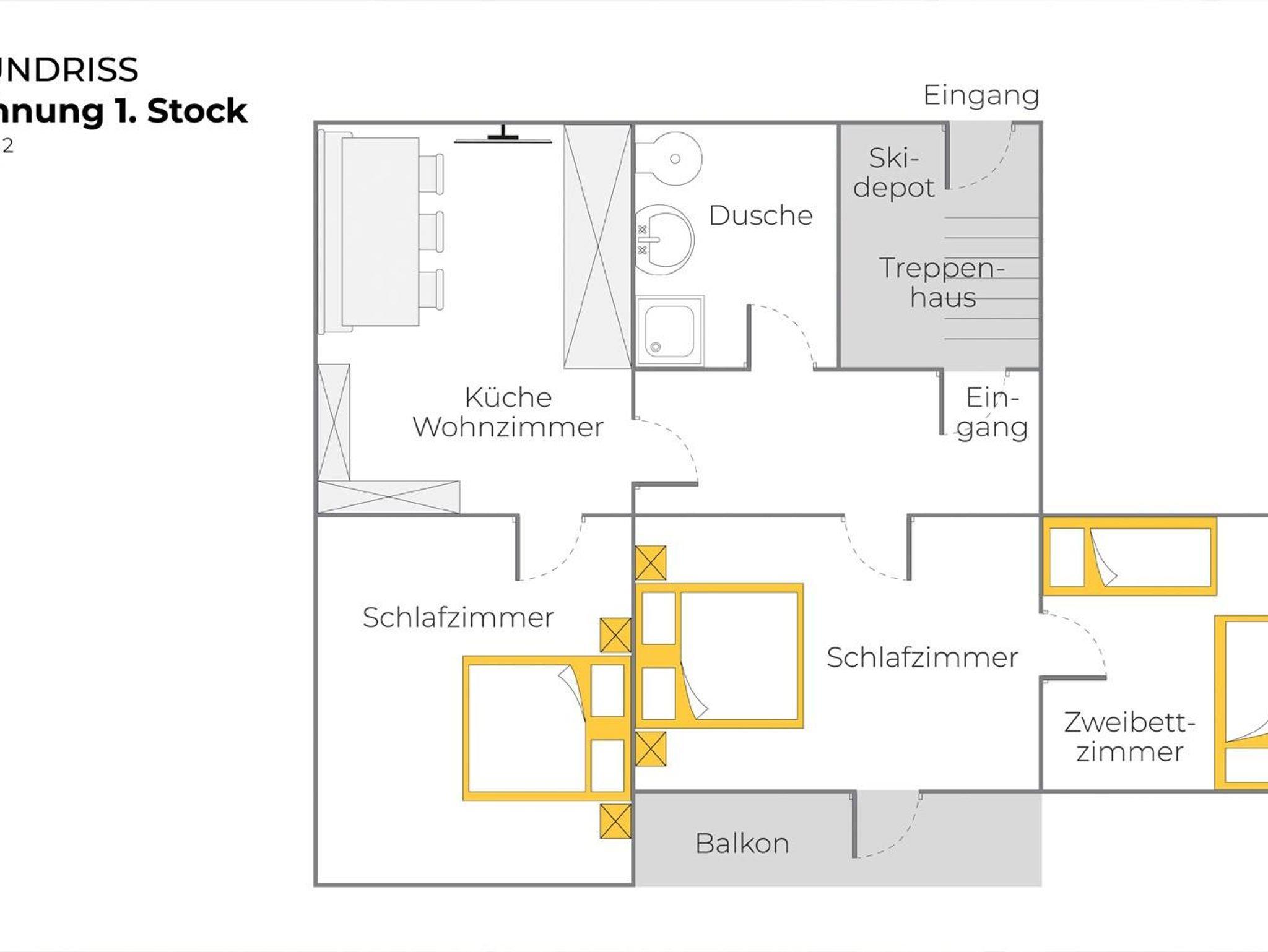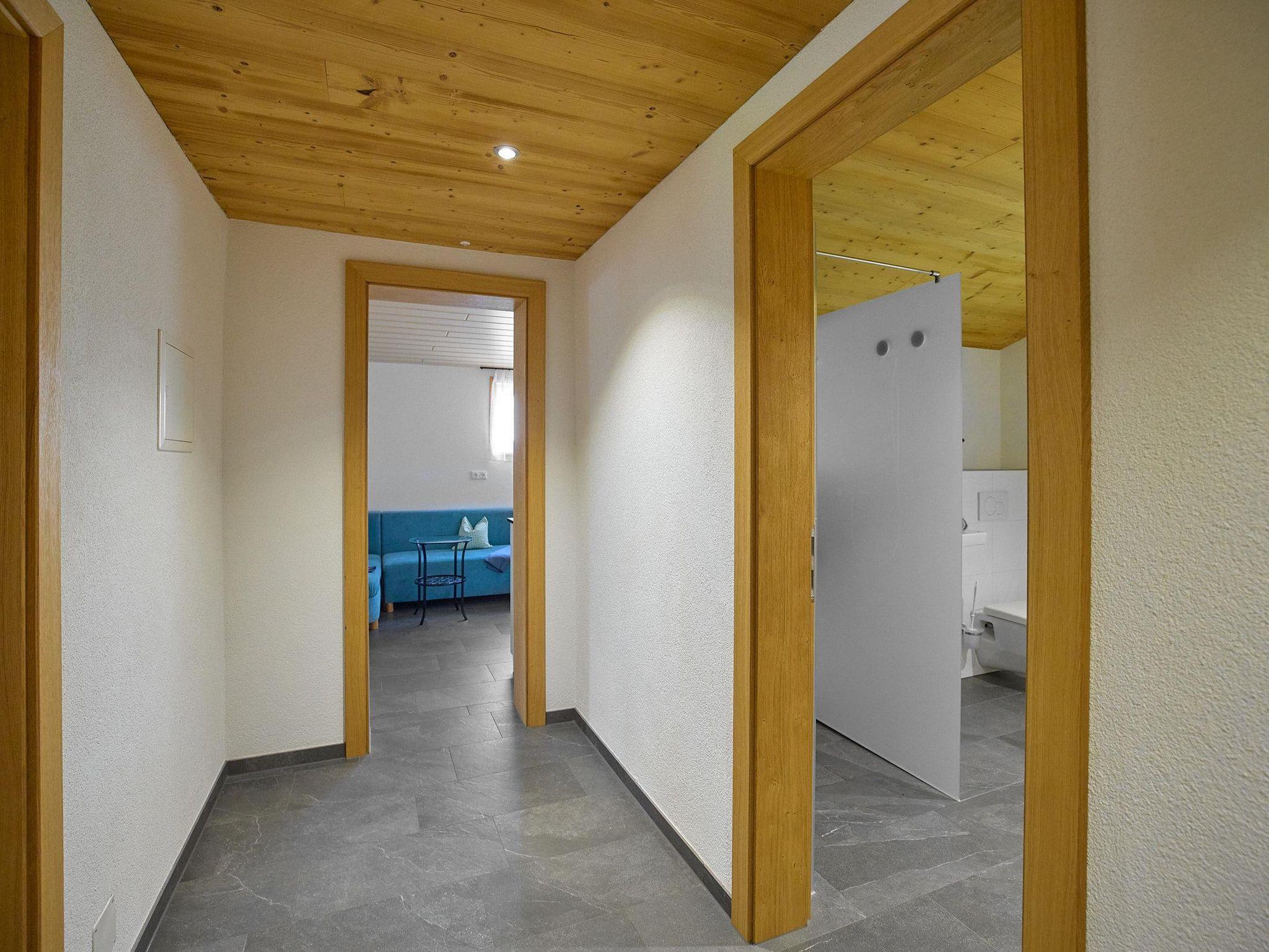 Die Wohnung parterre (ca. 85 m²) besteht aus 2 Doppelzimmer, 1 Kinderzimmer mit 1 Stockbett, 1 Badezimmer mit Dusche, 1 WC, 1 Küche mit Essecke und 1 Wohnzimmer.