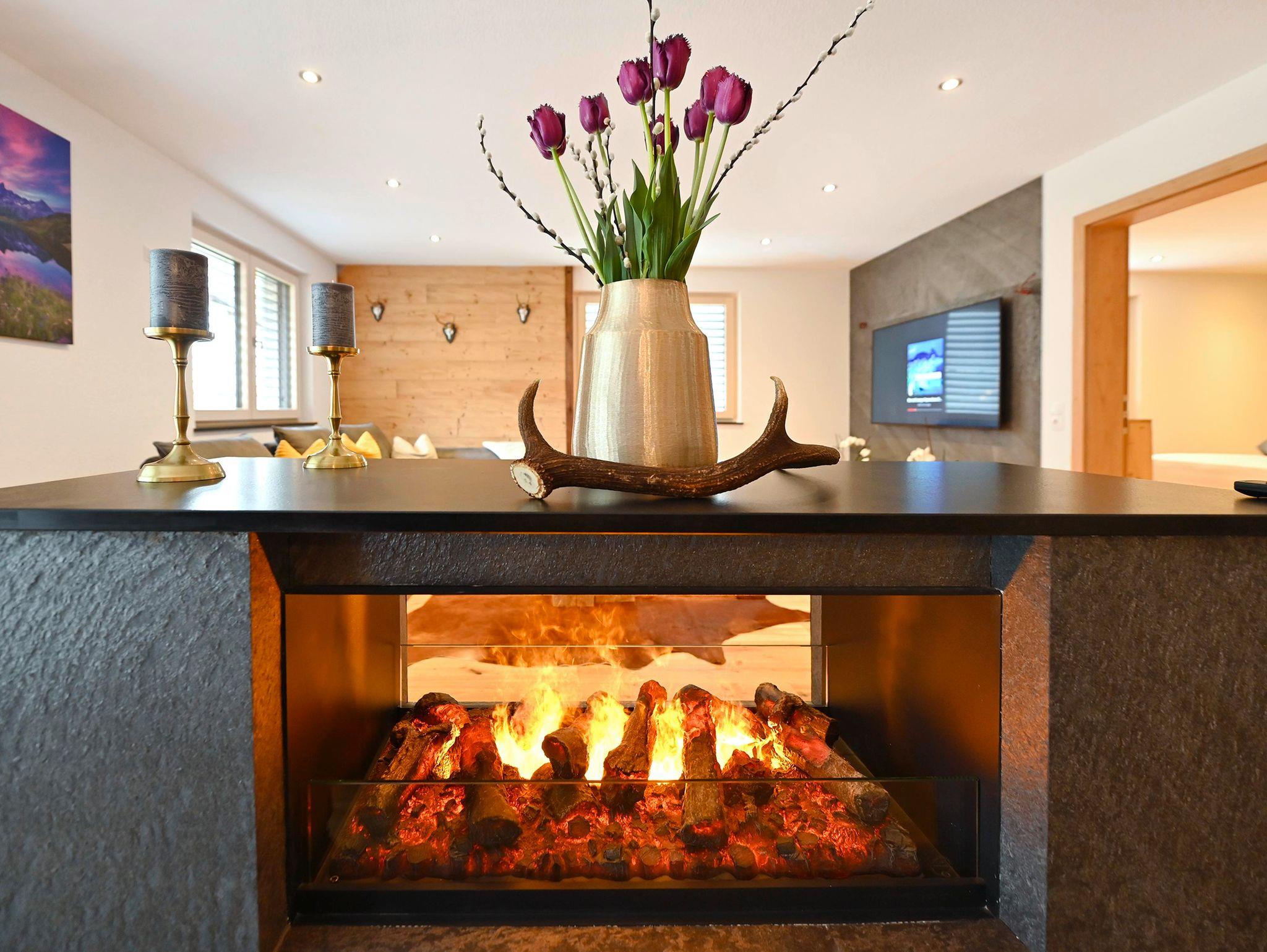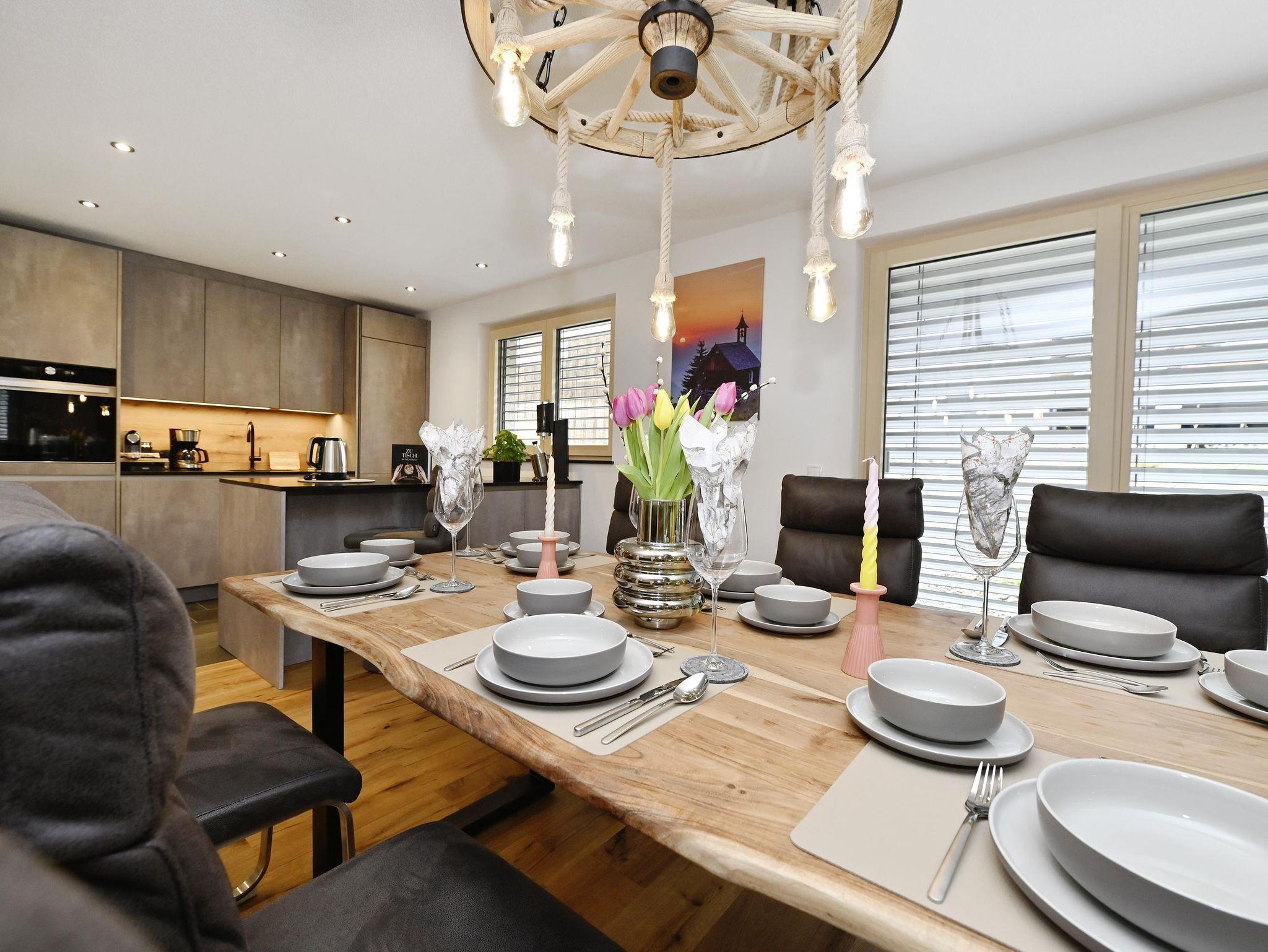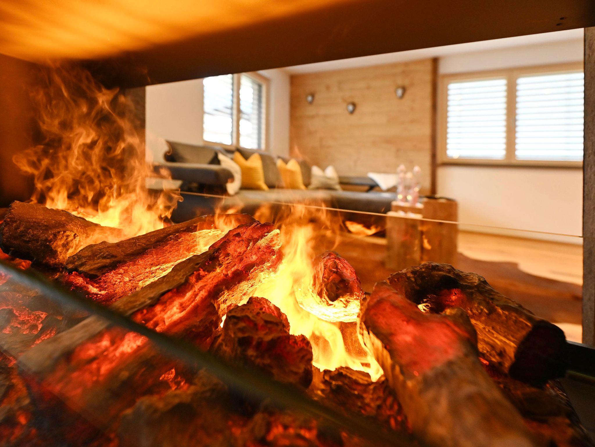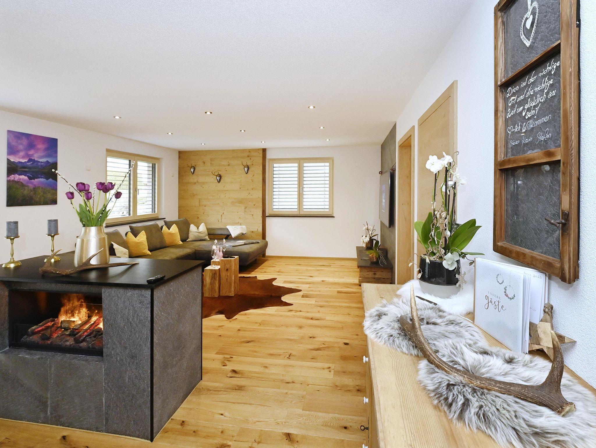 2 Schlafzimmer mit Doppelbetten (1 x zusätzliches Stockbett) und jeweils TV, 2 x Wellnessduschen und WCs, zusätzliches Gäste-WC, Wohnzimmer mit Ess- und Sitzbereich, voll ausgestattete Küche, E-Kamin, 65 Zoll TV, Ski- und Trockenraum mit Schuhtrockner, Feuerschale und Sitzplatz im Freien