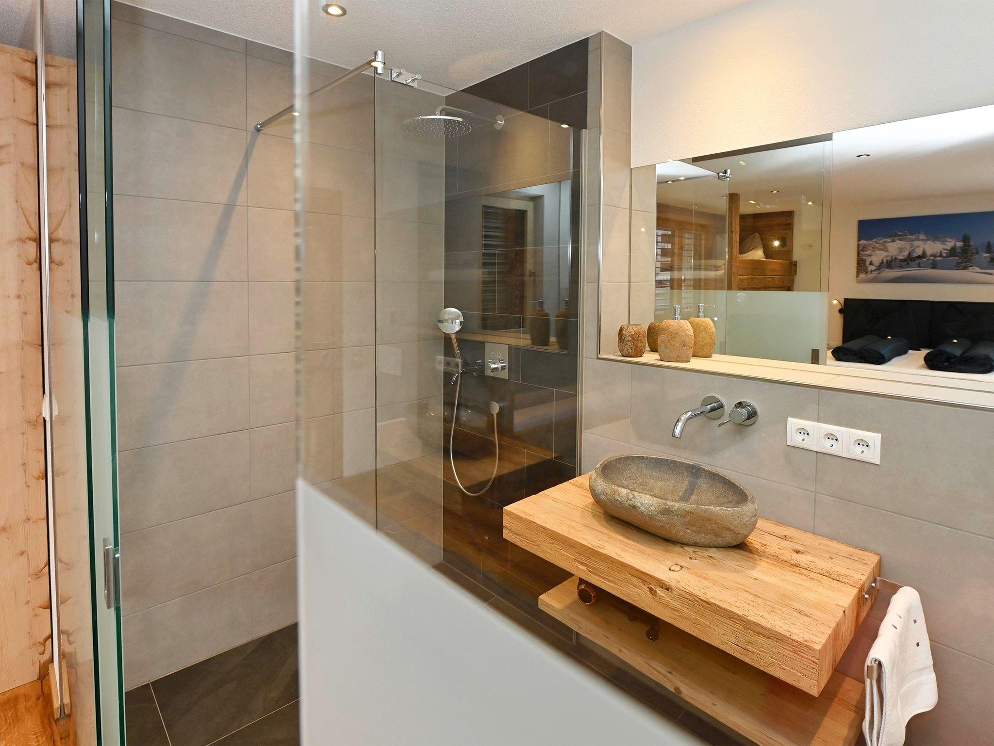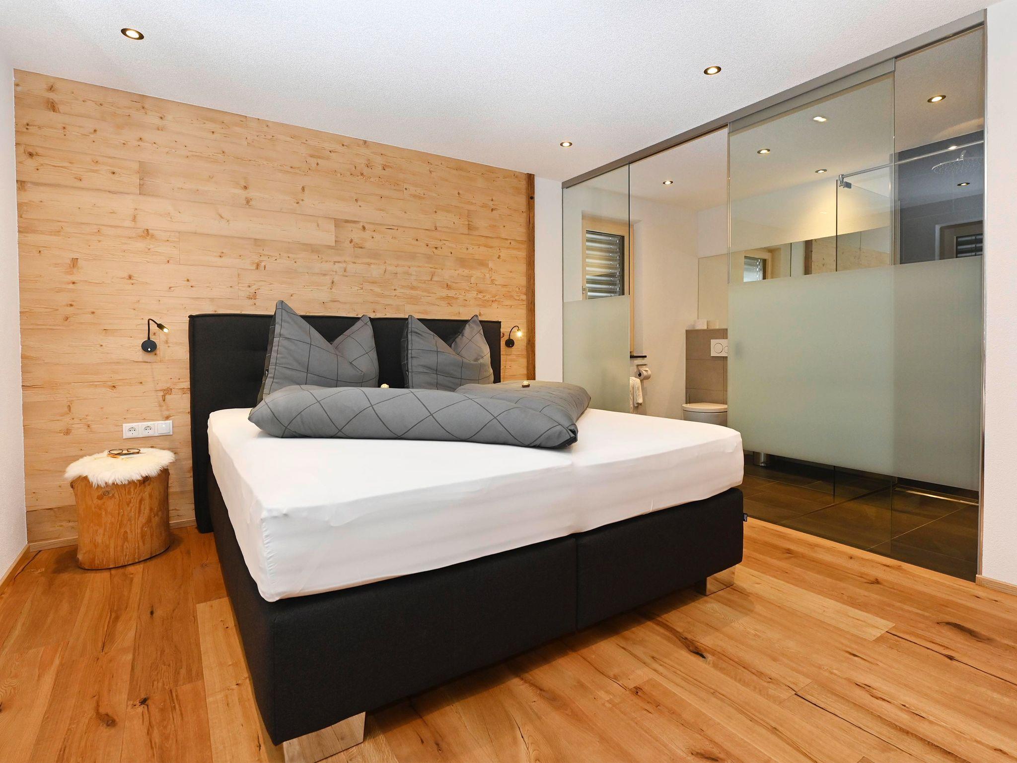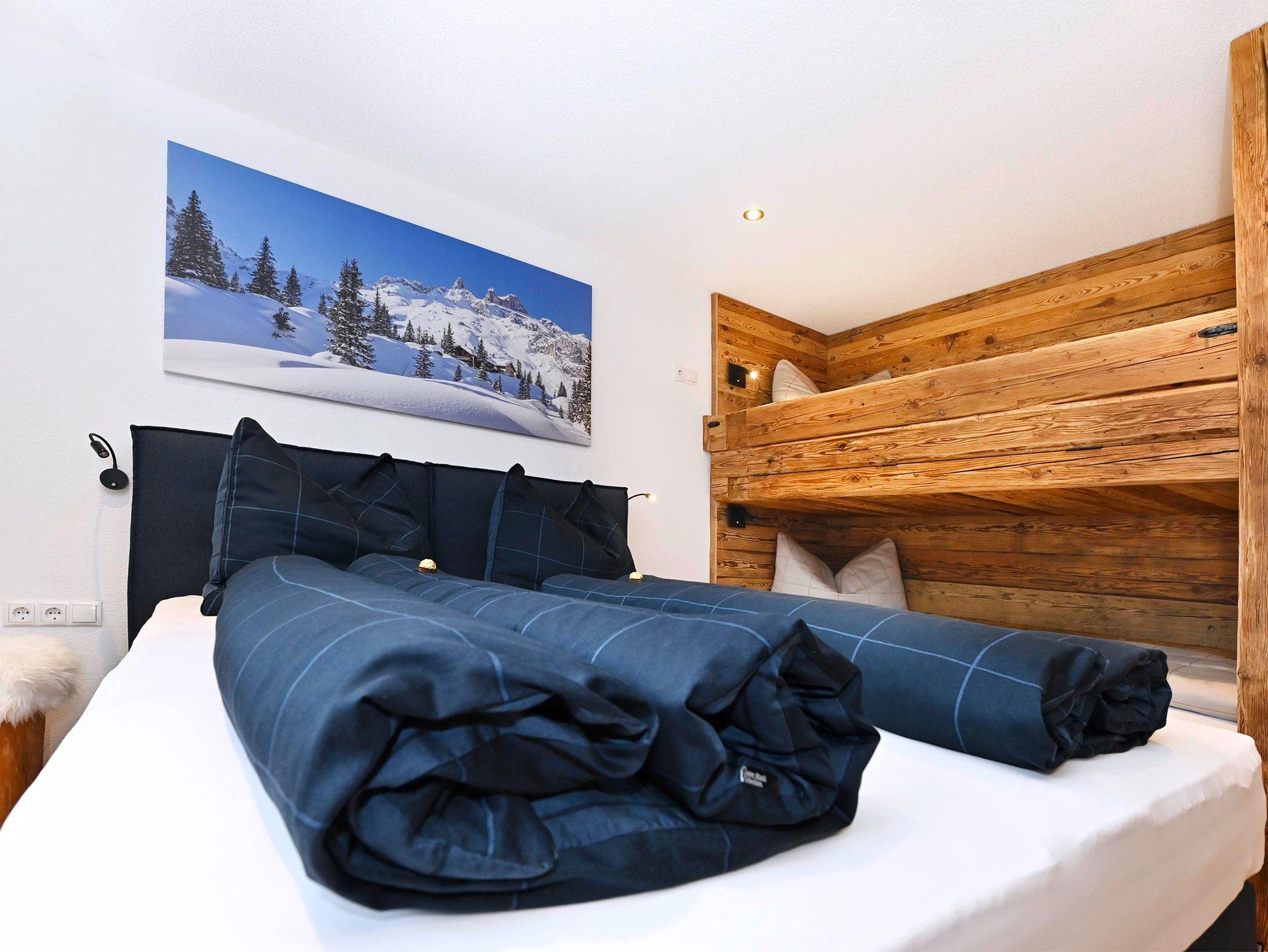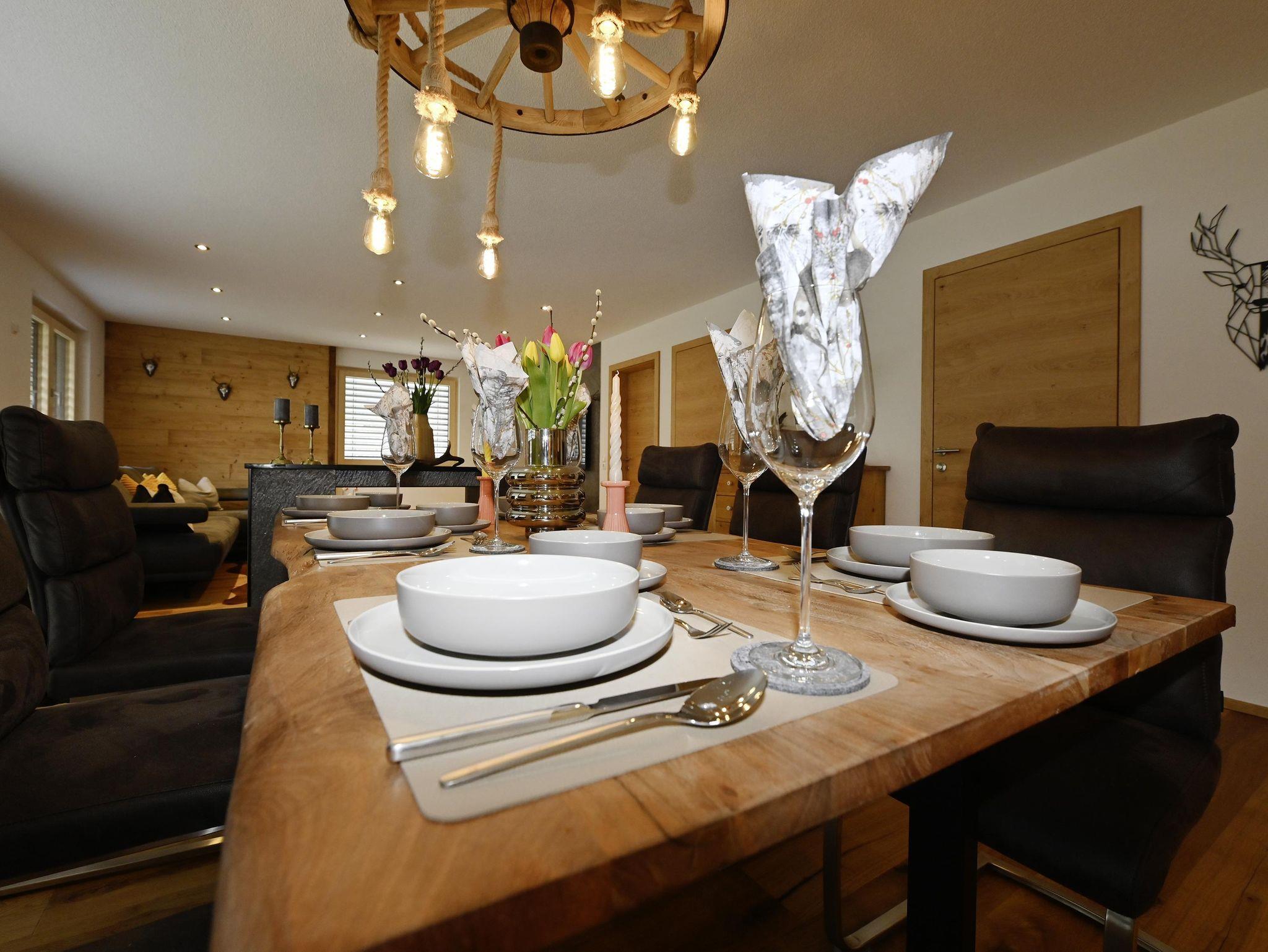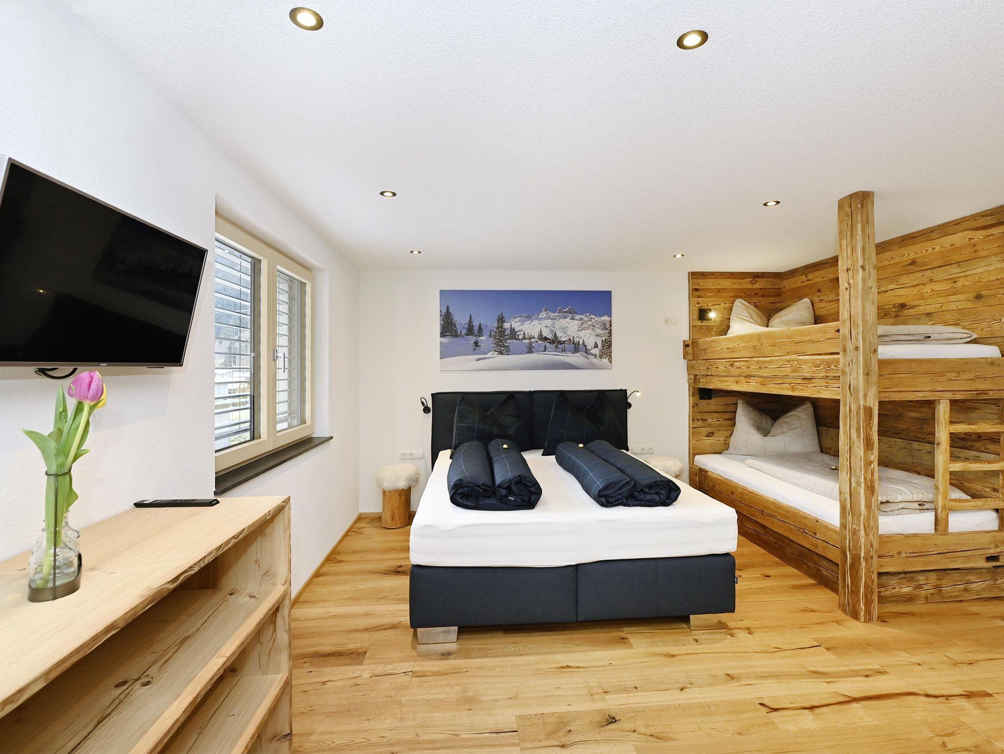 2 Schlafzimmer mit Doppelbetten (1 x zusätzliches Stockbett) und jeweils TV, 2 x Wellnessduschen und WCs, zusätzliches Gäste-WC, Wohnzimmer mit Ess- und Sitzbereich, voll ausgestattete Küche, E-Kamin, 65 Zoll TV, Ski- und Trockenraum mit Schuhtrockner, Feuerschale und Sitzplatz im Freien