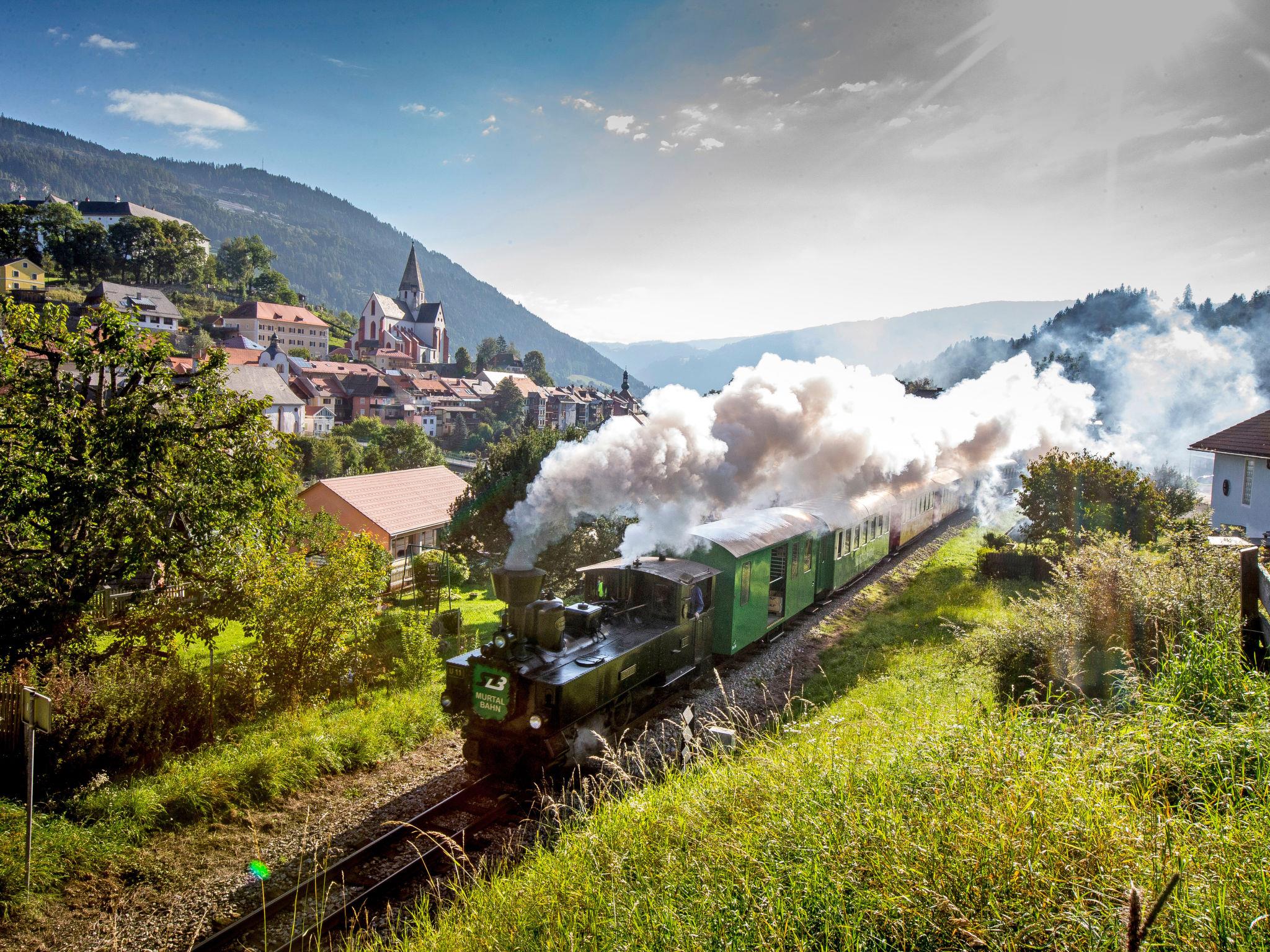 Cosy, comfortable resort "Kreischberg". Below St. Georgen, in a sunny position, 500 m from the skiing area, 50 m from the river. For shared use: park with lawn for sunbathing, biotope, indoor pool heated (9 x 13 m, pool opening hours: 08:00-20:00). In the complex: reception, restaurant, bar, breakfast room, WiFi, sauna, relaxation room, spa area, table tennis, sun terrace, central heating system, washing machine (for shared use, extra). Breakfast and half board possible. Central parking spaces. Grocery 1 km, restaurant 100 m, café, railway station "Murtalbahn" 300 m. Chair lift 500 m, gondola lift, skisport facilities, slopes, ski rental 300 m, ski school, children's ski school, cross country ski track 200 m. Nearby attractions: Bierstadt Murau 8 km. Well-known ski regions can easily be reached: Kreischberg 500 m. Well-known lakes can easily be reached: Badesee Stadl 10 km. Hiking paths: Frauenalpe 15 km, Stolzalpe 12 km. Please note: car-free holiday complex. Suitable for families, baby equipment (extra). The photo is just an example. All houses/apartments are individually designed/furnished. Sauna open daily from 3:00 pm until 8:00 pm. ATTENTION: SUMMER: Murtalcard included!