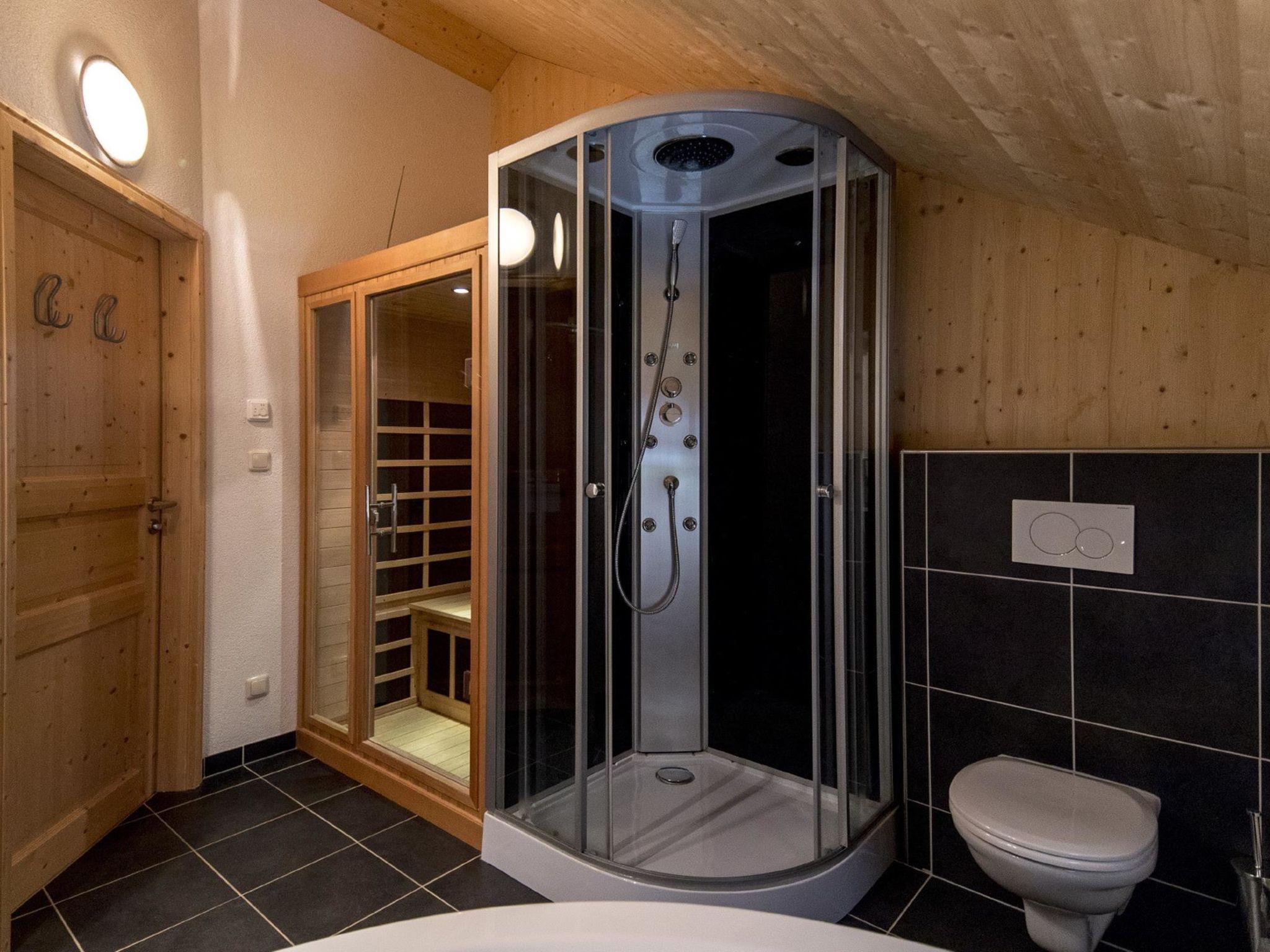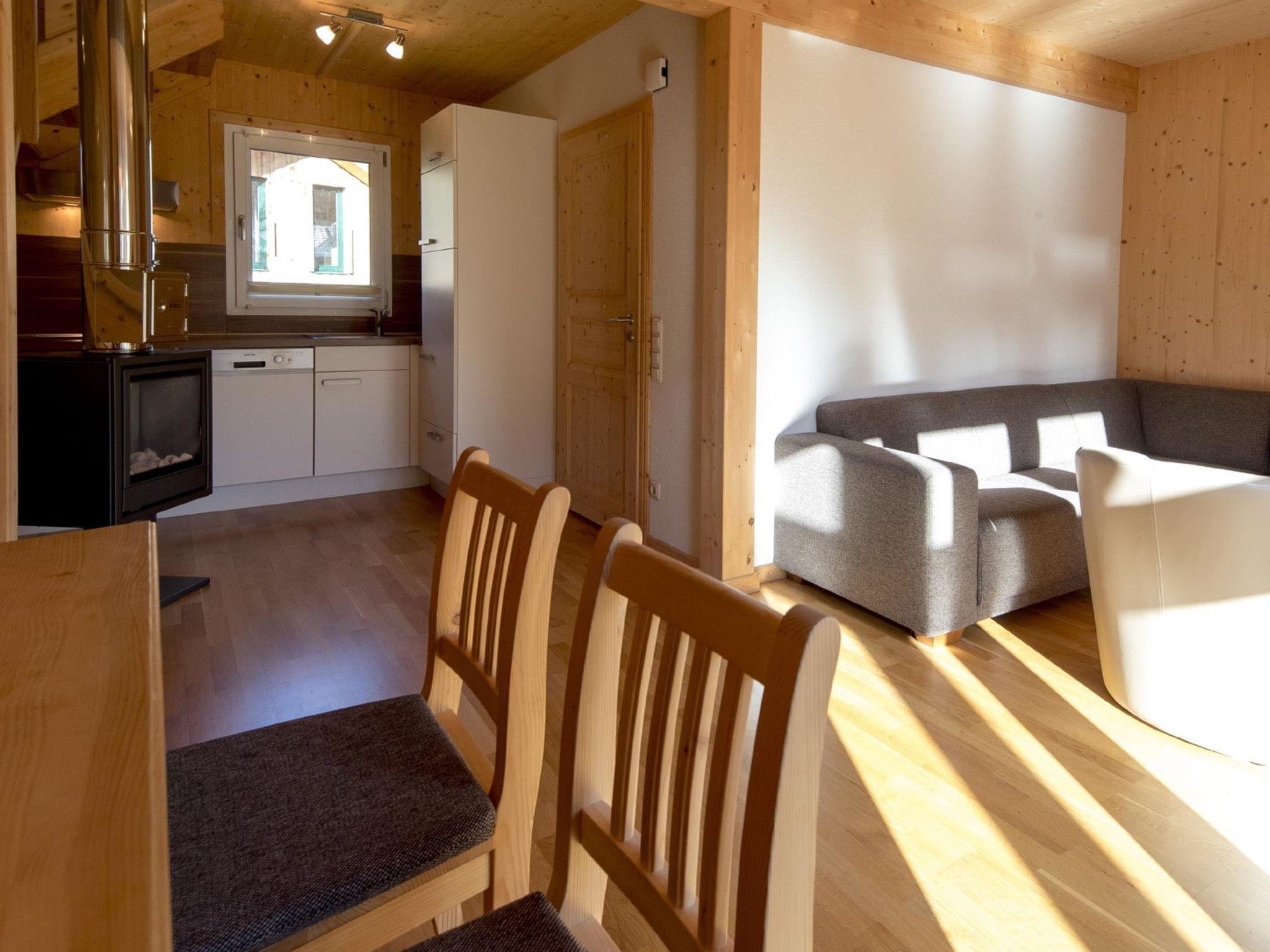 "Chalet mit 2 Schlafzimmern & IR-Sauna", 3-room chalet 70 m2 on 2 levels. Bright, comfortable and wooden furniture furnishings: entrance hall. Living/dining room with dining table and satellite TV (flat screen). 2 double bedrooms. Open kitchen (oven, dishwasher, 4 ceramic glass hob hotplates, microwave, electric coffee machine). Shower/WC, hydro massage shower, Sauna. Balcony, terrace. Very beautiful view of the mountains, the ski run and the countryside. Facilities: Internet (WiFi, free). Please note: non-smoking house. Smoke alarm. The property is one of a type of property or apartment. The chalets are individually furnished. The equipment of the saunas can therefore differ between an infrared sauna and a Finnish sauna.