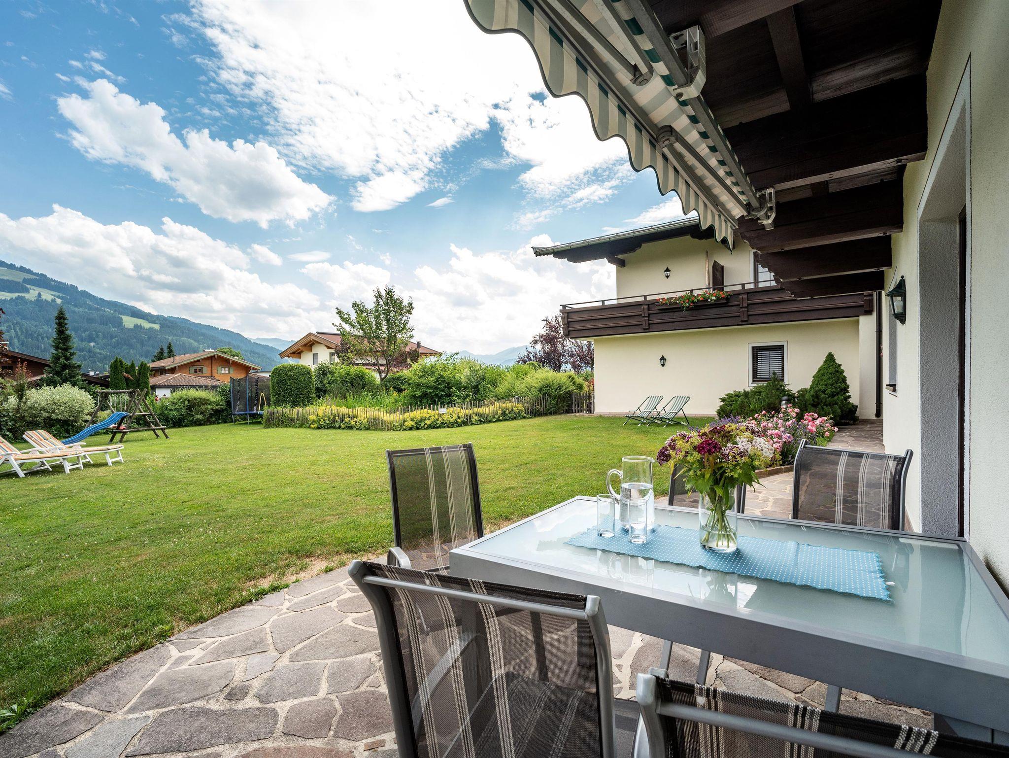 Highlight: Sonnige, ruhige Terrasse mit Blick auf das Kitzbüheler Horn – perfekt zum Krafttanken. WLAN und 1 überdachter Parkplatz inklusive.