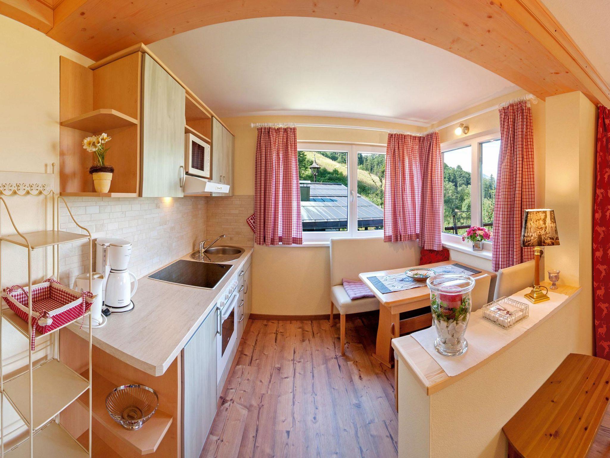 Das neu renovierte, sonnseitig ausgerichtete Ein-Zimmer Appartement „Sport“ für 2 Erwachsene und 2 Kinder verfügt über eine abgegrenzte Küche mit großer Sitzecke und einen überdachten Südbalkon mit Morgensonne. Der Wohn-/Schlafraum mit wunderbarem Kaiserblick erfüllt Urlaubsträume.