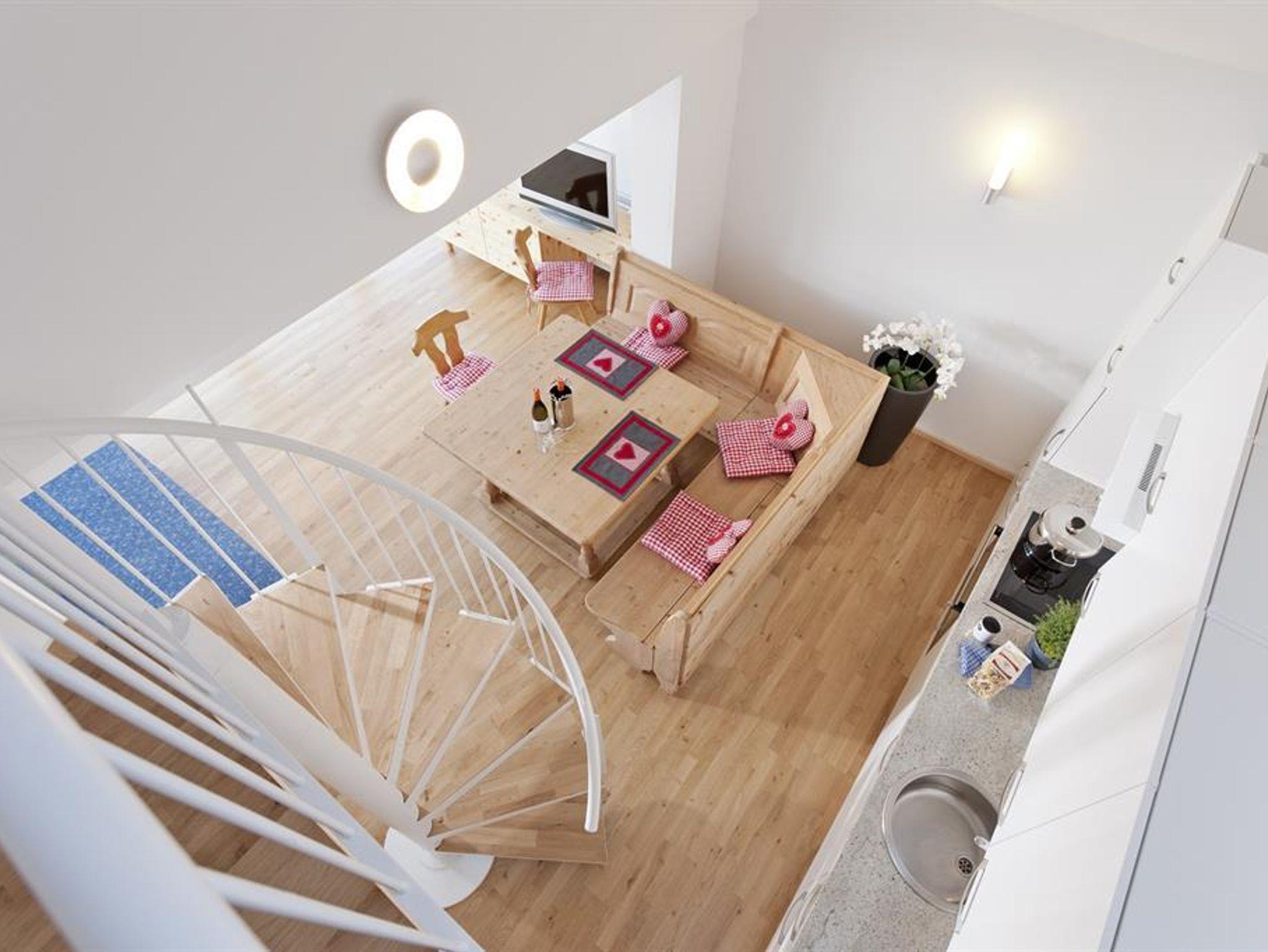 Über zwei Etagen, mit Wendeltreppe. In der Grundetage Küche (Backofen!)und Wohnraum mit gemütlicher Sitzecke und einem Sofa,Schlafzimmer mit Doppelbett und Einzelbett,Badezimmer mit Badewanne.Obere Etage: Schlafzimmer mit Doppelbett.