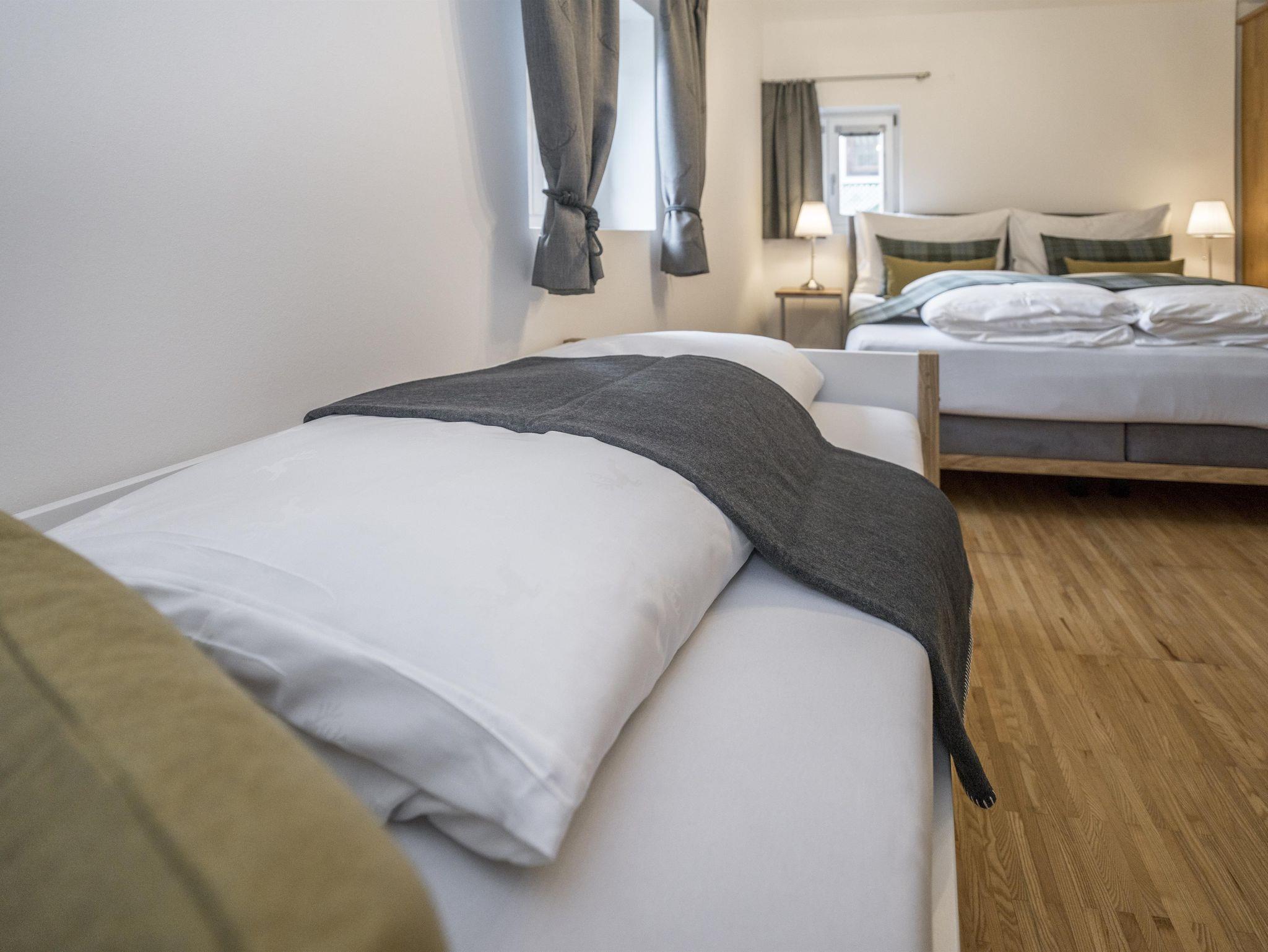 • Familienschlafzimmer: Ausgestattet mit einem Doppelbett, einem ausziehbaren Kinderbett und einer gemütlichen Couch