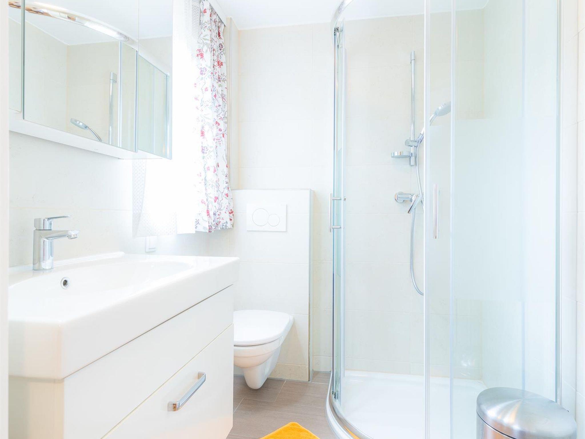 Sie befindet sich im zweiten Stockwerk und verfügt über einen kombinierten Wohn-/Schlafraum mit Doppelbett, ein Zimmer mit 2 getrennten Betten, Wohnküche, neues Bad, und einem Autounterstellplatz.