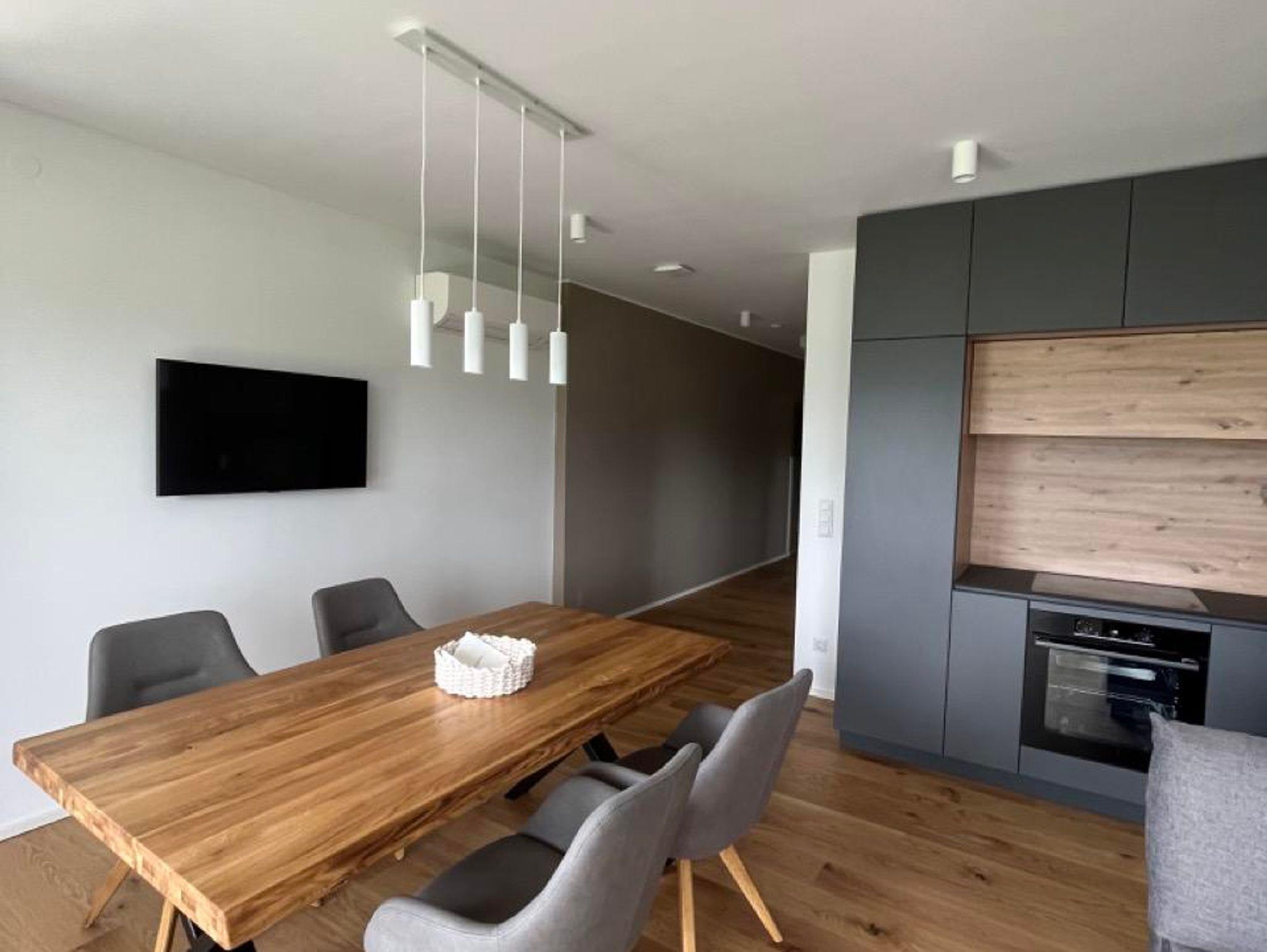 Der Wohnraum besticht mit seiner großen Glasfront, die direkt auf die Terrasse führt. Im Wohnraum befindet sich eine moderne Küche, ausgestattet mit Kühlschrank, Gefrierfach, Ceranfeld, Backrohr, Geschirrspüler, Spüle, Kaffeemaschine und Wasserkocher. Die Küche enthält ein vollständiges Besteck- und Geschirrservice. Der Esstisch, für bis zu 4 Personen, ermöglicht einen einzigartigen Ausblick auf den See während dem Essen. Zum Entspannen lädt die große Couch mit Fernseher ein. Bei mehr als 2 Personen, finden bis zu 2 weitere Personen auf der gemütlichen Ausziehcouch Platz.