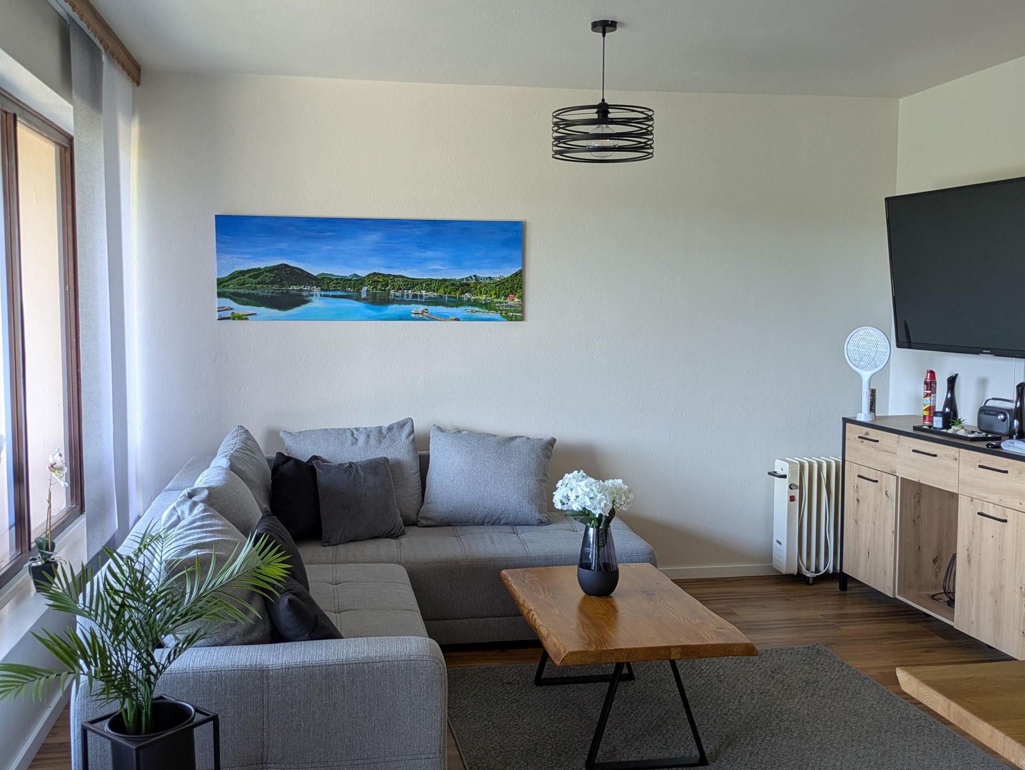 Im Wohnzimmer wird Anfang Juni 2024 noch ein neuer geräuscharmer Vinylboden verlegt. Neben einer modernen Couch (inkl. Schlaffunktion für einen möglichen 5ten Gast) haben (mit dem Couch- und Esstisch) zwei Echtholztische Einzug in diesem gemütlichen Bungalow erhalten. Das handgemalte Panoramabild vom Klopeiner See oberhalb der Couch rundet die Wohlfühlatmosphäre im Wohnzimmer entsprechend ab.