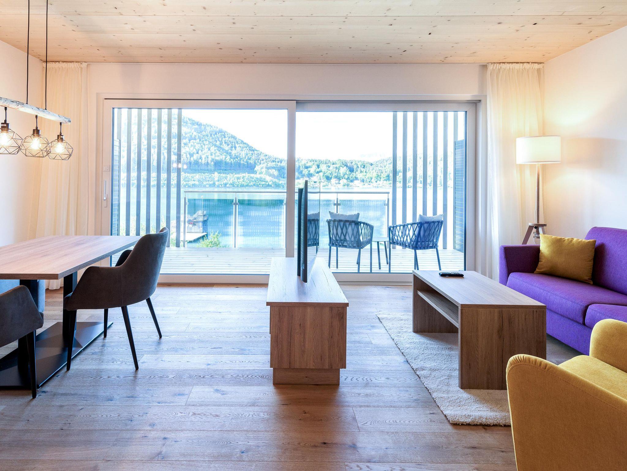 Dieses Appartement im 3. Stock bezaubert mit einem großartigen Panoramablick auf den See und der Bergwelt Südkärntens. Auf rund 55m2 Wohnfläche mit einer ca. 45m2 großen Balkonterrasse genießen Sie Ihren Aufenthalt am Klopeiner See das ganze Jahr über. Die exklusive Ausstattung der Ferienwohnung lässt keine Wünsche offen: Hochwertige Einrichtung mit einer modernen Küchenzeile, großem Flat-TV, WLAN, Klimaanlage, Bodenheizung, Parkettboden und vieles mehr. Die Wohnung verfügt über ein extra Schlafzimmer und eine ausziehbare Schlafcouch und ist auch optimal für bis zu 4 Personen bewohnbar.