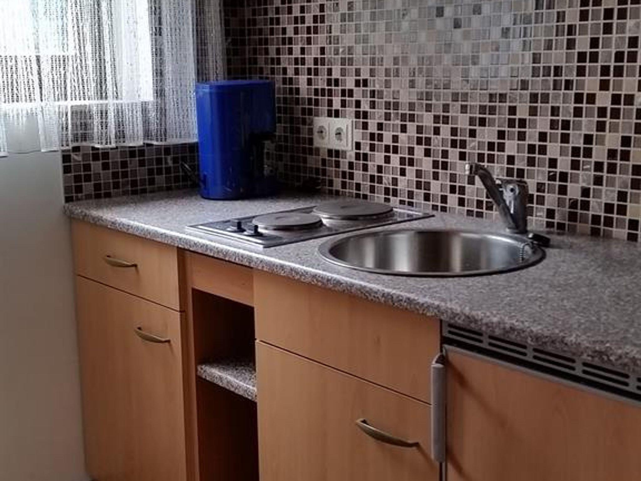 • mit Spüle, 2er Kochplatte und Kühlschrank, Geschirr, Kaffeemaschiene usw.