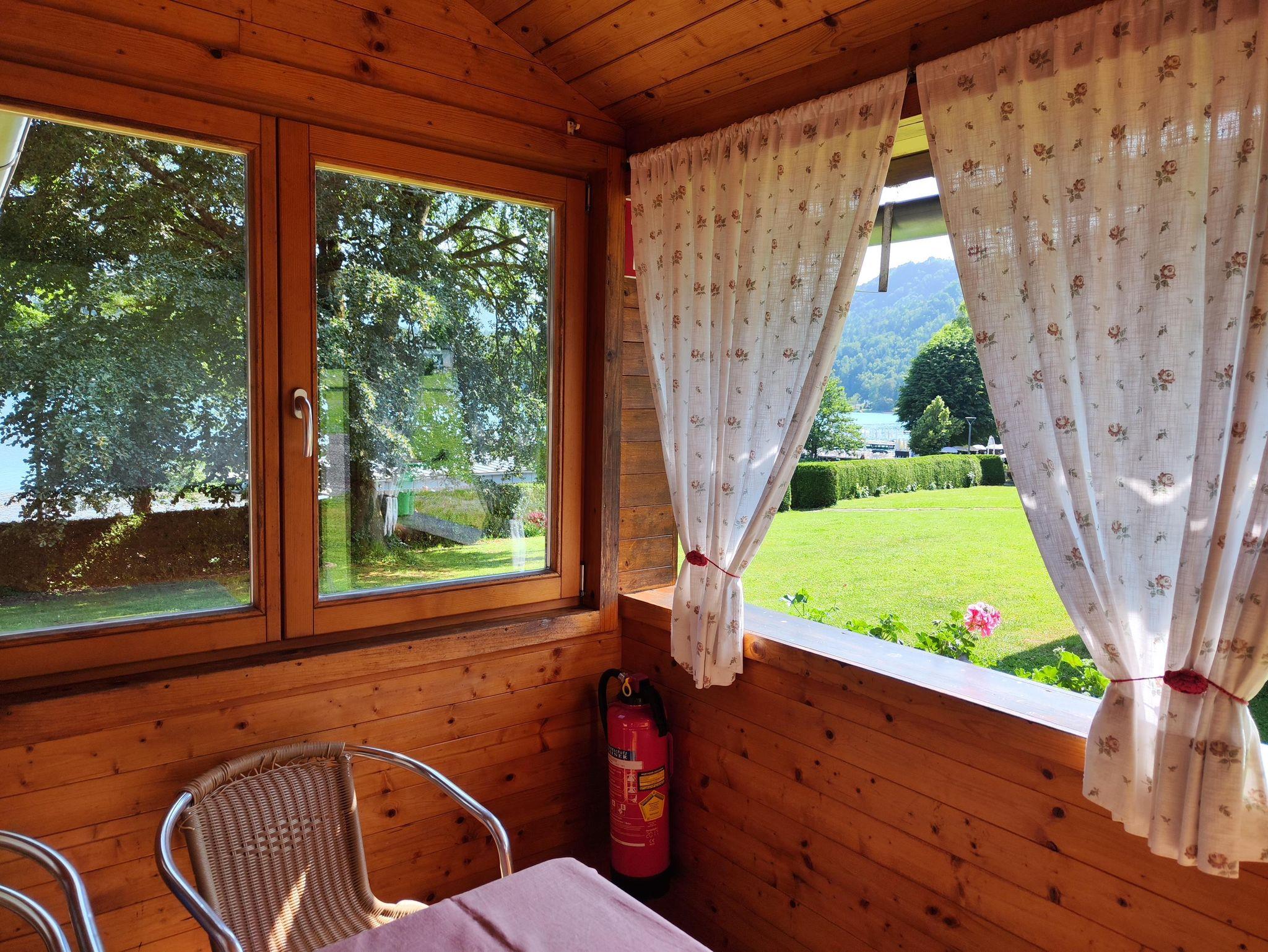 Die überdachte, 6 m² große Veranda mit Seeblick ist der ideale Ort für ein Frühstück mit Seeblick.