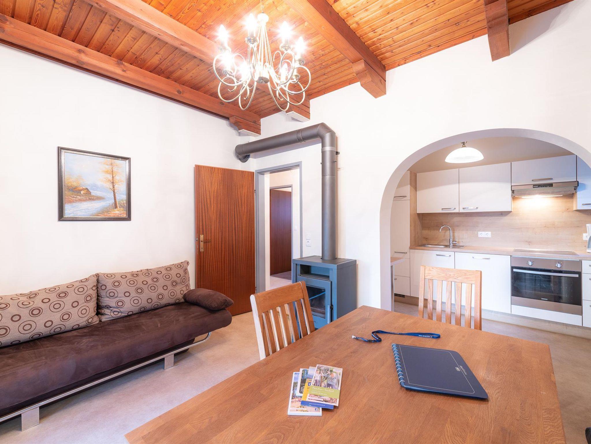 In der Wohnküche finden Sie eine Sitzecke, Ausziehcouch, Flat-TV, Schwedenofen und eine komplett ausgestattete Küche mit Geschirrspüler, Backofen, Herd, Kühlschrank, Besteck, Geschirr und einer Kaffeemaschine.