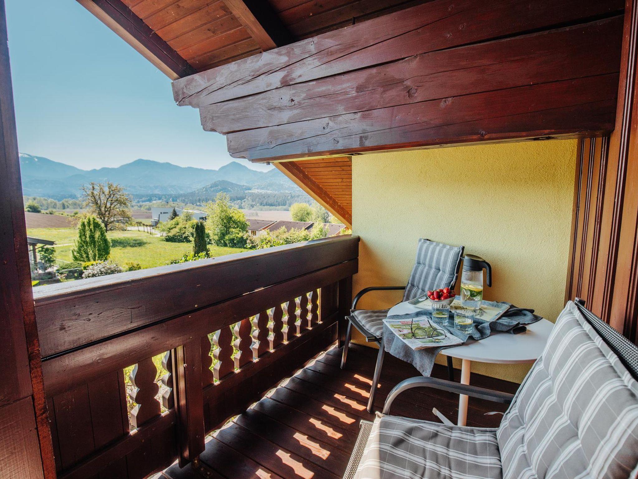 Die Ferienwohnung ist 46m² groß, bietet Platz für 4 Personen und beinhaltet zwei getrennte Schlafzimmer. Ein Schlafzimmer verfügt über ein Doppelbett mit Zugang zu einem eigenen Balkon, das zweite über ein Doppelbett. Weiters gibt es ein Wohnküche mit einer Essecke und eine Dusche mit WC. Die Wohnung verfügt zusätzlich über eine Sat/TV Anlage, Geschirrspüler, Kaffeemaschine, Küchenutensilien, Geschirr-, Handtücher und Bettwäsche. Sie liegt im 1.OG und ist an eine Dachterrasse angeschlossen, welche Sitzmöglichkeiten sowie einen Blick über den Turnersee und die Karawanken bietet.
