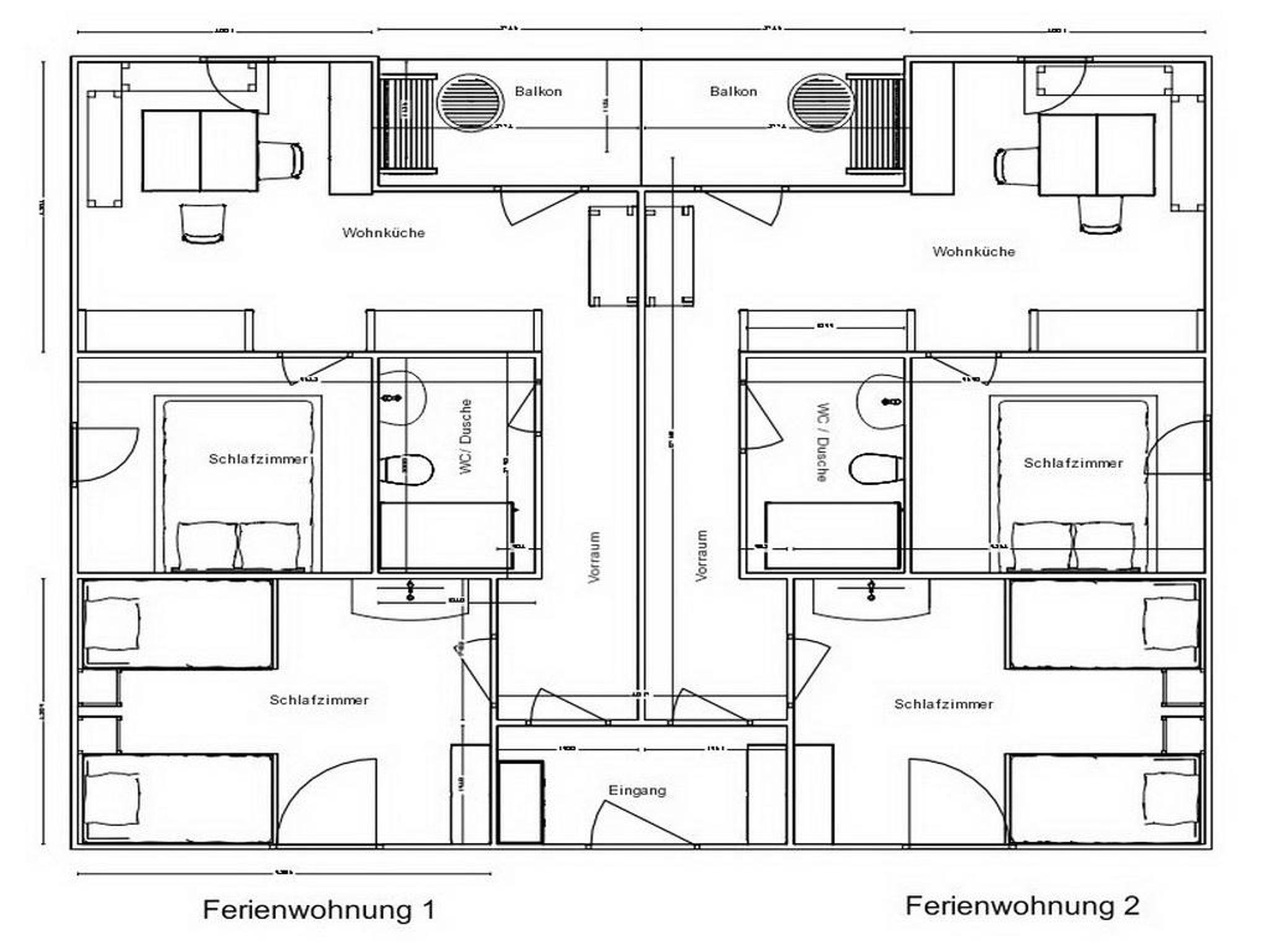 Die Ferienwohnungen verfügen über zwei Schlafzimmer, einen offenen Wohn- und Essbereich, einen Balkon und ein Badezimmer.
