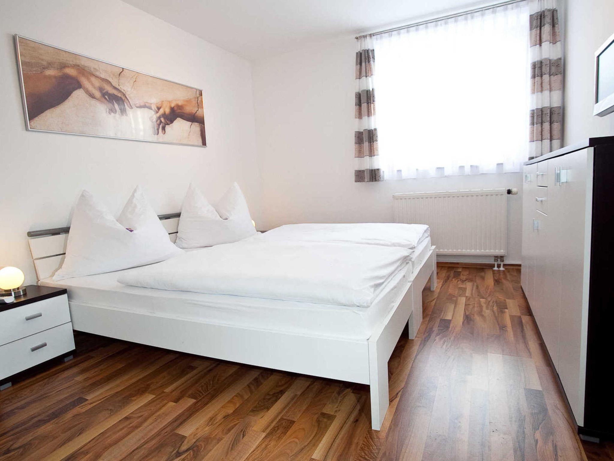 +Schlafzimmer Nr.1 ist mit 2 Betten, einen Flachbildfernseher, Kleiderkasten und Nachtkästchen ausgestattet,