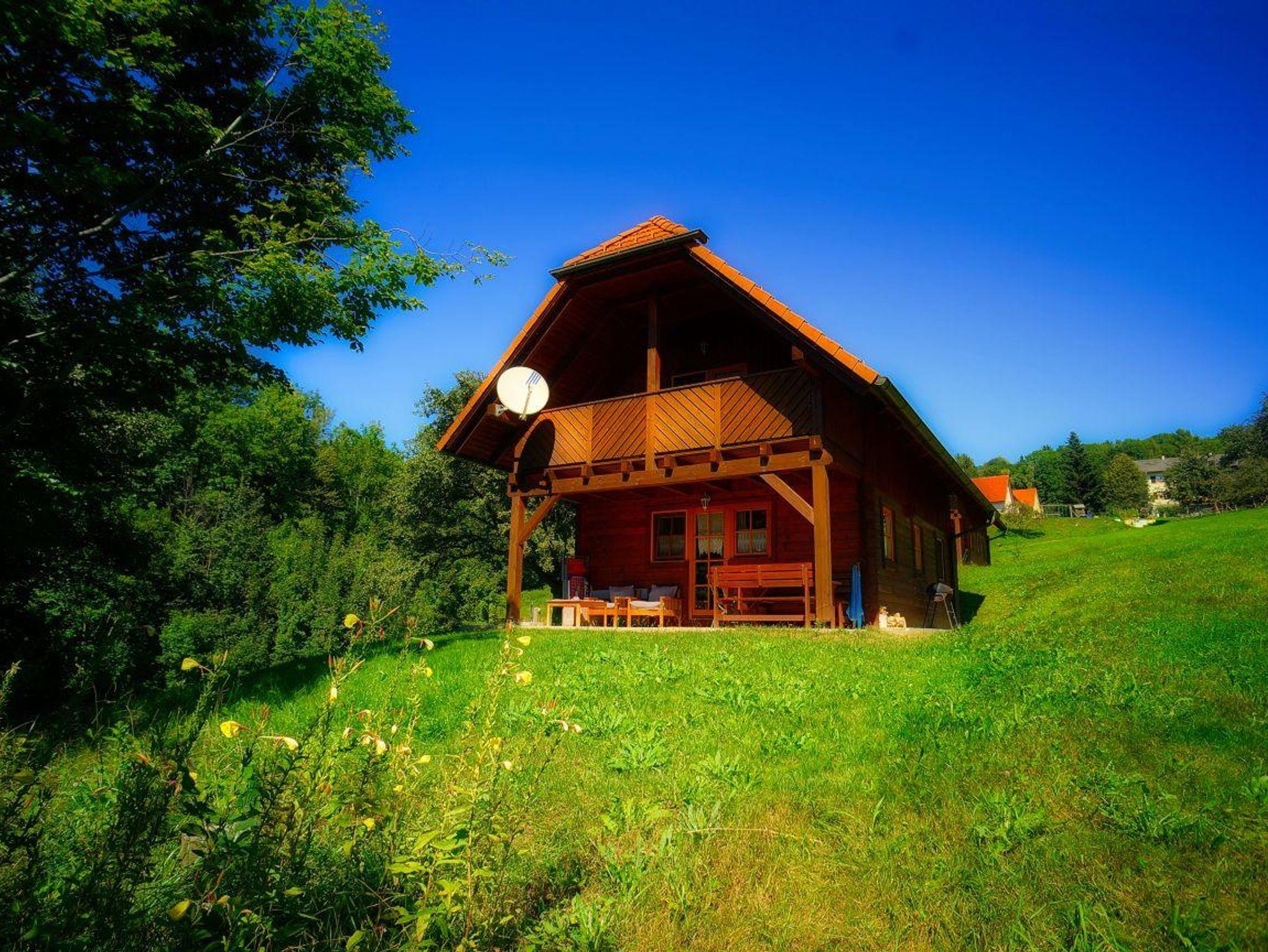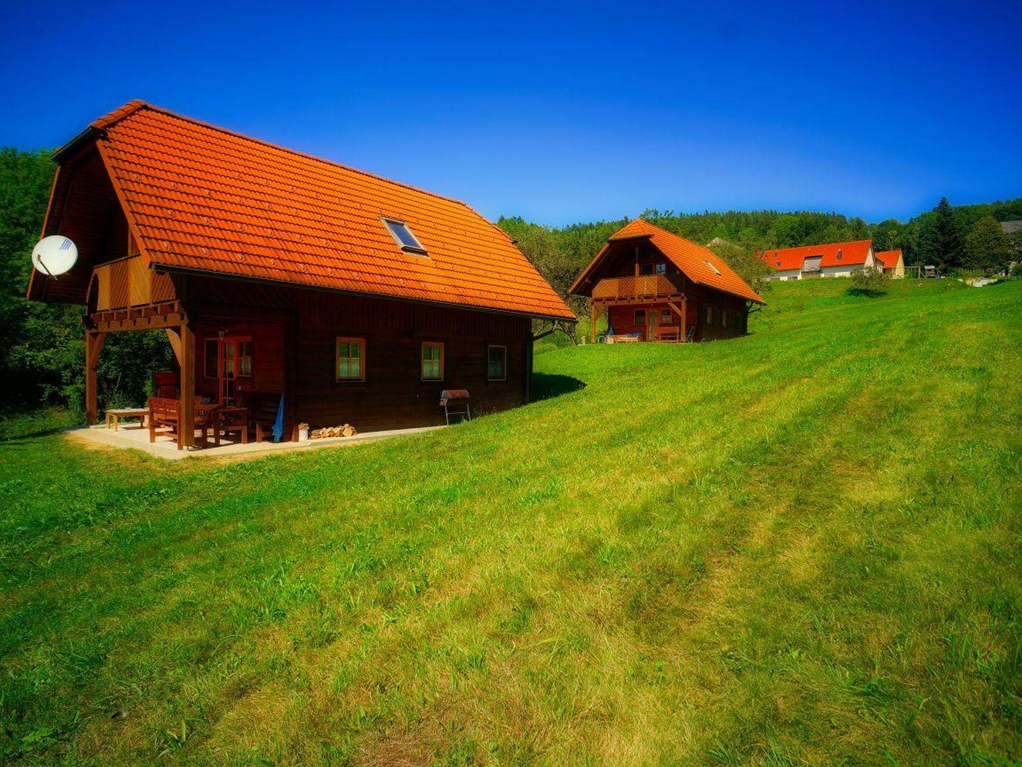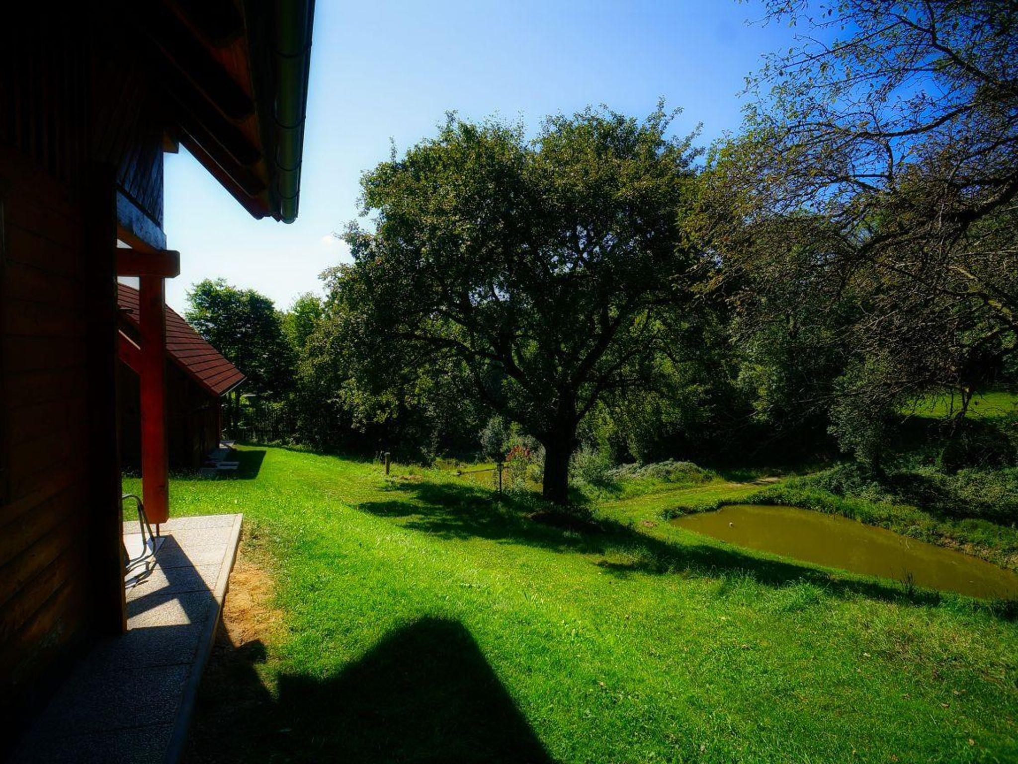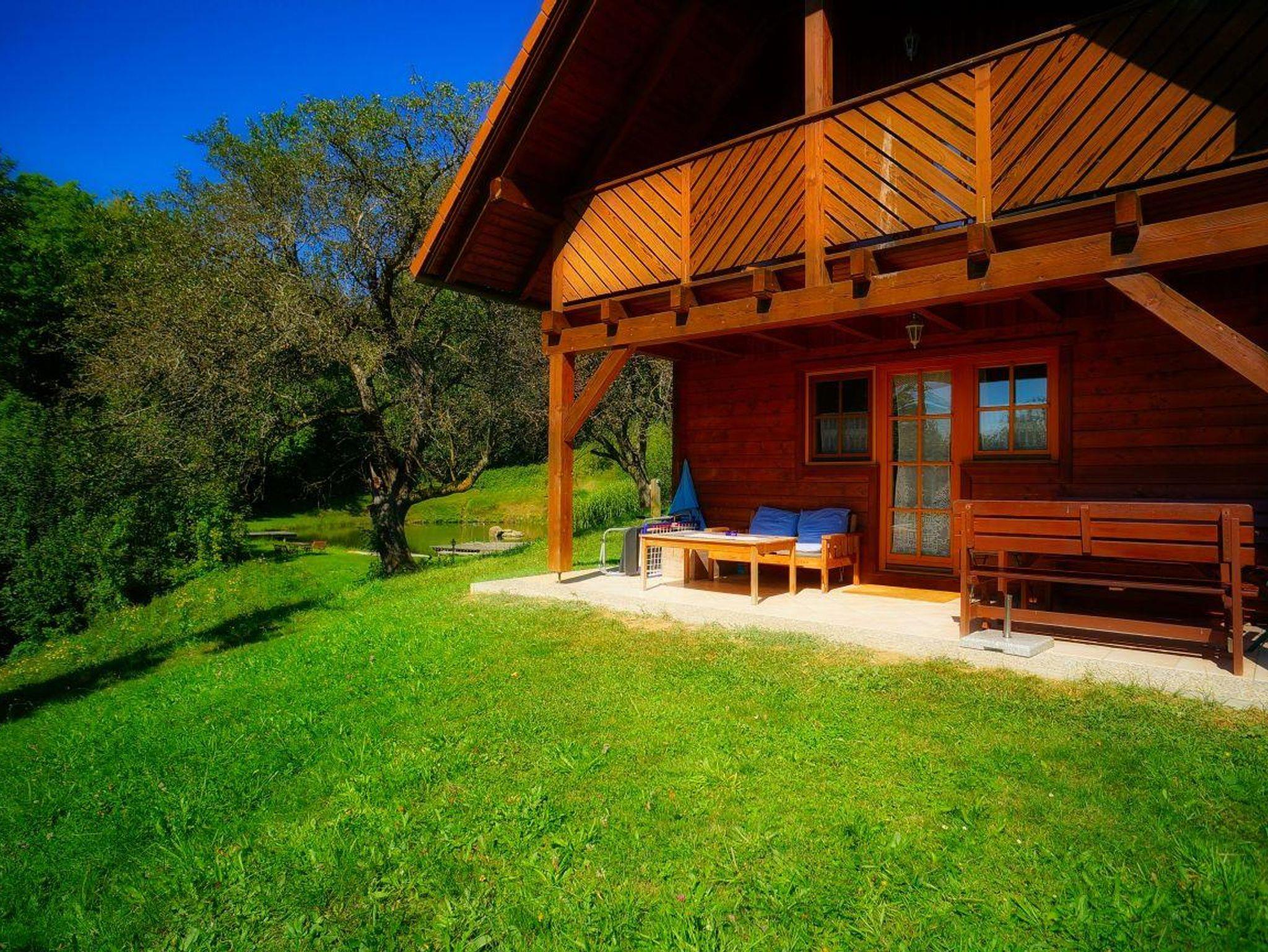 2 Holzblockhäuser neben privatem Badeteich für bis zu 8 Personen.